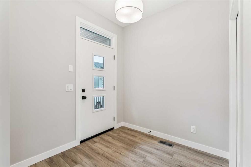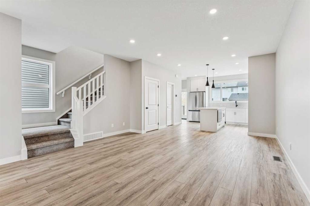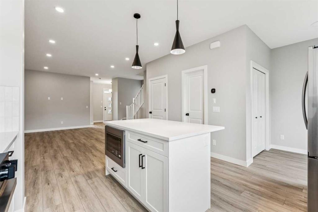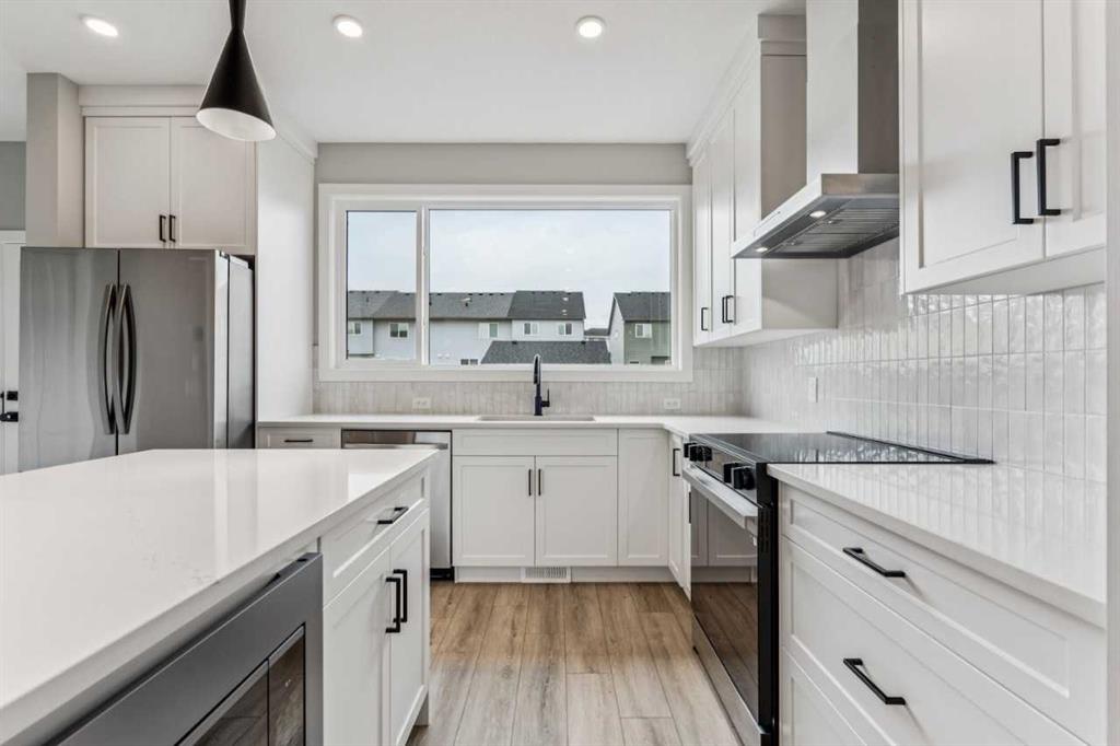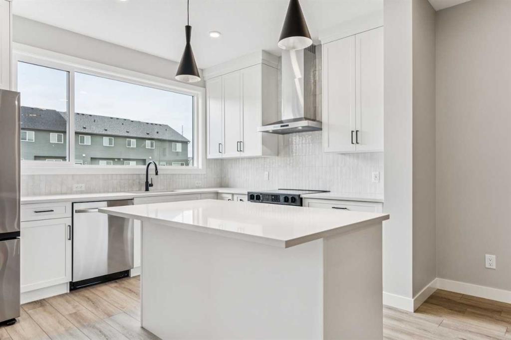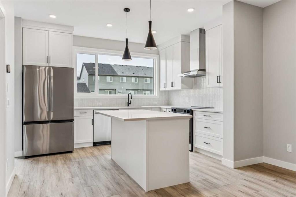 The Lucca by Cardel Homes, a Premium Paired home at 1,814 sq. ft. of well-designed living space. Its farmhouse-inspired exterior features Hardie board and vinyl siding, black-framed windows, and a modern, open-concept layout. The interior boasts luxury vinyl plank flooring throughout the main floor, upper-floor loft, and hallway, creating a cohesive feel. The rear-facing kitchen overlooks the backyard and features Winter-stained maple cabinetry, quartz countertops, and Samsung stainless steel appliances. A chimney hood fan, large island, and picture window above the granite sink elevate both style and practicality. A functional back entry and walk-in pantry, ensures everyday convenience. At the front, a main-floor bedroom and full bath provide flexibility. Upstairs, the primary bedroom offers a dual-sink ensuite, while two additional bedrooms are separated by a loft space and a conveniently located laundry room. Cardel Homes offers better and design and quality. Photos are representative.