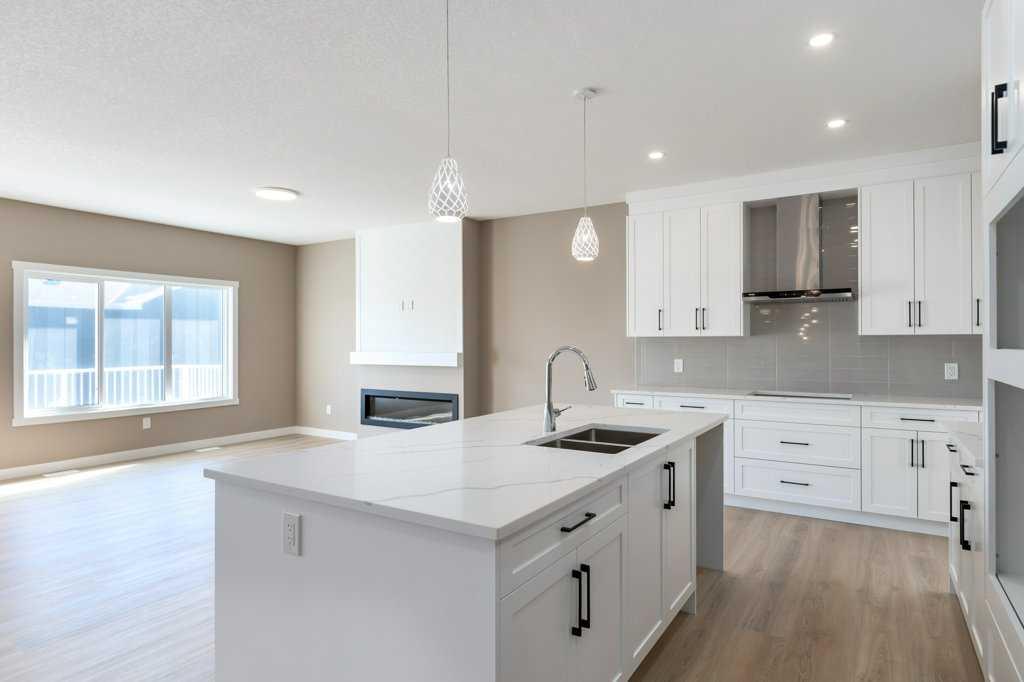 This is a brand new triple garage bungalow with a fully finished walkout basement. It is 1608 sq ft in a great area close to a beautiful waterway and park, and has premium finishes throughout. The main floor is a modern open plan with a wide entry hall, 9’ ceilings, high quality flooring, and a 25’ deck. The kitchen includes cabinets to the ceiling, quartz counters, under-mount sink, select tiles, and a large walk-in pantry. Also on the main floor is the spacious and open living / dining room, the primary bedroom, a laundry room, and a second bedroom or office. Deluxe appointments in the master suite include built in cabinetry in the walk-in closet, a double vanity, a freestanding soaker tub and a 6\' shower. The lower level has three more spacious bedrooms and a very big family room with a built-in wet bar, a full bathroom and patio doors to a shady covered patio. All rooms in this home have lots of natural light, and there are many extras including a 8’ island in the kitchen, two fireplaces, and a Hardie board exterior.