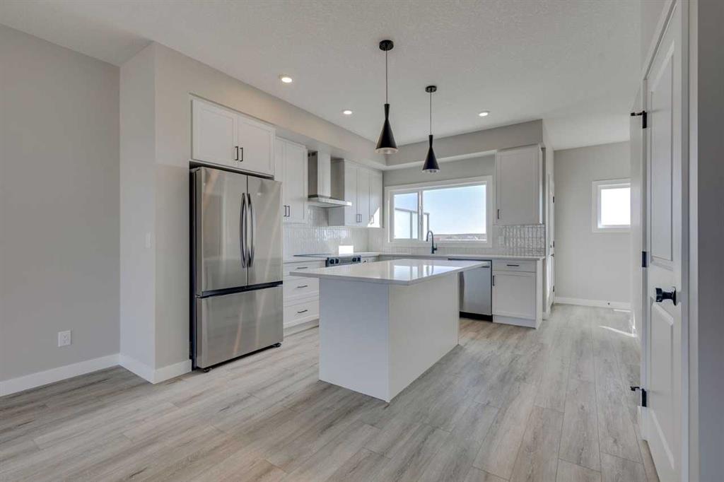 Discover the Eton, a move-in ready home in Chestermere with 1,490 sq ft of stylish living space. This craftsman-style home features Hardie board siding, black-framed windows, and an open-concept layout with luxury vinyl plank flooring. The rear-facing kitchen connects seamlessly to the backyard and includes Satin White cabinetry with black accents, quartz countertops, Samsung stainless steel appliances, a chimney hood fan, a large island, and a picture window above the granite sink. A functional back entry and walk-in pantry add convenience, while the front-facing great room is bright and inviting. Upstairs, the rear primary bedroom includes a dual-sink ensuite, complemented by upper-floor laundry and two additional bedrooms. Situated in Clearwater Park, one of Chestermere’s newest master-planned communities. Photos are representative.