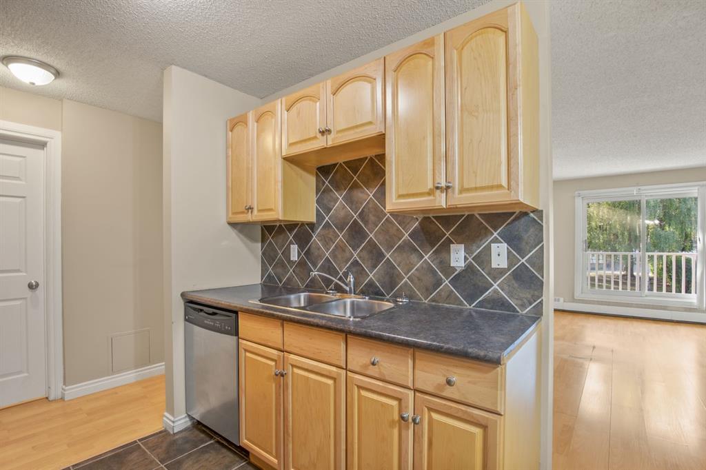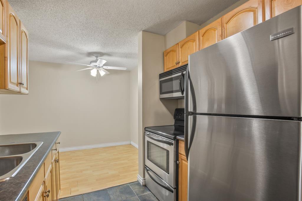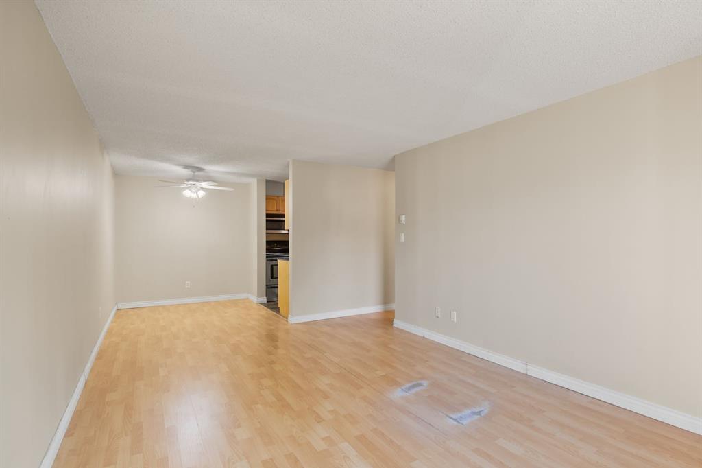 The functional layout features a kitchen with stainless steel appliances, including a built-in dishwasher, that flows easily into the dining area. The large living room is filled with natural light and opens through sliding glass doors to a spacious south-facing balcony overlooking a green space — perfect for relaxing or entertaining. A generous bedroom, full 4-piece bath, and in-suite storage complete the package.