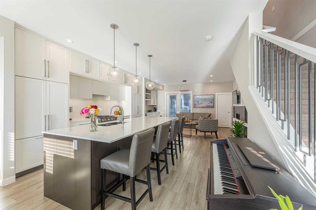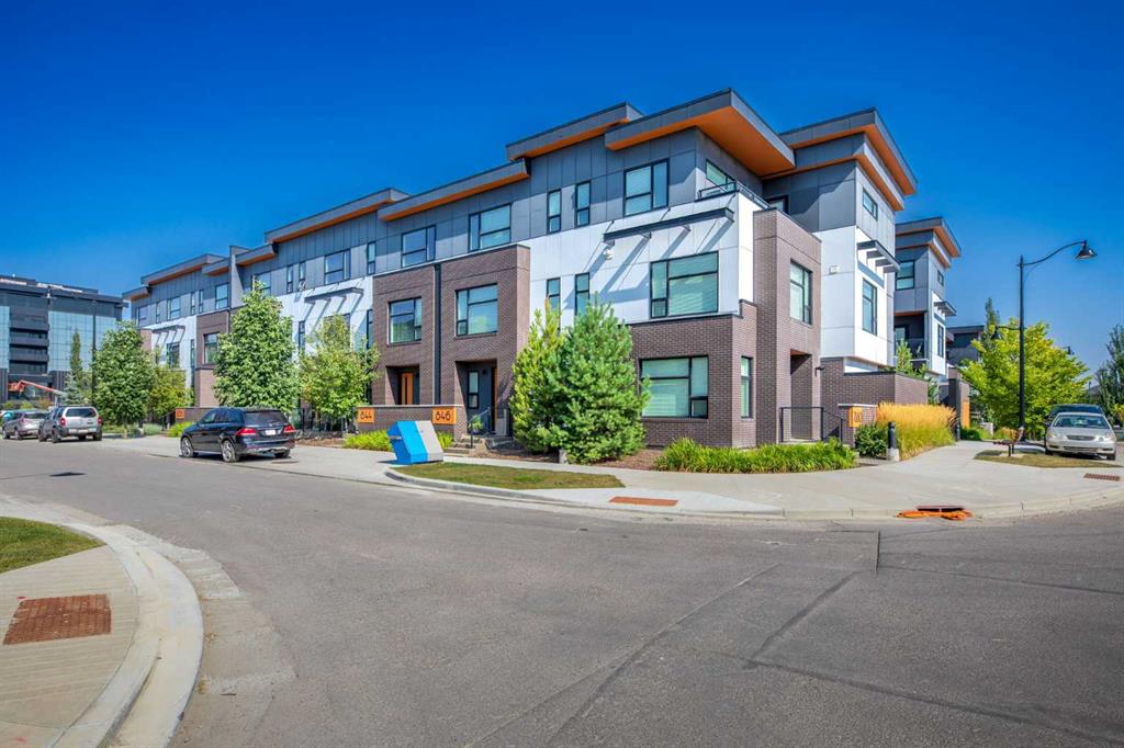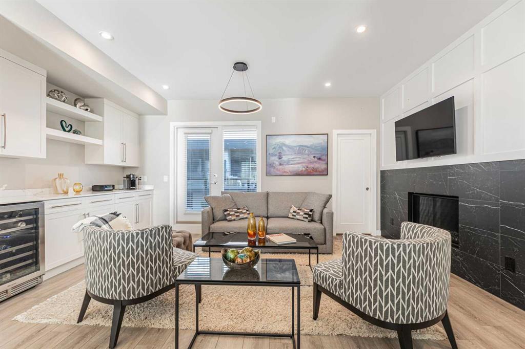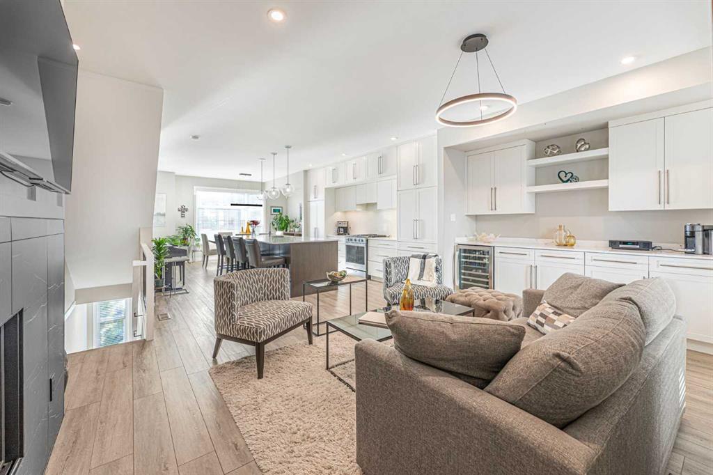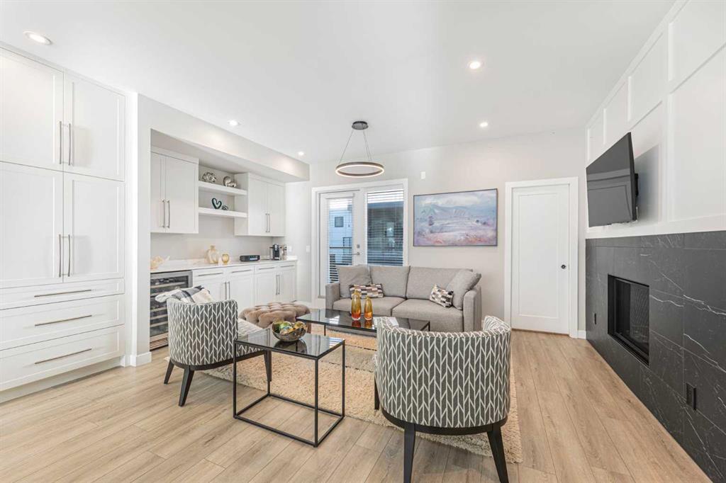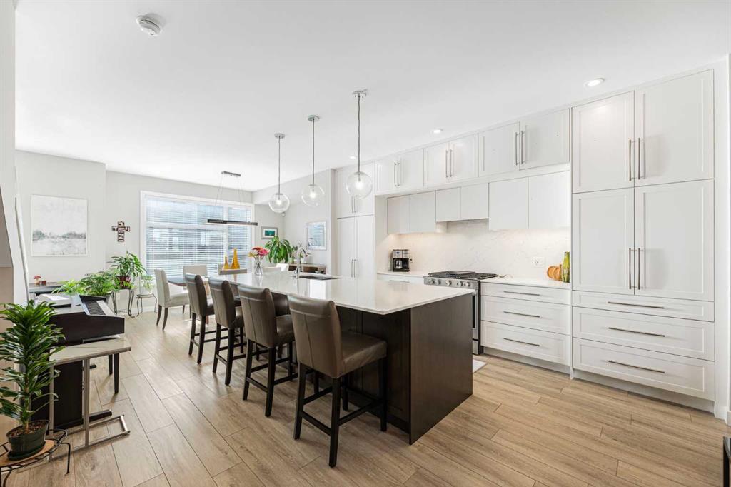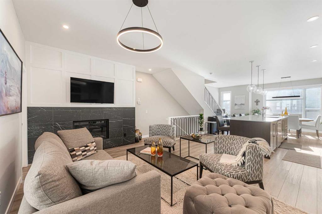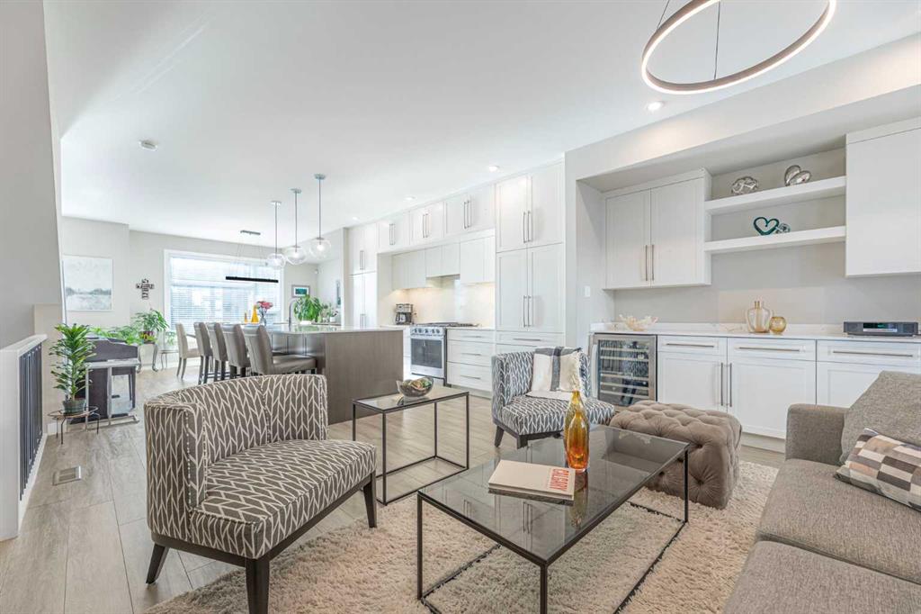 Welcome to this stunning original owner townhome located in the sought after West District in West Springs. This beautifully upgraded home offers a modern lifestyle with exceptional convenience and design. Step into a spacious entry foyer on the lower level, large enough to comfortably accommodate a home office, additional sitting area, or even exercise equipment. Thoughtfully designed with custom built-in cupboards for storage and direct access to the finished double attached garage, this space is both functional and versatile. The main level impresses with luxury vinyl plank flooring throughout, high ceilings, and an open-concept layout filled with natural light. The chef-inspired kitchen features full height cabinetry, deep storage in the oversized island, quartz countertops and backsplash, a gas range, and a built-in, integrated refrigerator for a sleek, modern finish. Adjacent to the kitchen is a built-in bar or coffee station with a wine fridge. The bright and spacious living room boasts a beautiful fireplace and opens onto a private balcony, perfect for relaxing. The generous dining area easily fits a large table, creating a seamless flow for both daily living and entertaining. Upstairs, you’ll find three well-appointed bedrooms and two full bathrooms. The primary suite is a luxurious retreat with a custom walk-in closet and a spa-inspired ensuite featuring a dual floating vanity and luxury shower. A convenient stacked laundry is also located on this level. Enjoy being part of a vibrant community, just steps from top-rated schools, shopping, dining, fitness centres, and everyday amenities. Radio Park, opening in September, is walking distance from your front door and will span 8.4 acres, offering year-round activities, pathways, and a dedicated dog park for residents to enjoy. With close proximity to Winsport, city parks, and quick access to Highway 1, you\'re minutes from the mountains or downtown Calgary.