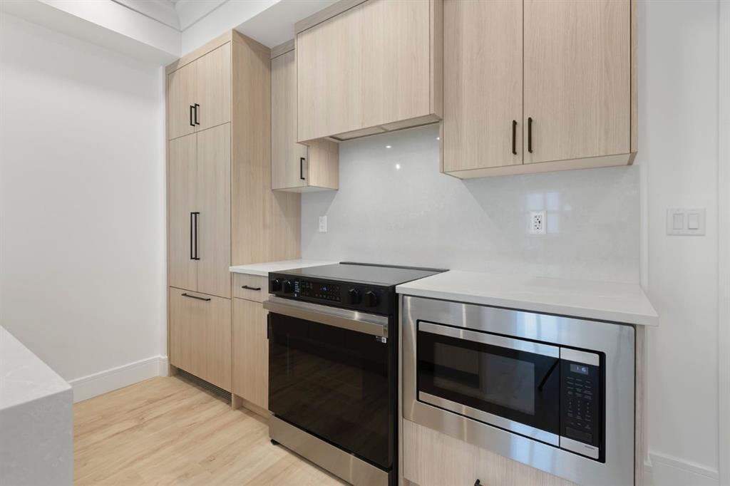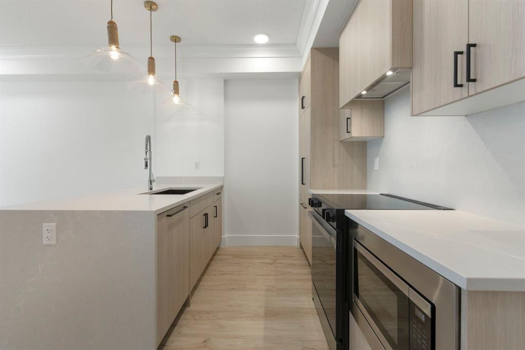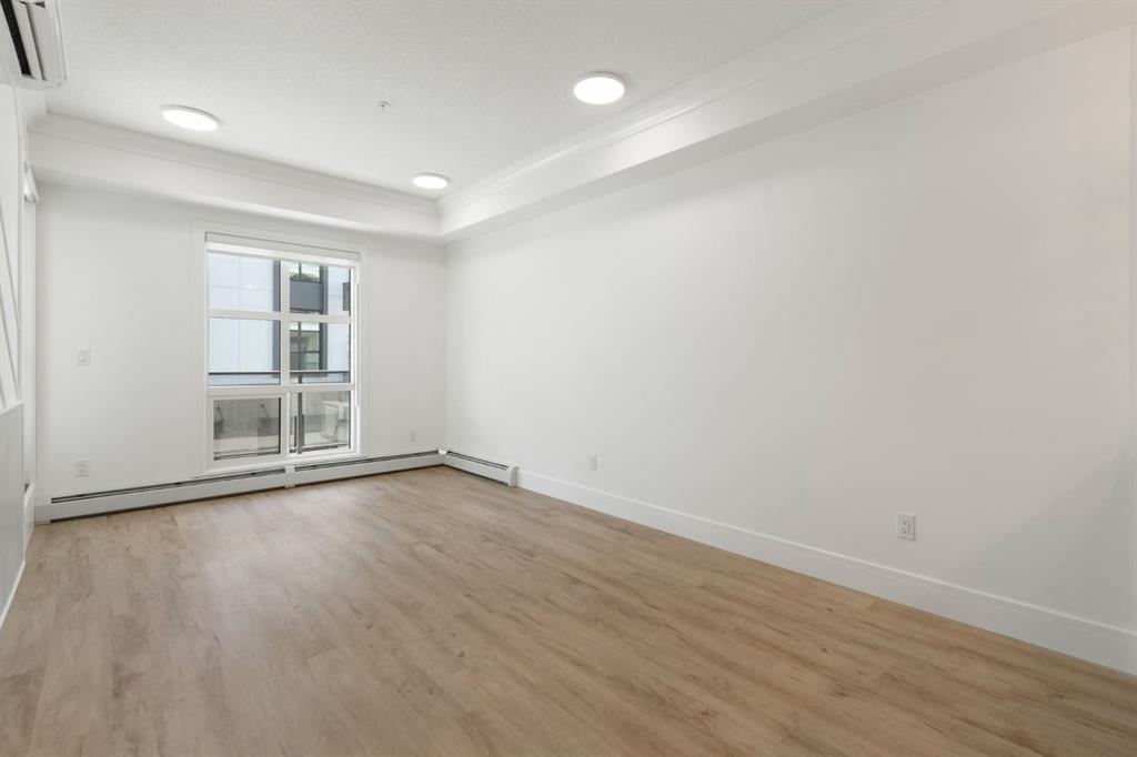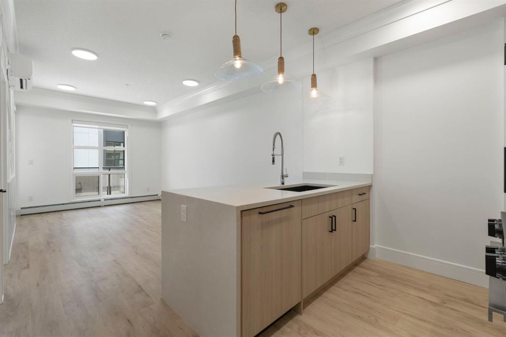 Be the very first to call this pristine, never-lived-in home your own—a sun-filled, modern retreat where every detail feels fresh, flawless, and intentionally designed for the way you live. From the moment you step inside, the open layout draws you in, anchored by a showpiece kitchen where a sleek quartz waterfall island meets premium stainless steel appliances (notice the cabinet front dishwasher and fridge!), an upgraded hood fan, and an oversized sink that makes both cooking and hosting effortless. Natural light pours through oversized windows into both the bedroom and living room, creating a warm, airy atmosphere. Your spacious bedroom easily accommodates a queen bed with nightstands. The bathroom echoes the home’s elevated design with quartz countertops and high-quality fixtures including upgraded tile from the tub to the ceiling, upgraded black rainfall shower head w/ wand & the tile backsplash spans the height of the wall above the beautiful vanity w/ quartz counters! Step outside to your private second-floor balcony—perfect for morning coffee, summer BBQs, or winding down with your favourite beverage as the sun sets. Comfort is elevated with central air conditioning, in-suite laundry, and a titled underground parking stall, plus visitor parking and secure bicycle storage for added convenience. Set within Dean’s Landing in Calgary’s sought-after University District, you’re surrounded by a vibrant, walkable community where trendy cafés, restaurants, and everyday conveniences are just steps from your door. Enjoy easy access to green spaces, bike paths, the University of Calgary, Foothills Medical Centre, and downtown—blending urban energy with neighborhood charm. This unit won’t last long! Call your favourite realtor today to book a private viewing of this beautiful condo.