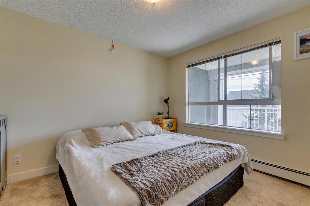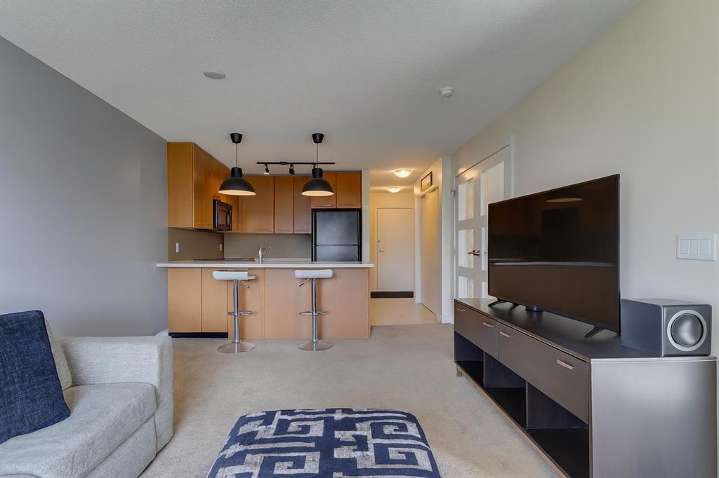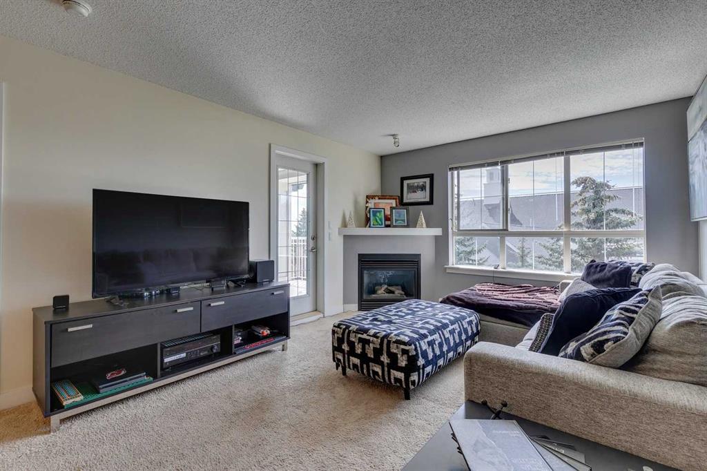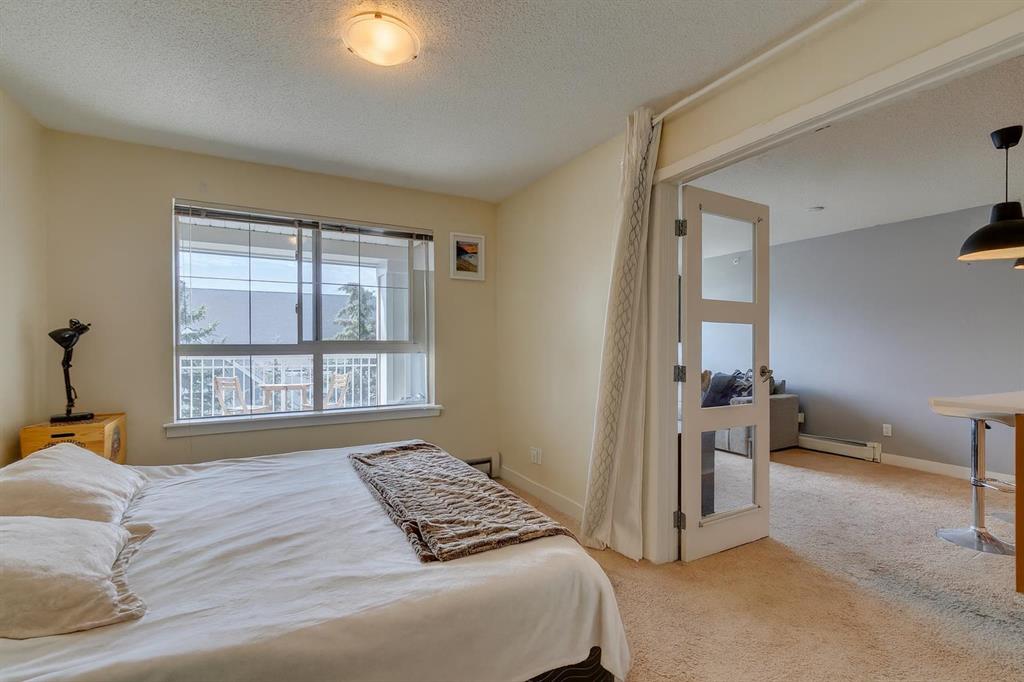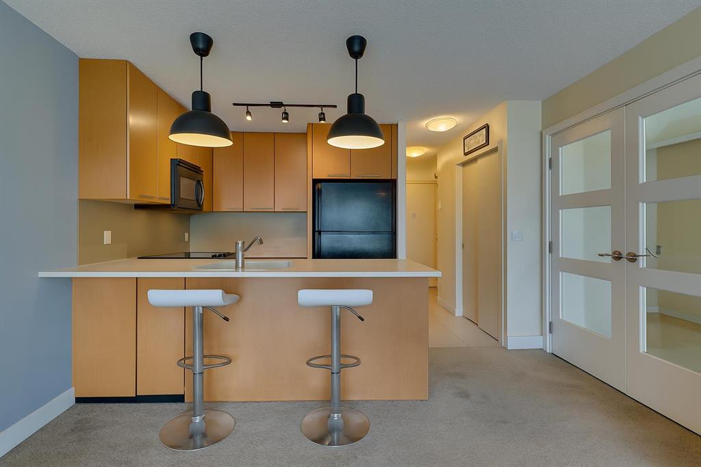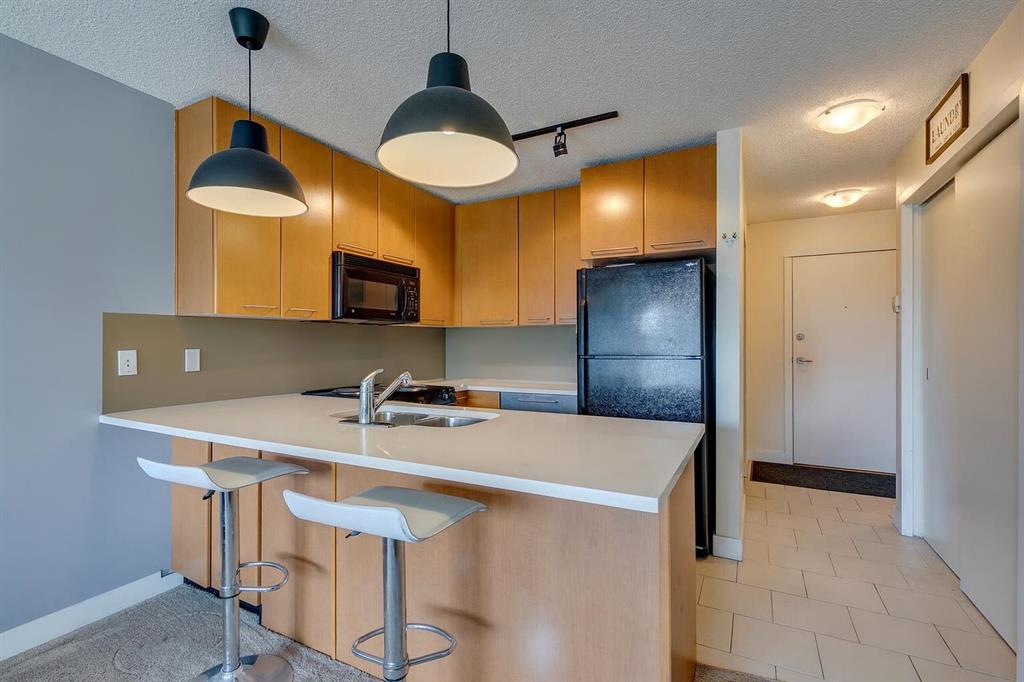 Step into this sunny SOUTHWEST facing, TOP FLOOR, one-bedroom plus den condo, where modern comfort meets everyday convenience. This condo has been virtually refreshed to help you envision its full potential. The open-concept layout flows seamlessly from the kitchen into the living area, creating an ideal space for both relaxing and entertaining. The kitchen features warm wood cabinetry, a sleek breakfast bar with seating, double sink, and pendant lighting that adds a contemporary touch. The adjoining living room is bathed in natural light from the large window and glass door and includes a cozy gas fireplace for those cooler evenings. The spacious bedroom offers privacy with French-style doors and a direct view toward the balcony. A full bathroom with modern fixtures sits conveniently between the bedroom and hallway, flanked by generous closet space for all your storage needs. Work from home or create your own hobby space in the versatile den and enjoy the ease of in-suite laundry with a high-efficiency washer and dryer. Step outside to your covered balcony to enjoy your morning coffee or evening unwind while taking in treetop and rooftop views. Ideally situated just a short walk from Mount Royal University, this location offers convenient access to nearby shopping and essential amenities. Commuting is a breeze with Glenmore, Crowchild, and Stoney Trail only minutes away, providing quick connections throughout Calgary and an easy drive to the mountains. A fantastic opportunity for both homeowners and savvy investors.