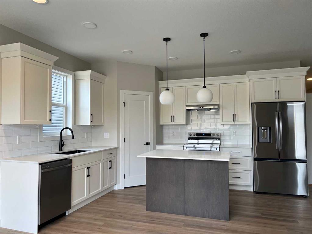 NO condo fees in this beautifully designed 2bedroom, 1.5-bathroom bungalow townhouse built by Edge Homes. This end unit is ideal for first-time buyers or those looking to downsize without compromising on space or style. The open-concept main floor features a bright, modern kitchen with quartz countertops, a large island, soft-close cabinets, under-cabinet lighting, upgraded stainless steel appliances, and durable vinyl plank flooring that flows seamlessly through the kitchen, dining, and living areas. The north-facing primary bedroom shares a spacious ensuite with the second bedroom, complete with double sinks and a private shower and toilet area. Main floor laundry adds everyday convenience. Downstairs future development potential offers a generous entertainment space, two large bedrooms, and a full 4-piece bathroom — perfect for hosting guests or creating a cozy retreat. Step outside to your huge 20x6 deck and sunny, south-facing backyard, ideal for relaxing or entertaining. Located in the peaceful new Grayhawk subdivision on Sylvan Lake’s west side, you’ll love being close to walking paths, future schools and shops, with quick access to the lake, golf courses, and amenities — all while enjoying a quiet community setting. Built with energy efficiency in mind and backed by a New Home Warranty, this home offers peace of mind and modern comfort. GST is included with rebate to the builder. Completion date is estimated spring 2026— inquire for details. Photos shown are renderings of a similar home and may not reflect final finishes.