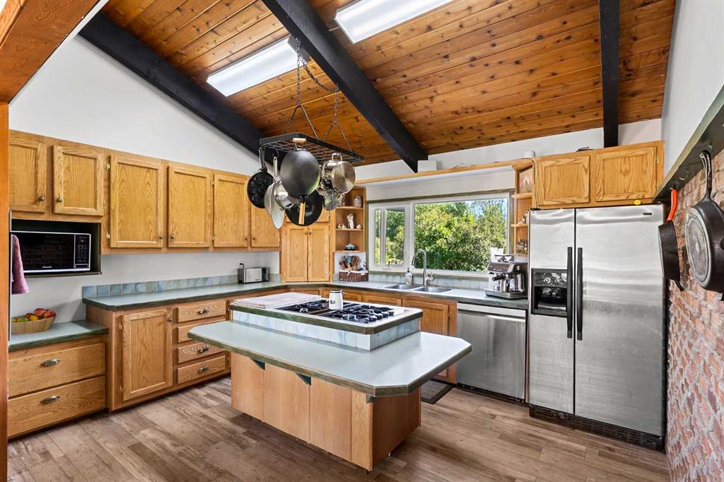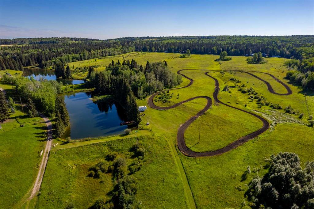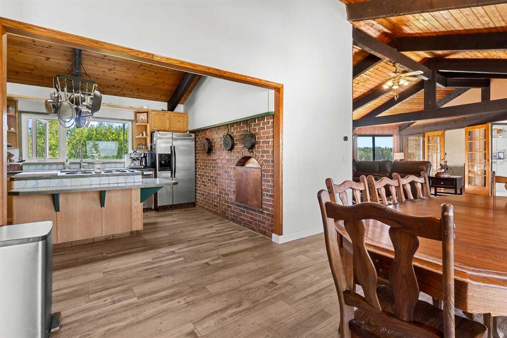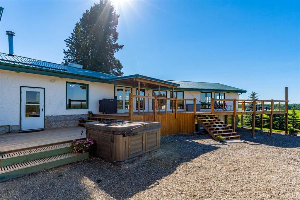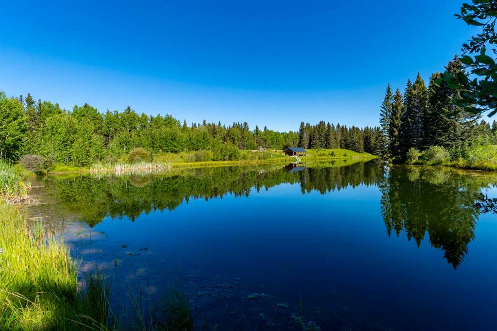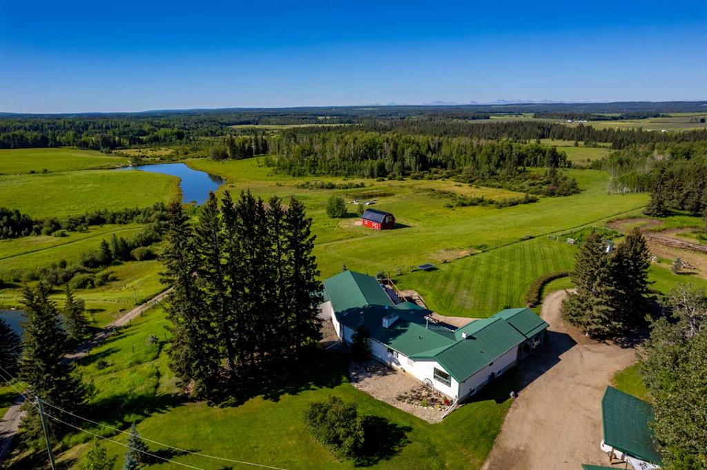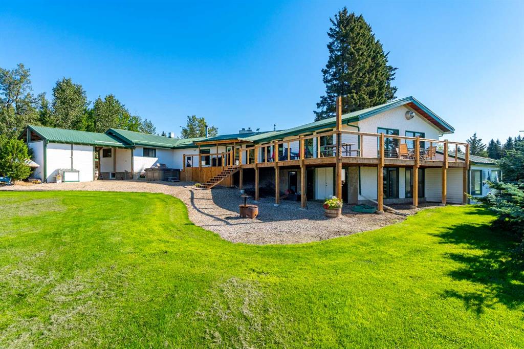 Welcome to your private 40 +/- acre rural oasis! A rare and versatile property that truly has it all. This beautifully finished walk-out bungalow offers 5,000+ Sq Ft, 6 bedrooms and 3 bathrooms. Upon entering the foyer, you will immediately notice the T&G CEDAR CEILING with dark accent BEAMS. To your left up a short run of stairs is access to 2 bedrooms plus the primary suite with 3-piece ensuite. Straight ahead is the main 4-piece bathroom, and then up another short run of stairs is your Kitchen and Dining spaces which is then open to a large living room offering an office nook with a picture window to the rec room and a WOOD BURNING FIREPLACE complete with a hearth, stone & wood mantel. Here you can also look west to your MOUNTAIN VIEWS. Through the living room is an additional rec/play space open to the lower level. This home offers a unique layout that has been optimized to suit a large family. Access to the basement is off the upper rec space or from the foyer. Downstairs you will find a 3-piece bathroom as well as a massive recreation/games space, complete with a PELLET STOVE, dry bar, and family room. From here a large STORAGE space connects you to 3 more bedrooms and the laundry room. With more recent UPDATES include vinyl plank flooring on the main floor, updated interior doors, new carpet & trim on the north side of the home, and updated main floor bathroom. This home is perfect for families or those who love to entertain while enjoying their own piece of rural paradise. This is a place where you come home from work and can truly unwind, while being able to support your inner child with plenty of recreational opportunities right here for you and the kiddos! No need to fight for a camping spot with what this parcel has to offer. The outdoors impress with an array of features including the convenience of a CARPORT right off the house, a large west DECK (partially covered) that wraps to the south side of the home, a 32\'x24\' HEATED GARAGE/WORKSHOP, multiple sheds, a 24\'x32\' BARN for the horse lovers with finished LOFT (did someone say poker night)? Plus a 60\'x42\' HEATED SHOP with its own well, septic system, power, gas and RI for a bathroom! Explore WALKING TRAILS, a MOTOCROSS TRACK, and 2 large spring fed PONDS stocked with rainbow trout. All this plus a dock for swimming in summer and a perfect skating surface in winter for year-round enjoyment! The year round flowing creek that meanders through the land can be heard running in the background and adds to this property\'s retreat feel. With ~25 ACRES OF FENCED PASTURE, a lush garden, and abundant privacy, this property is a true rural haven just waiting for its next chapter. Enjoy the peace of rural living without feeling isolated — conveniently located just off pavement, only 10 minutes to the community of Sundre & only 30 minutes to the larger center of Olds. GST due diligence required.