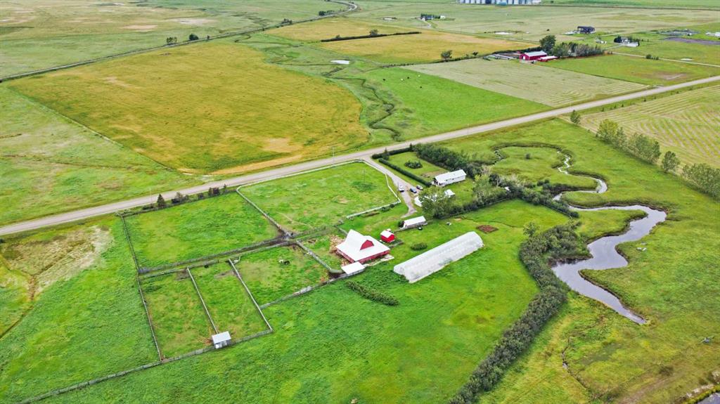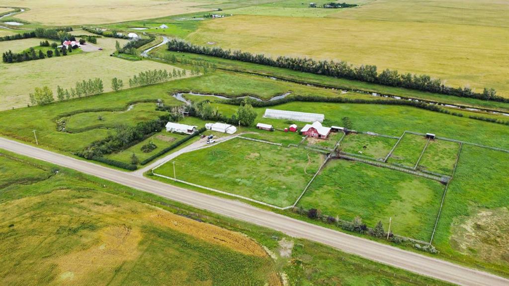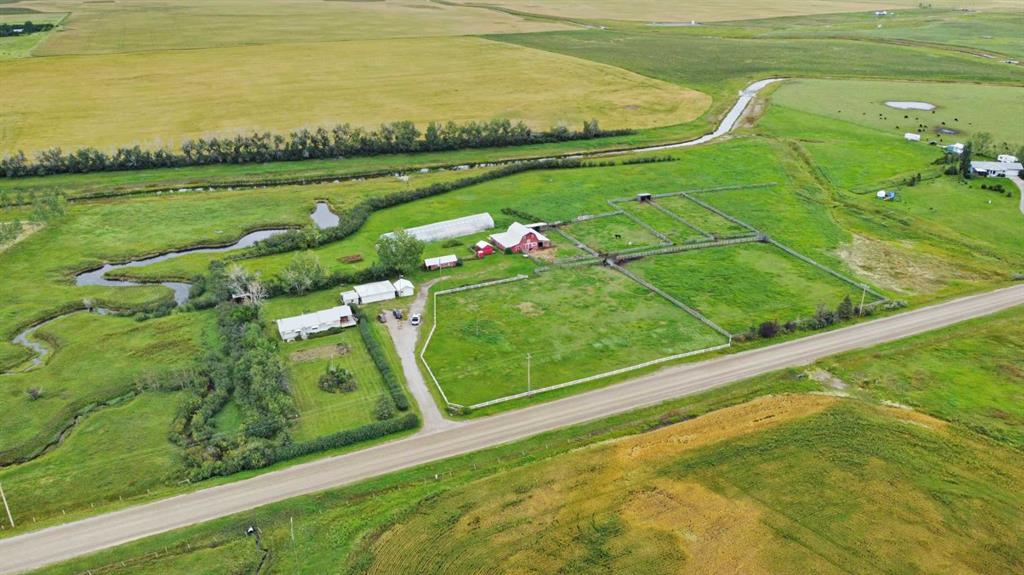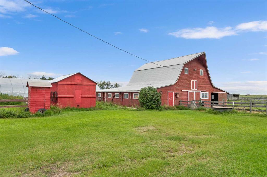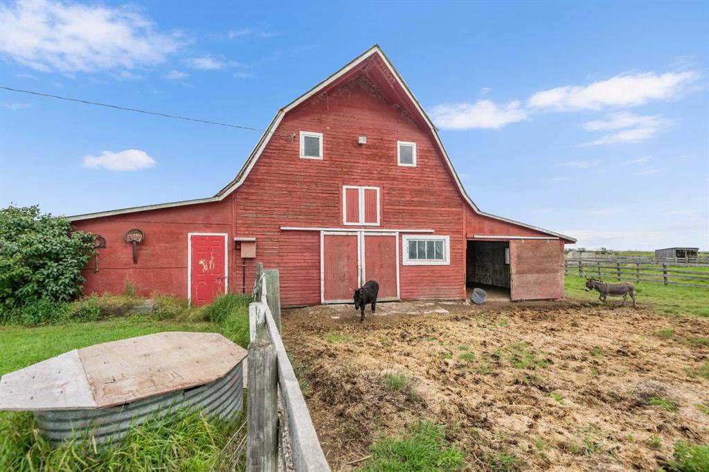 Set on 10.38 acres just 15 minutes from Calgary city limits, this property offers the perfect blend of rural tranquility and urban accessibility. Bordering a water canal and creek on the west and north sides, the land is framed by mature trees that create a natural windbreak and enhance the sense of privacy. Expansive lawns, lush gardens and scenic walking paths along the canal provide endless opportunities for enjoying the outdoors, while winter months bring the simple pleasure of skating on the creek. A standout feature is the classic red barn, designed for both function and charm. The main level includes a spacious storage and workshop area, six animal stalls, a large straw storage space and automatic waterers connected to the property’s well water supply. Upstairs, the loft offers a warm, wood-lined setting ideal for barn dances, gatherings or creative use. Multiple fenced pens are ready for horses or other livestock, making this property equally suited to equestrian pursuits, hobby farming or a blend of both. Five garage bays across various outbuildings include a triple garage that is insulated and equipped with a new furnace. An upgraded electrical panel on the main power pole enhances power capacity and reliability for the entire property. Recent improvements also include gas lines moved for efficiency and a brand-new greenhouse, perfect for year-round gardening. The wrap-around deck invites you to relax, barbecue and take in the sweeping prairie views. Stepping inside, the home embraces a warm farmhouse style that instantly feels welcoming. A generous mudroom keeps boots, jackets and seasonal gear neatly organized, making daily life more functional. The living room opens seamlessly to the sitting area, where a wood-burning stove radiates warmth and creates a cozy focal point for gatherings. In the kitchen, rich wood cabinetry adds rustic charm, while a pantry offers extra storage for dry goods and kitchen essentials. A peninsula with a clever fold-up table provides the perfect spot for quick breakfasts, early morning coffee or extra prep space, folding down again when not in use. A window above the sink frames a tranquil view of the countryside, turning even dishwashing into a moment of calm. The dining area is designed for connection, with an oversized window that captures breathtaking prairie views and floods the room with natural light. A new hot water tank adds peace of mind to the home’s everyday comfort. Two large bedrooms provide restful retreats, each offering ample space for personal touches. The updated full bathroom serves the main floor with ease and convenience. Main level laundry adds everyday practicality, keeping chores close at hand. Downstairs, a spacious rec room with wood paneling and exposed beams sets the stage for family movie and games nights. This is more than a home, it’s a lifestyle, offering space, privacy and the flexibility to live, work and play in the beauty of the Alberta countryside while staying close to city conveniences!
