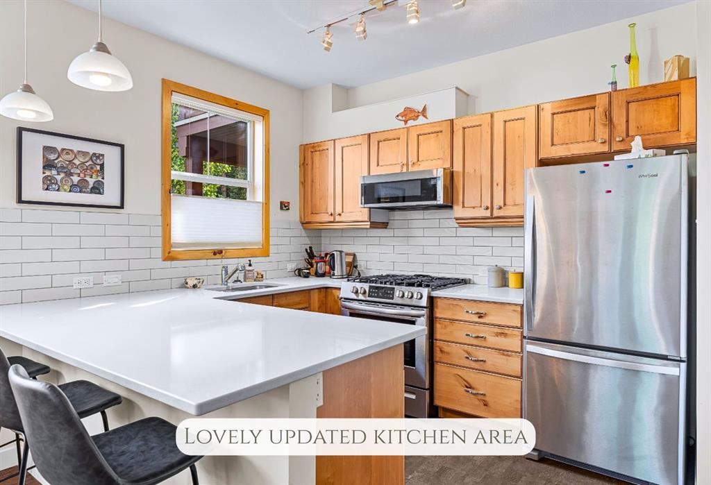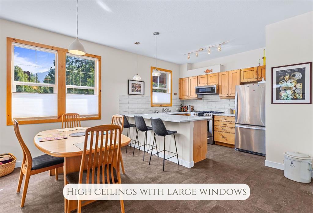 A rare 2 bedroom + office townhome in Three Sisters in Canmore. With sun-filled living spaces, heated cork floors and a modern kitchen, this is more than a property. It is home. Recent updates create a bright and welcoming feel inside while showcasing beautiful mountain views from window and deck. The attached single garage adds convenience for all seasons, for warmer winter mornings and ample storage for mountain gear. This is a private complex with plenty of green space on the surrounding grounds. 1 minute walk to the cherished local Bistro with outdoor patio where you’re sure to chat up with a neighbour, and a boutique wine store. A leisurely stroll will take you to the under-construction commercial hub called the Gateway, with grocery store, coffee shop, brew pub, and gas station among other services. Hiking, Biking, Golf and Trans Canada bike path to downtown, all within 2 km from your door. Suitable for couples, families, weekend homes and investment.