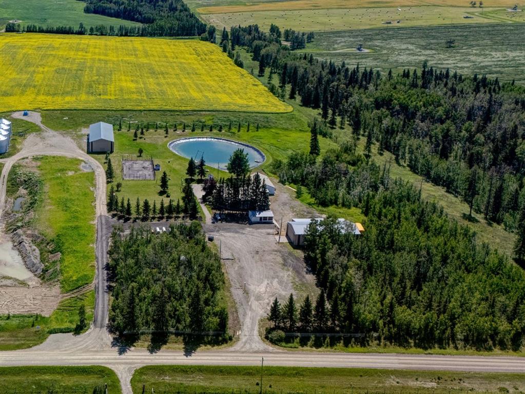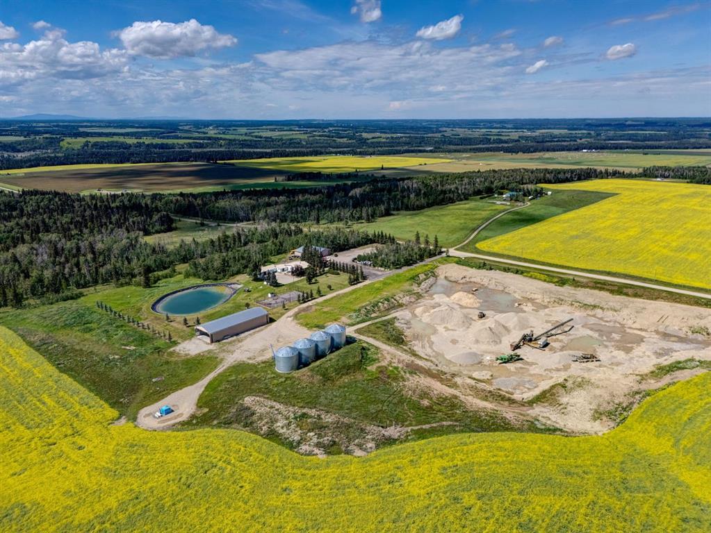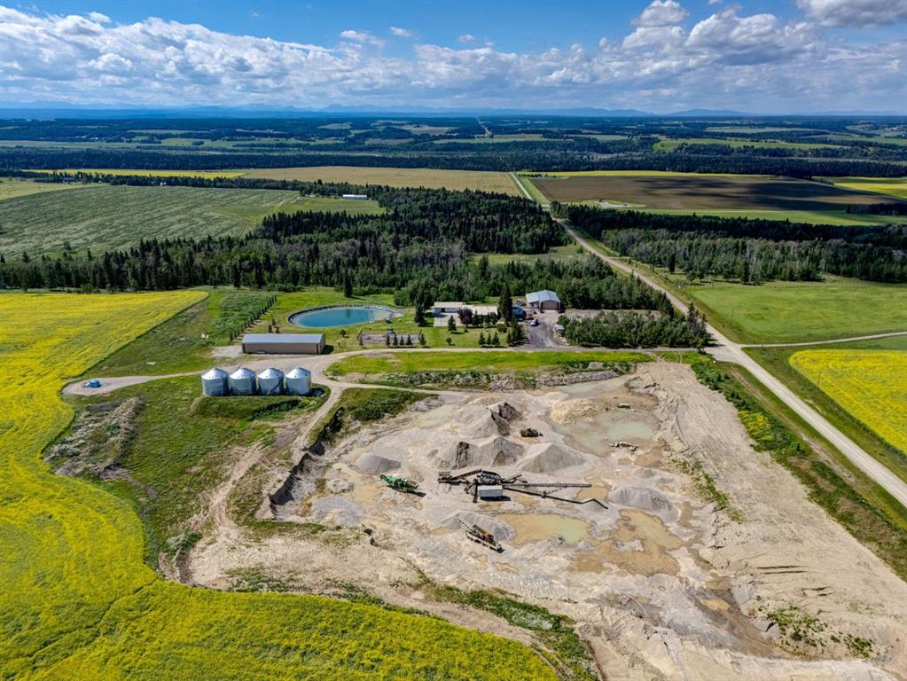 This property boasts multiple revenue streams! The first of several includes a permitted and established 12.35-acre, aggregate extraction pit, that allows striping and stockpiling, aggregate extraction, loading, hauling and truck traffic. The quarry pit is currently operational, with the potential for expansion for further gravel crushing permits upon compliance with the standard approval process, creating a favorable investment opportunity. Current gravel reserves are estimated at 3,000,000 tonnes. Unprocessed raw aggregate reserves valued at $5/tonne. Processed aggregate products (screened, future crushing etc.) valued from $20-$100/tonne. Supporting documentation, gravel studies, and field reports are available upon request, along with optional purchase of on-site machinery, including a crusher and conveyor system. Additional current and future revenue possibilities include farming, oil/gas lease income, (existing surface lease revenue from Whitecap Resources already in place), trucking operations, RV or trailer storage, mechanic or towing service, Airbnb rental opportunities, a permanent residential retreat, horse options and SO much more! Existing farmland lease revenue. Rental of Workshop, House, Hay Shed and Grain Bins bring the potential CAP Rate to 6% without any gravel revenue. Discover the endless possibilities here of this 155+ acre property in Mountain View County, a rare opportunity to own a large-scale, multi-purpose acreage in a highly desirable location. An unparalleled investment opportunity. Several high-value structure outbuildings are already in place, including an impressive 48x84 ft, heated flooring shop and office, massive hay shed, grain storage, multiple garages, large hangar, pump house, and gazebo. At the heart of the property sits a single level, 8-bedroom home with a large deck, landscaping, and massive attached 4-car garage, surrounded by impeccable natural beauty. You’ll fall in love with the enjoyment of its private pond, tennis court, beautiful forest reserve, and breathtaking mountain views—all just 1.5 hours from downtown Calgary and minutes from Olds, Sundre, Carstairs, and Cremona. Services include a septic tank with pump-out, pipelines, and two well sites. Whether you envision expanding the potential for a lucrative gravel / aggregate pit business, farming the rich land, diversifying into oil and trucking, or creating a combination of residential and commercial uses, this property delivers it all. You have arrived!