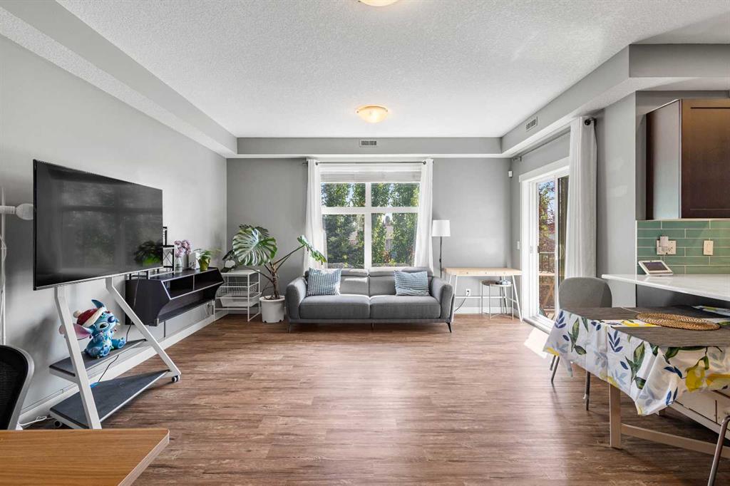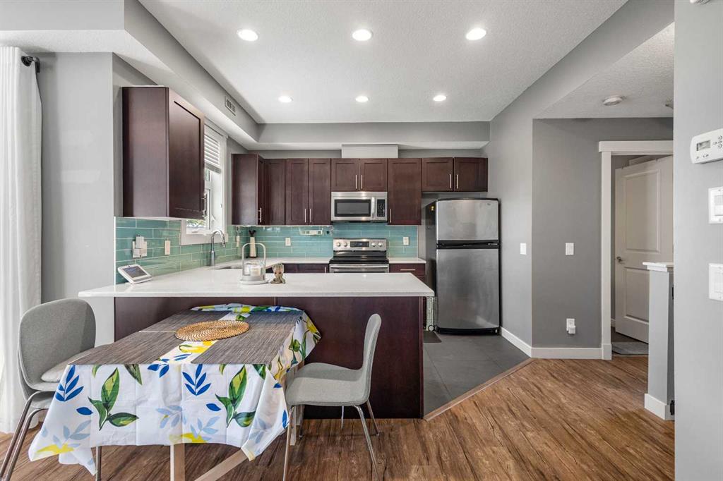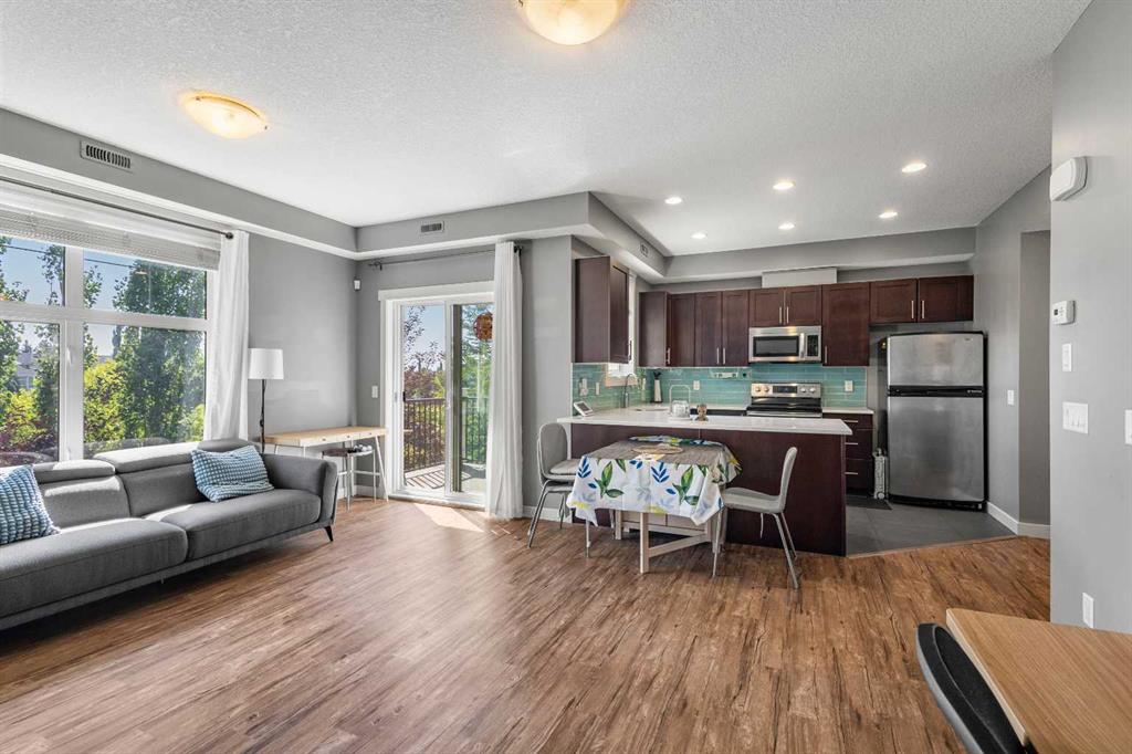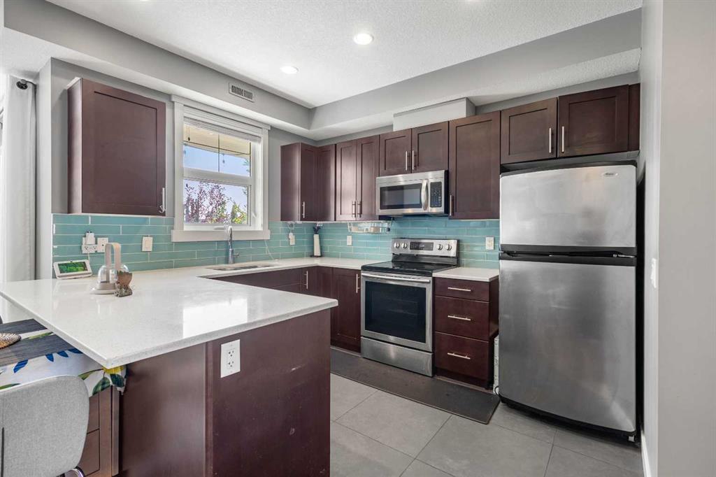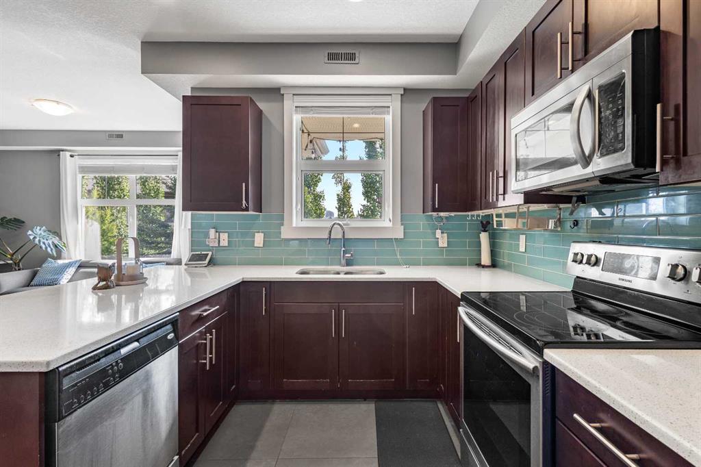 This Upper Corner unit townhouse, located in the sought-after community of West Springs, offers both style and convenience, with easy access to all nearby amenities. Featuring 2 bedrooms, this townhouse boasts sweeping SW views of open green space, playgrounds, and even partial glimpses of the Rocky Mountains. Enjoy the large covered balcony just off the living room, complete with a natural gas hookup for your BBQ.The kitchen is beautifully finished with quartz countertops and glass subway tile, while the living room and stairs feature durable vinyl plank flooring, plus 9ft ceiling. Both bedrooms are generously sized with oversized windows and vaulted ceilings that fill the space with natural light. An attached garage with storage plus an additional front parking pad.