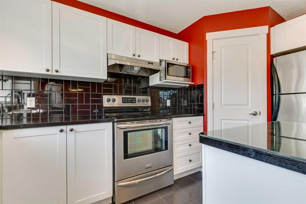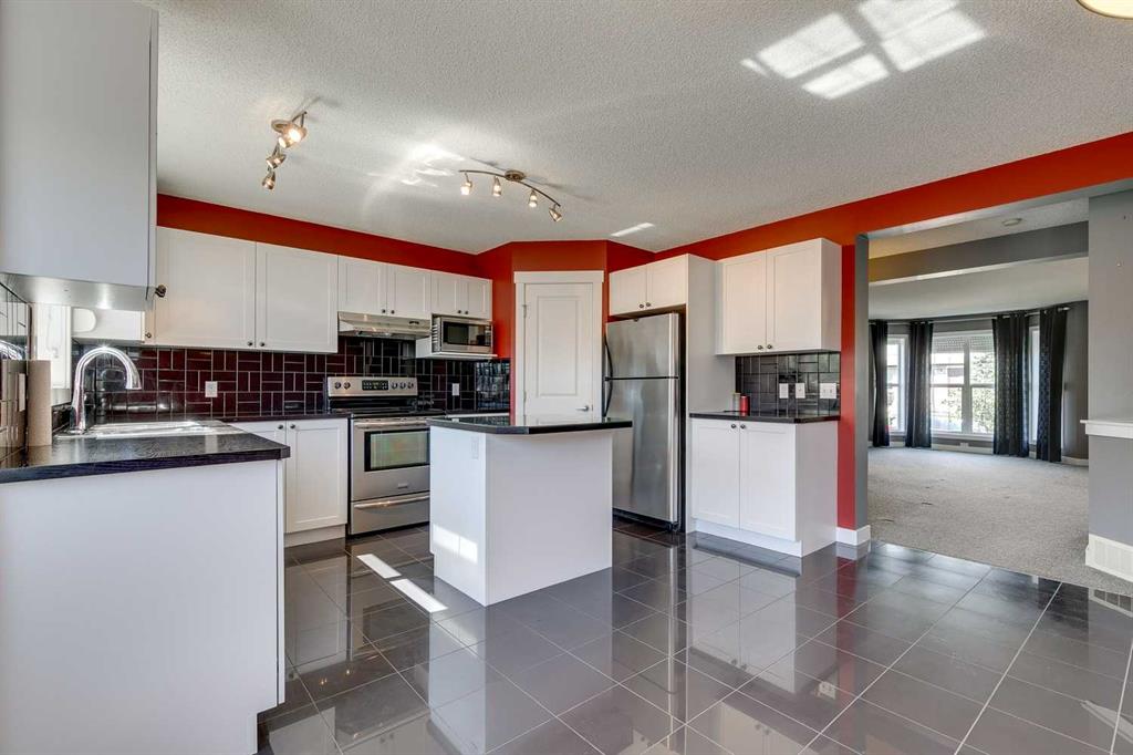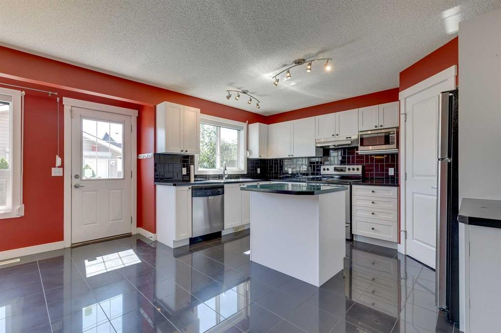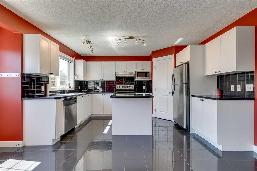 Unbeatable value! Beautifully upgraded & meticulous family home on a manicured south exposure lot, just ½ block to the elementary school. This expanded “Monaco” by Shane Homes is a spacious 1,658 sqft two storey, with additional 500 sqft of professional development in the lower level. From the moment you arrive you’ll appreciate the pride of ownership and attention to detail. Spacious living room with bay window and full-size dining area which can also be a great space for a computer station. The country-style kitchen is a highlight with extensive cabinets, pull-out drawers, step-in pantry, full custom file backsplash and center island with a 2-stool breakfast bar. The adjoining eating area has plenty of room for a large family to enjoy meals together. A full-size picture window with sun guard glass, brings in an abundance of natural light and overlooks the deck; garden door leads directly to the deck, yard and detached garage (back lane access). Completing the main floor is a ½ bath for guests. The upper level has 3 spacious bedrooms, a 4-piece bath and laundry which is convenient for a busy family. The primary bedroom offers privacy with a spa-inspired ensuite and walk-in closet. The lower level has a 4th bedroom (window to egress), 4-piece bathroom, space to add a family room and plenty of storage too. Enjoy the sunshine on the deck then retreat inside to the beautifully air-conditioned home. Many upgrades include new roof shingles & eaves in 2025, custom tile flooring, central air conditioner, water softener, custom built cedar fence with “hidden” front & back gates, security roll shutters on all lower level windows, main floor windows & doors, plus on the garage! Retired couple spent 6 months travelling since building this home, so very little wear & tear! Smoke-free. Best value in Saddle Ridge!! Immediate possession.