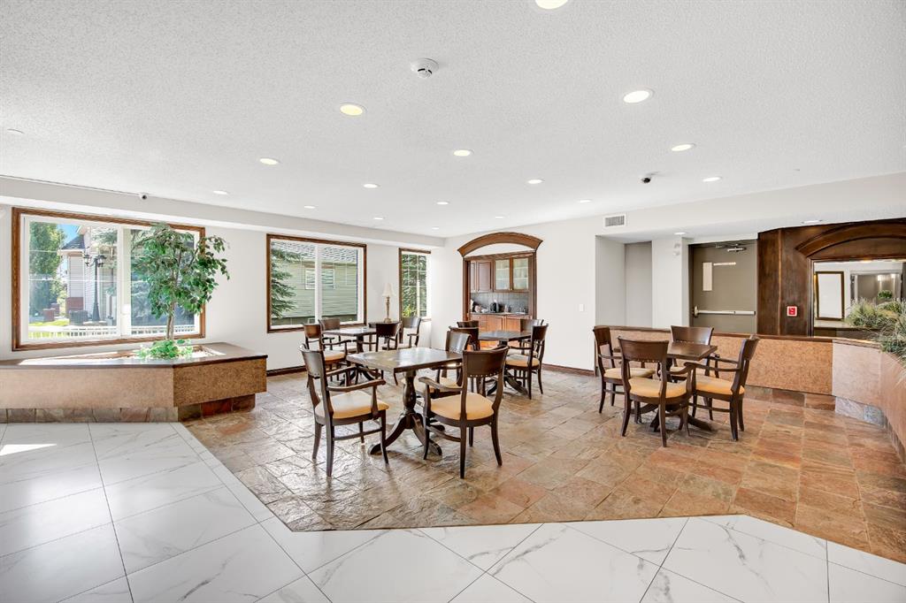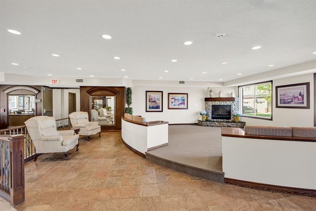 Practical comforts include in-suite laundry, heated underground parking, and a welcoming lobby with cozy seating areas, a library, and a kitchenette for social gatherings.