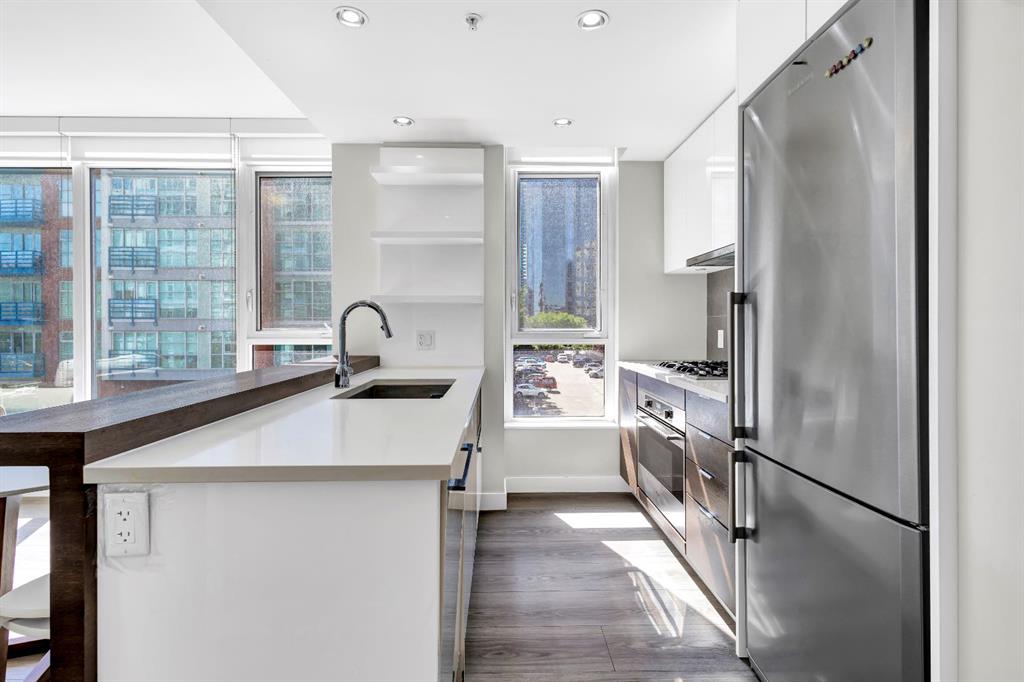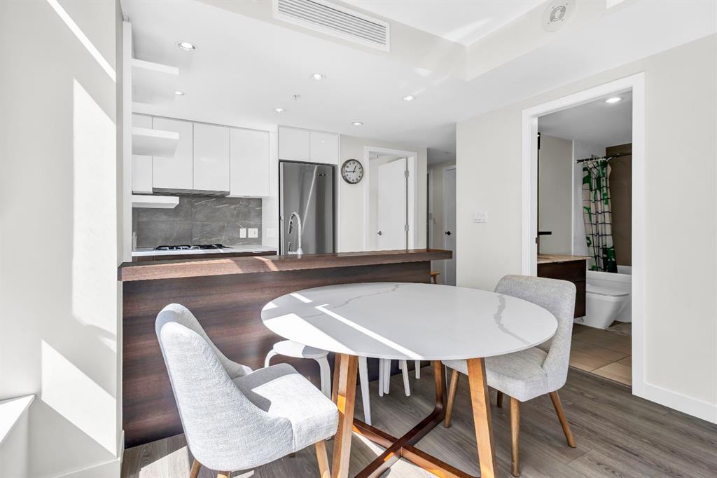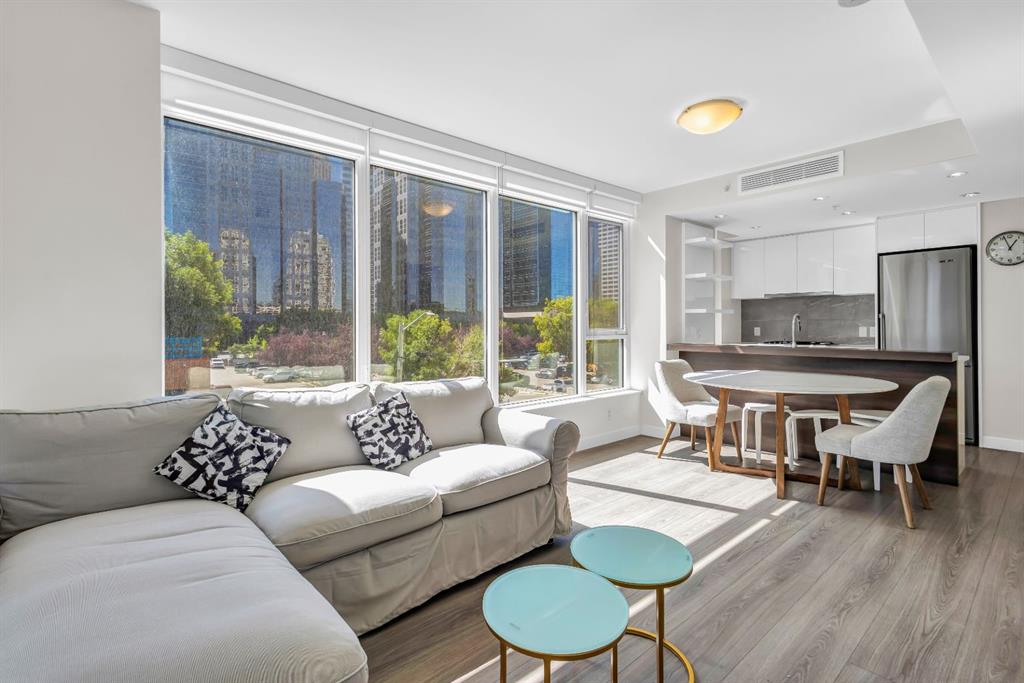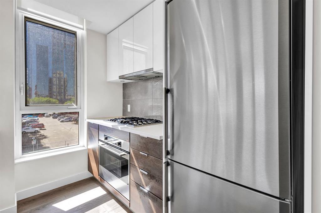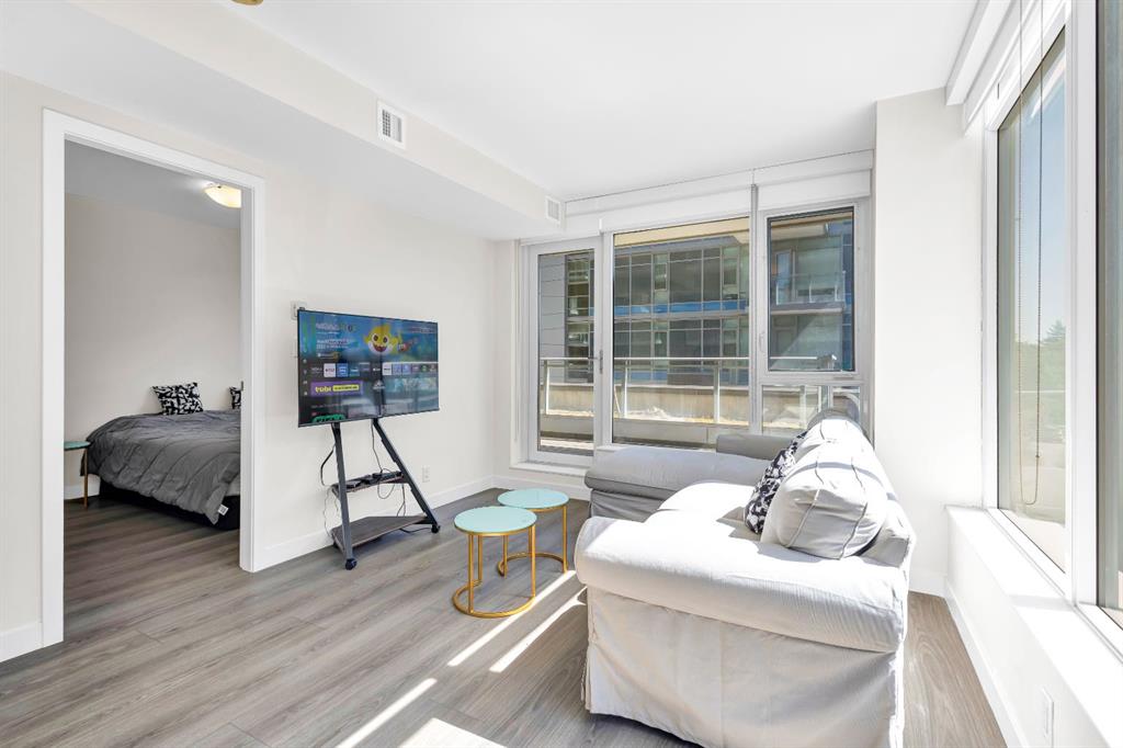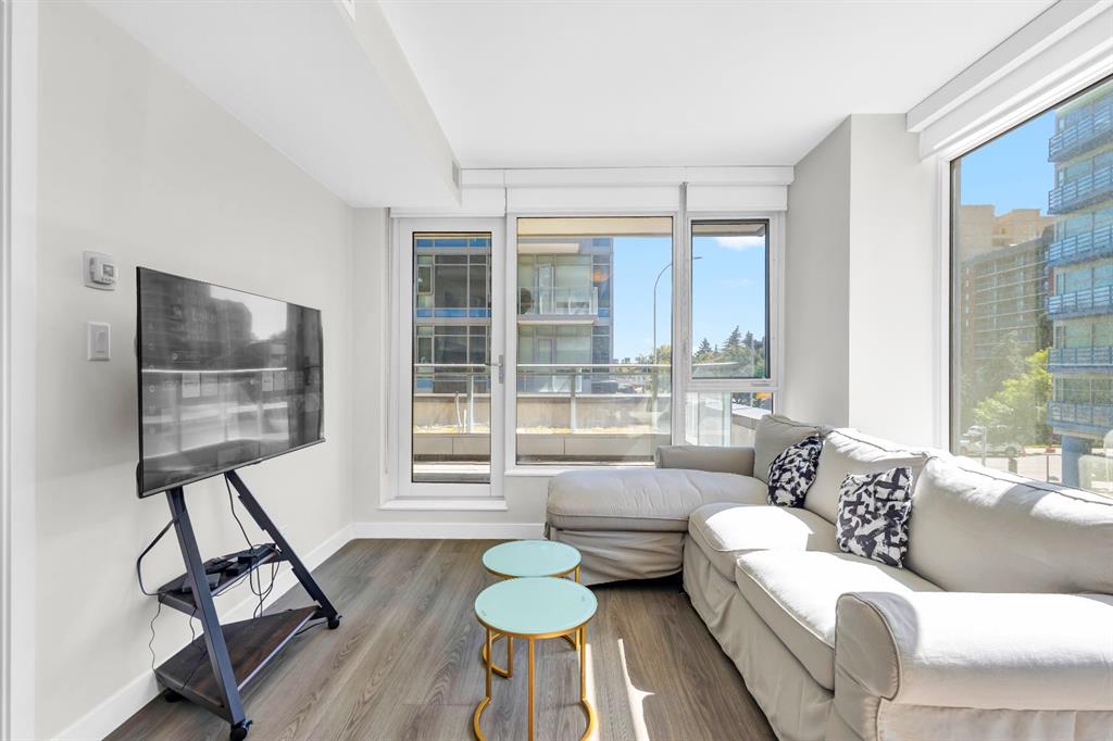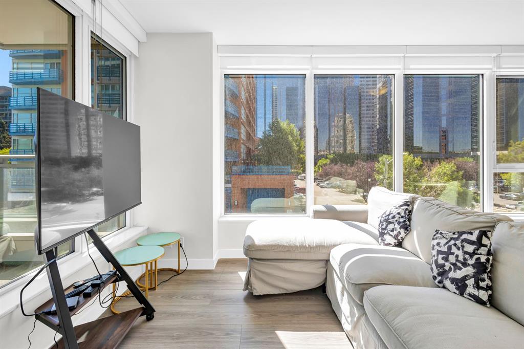 Luxury Corner Condo in Prestigious Waterfront. Discover modern urban living at Waterfront, Calgary’s premier luxury condo development perfectly positioned along the Bow River in the heart of downtown. This elegant corner unit offers 565 sq. ft. of beautifully designed living space featuring an open-concept layout and large windows that fill the home with natural light. The modern kitchen is equipped with sleek cabinetry, stone countertops, and premium built-in appliances, ideal for everyday living or entertaining.