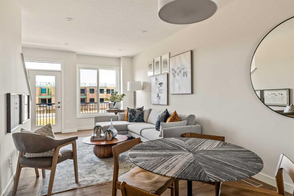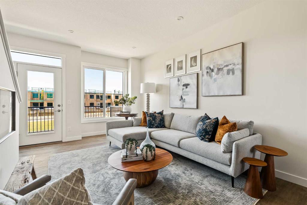Welcome to the brand-new Rhythm townhomes at Taza Park by Brookfield Residential, offering an ultimate low-maintenance lifestyle ideal for first-time buyers, downsizers, or those seeking a convenient lock-and-leave home. This bright and modern ‘Geranium’ model features an intelligently designed open-concept layout with 2 bedrooms, 2.5 bathrooms, and a double-attached garage, providing over 1,100 sq. ft. of beautifully appointed living space. The spacious main level is filled with natural light thanks to oversized windows and an open layout perfect for entertaining. The upgraded kitchen showcases full-height cabinetry, stainless-steel appliances including a range hood and built-in microwave, a French-door refrigerator, a large peninsula with seating, and a corner pantry. The adjacent dining area flows effortlessly into the inviting front living room, where doors lead to a private southwest-facing balcony. Completing this level is a convenient 2-piece powder room. Upstairs, you’ll find dual primary suites, each with generous closets and private ensuites, an ideal layout for guests, roommates, or a dedicated home office setup. A centrally located laundry space adds everyday convenience. The tandem double-attached garage offers secure parking plus additional storage space, ensuring comfort and practicality year-round. Additional upgrades include enhanced railing details, a natural gas BBQ line, and a 3-year extended workmanship warranty for peace of mind. Legal fees are included, and a complimentary move-in concierge service with Virtuo ensures a seamless move-in experience. Situated just minutes from Weaselhead Park, the Glenmore Reservoir, and major commuter routes, Rhythm at Taza Park delivers the perfect blend of nature access and urban convenience. This is a rare opportunity to own a brand-new contemporary townhome in a coveted location, book your showing today! *Please note: photos are of a show home model and exact finishes will vary.