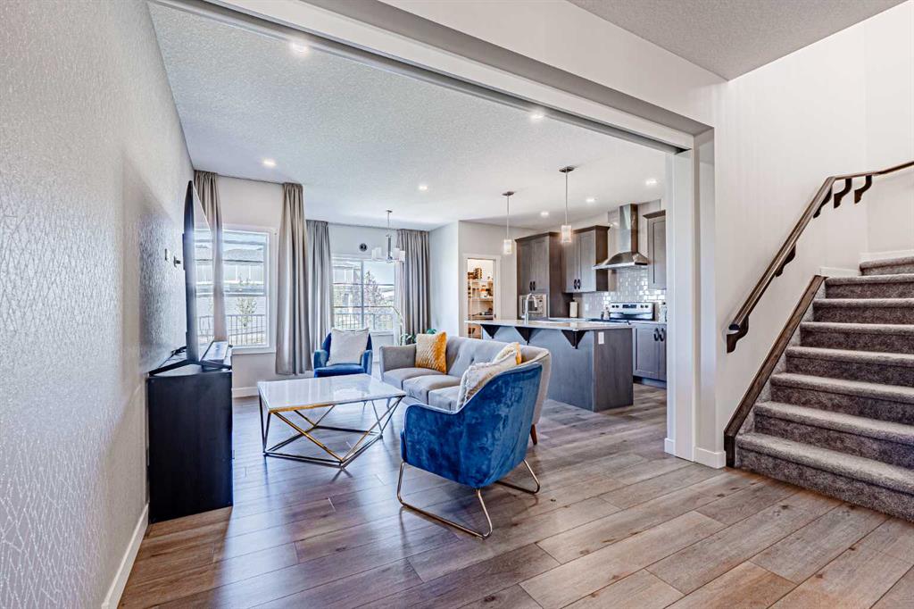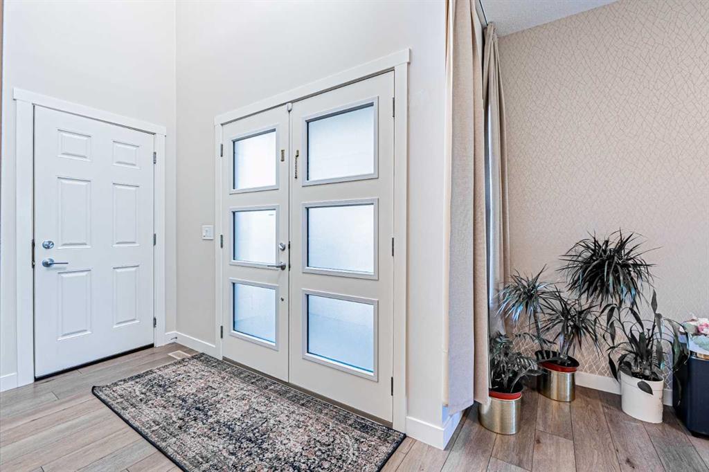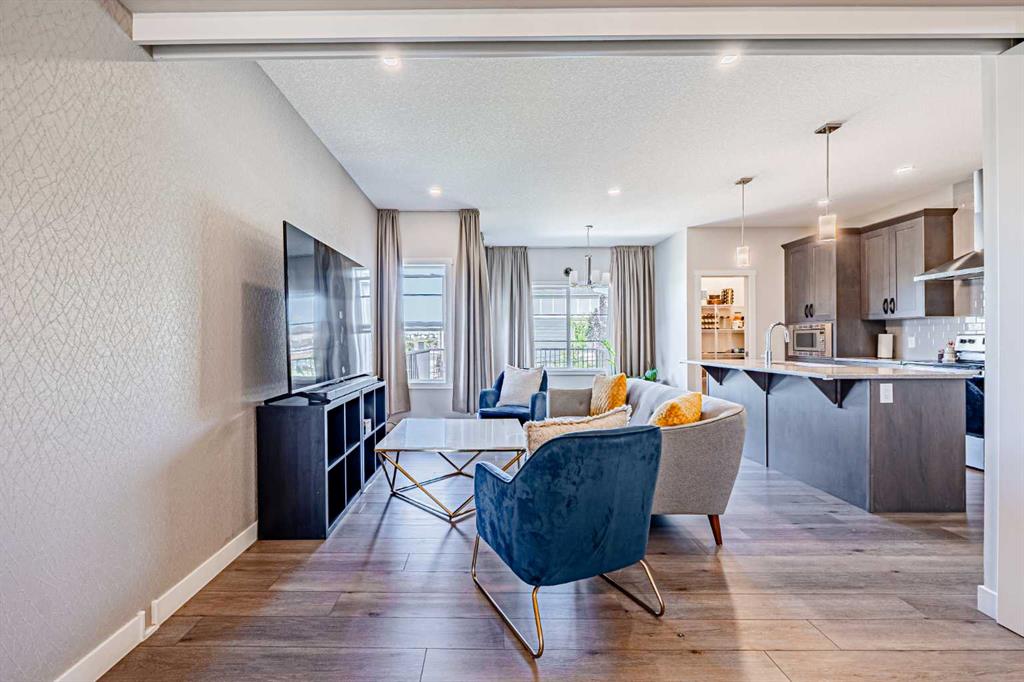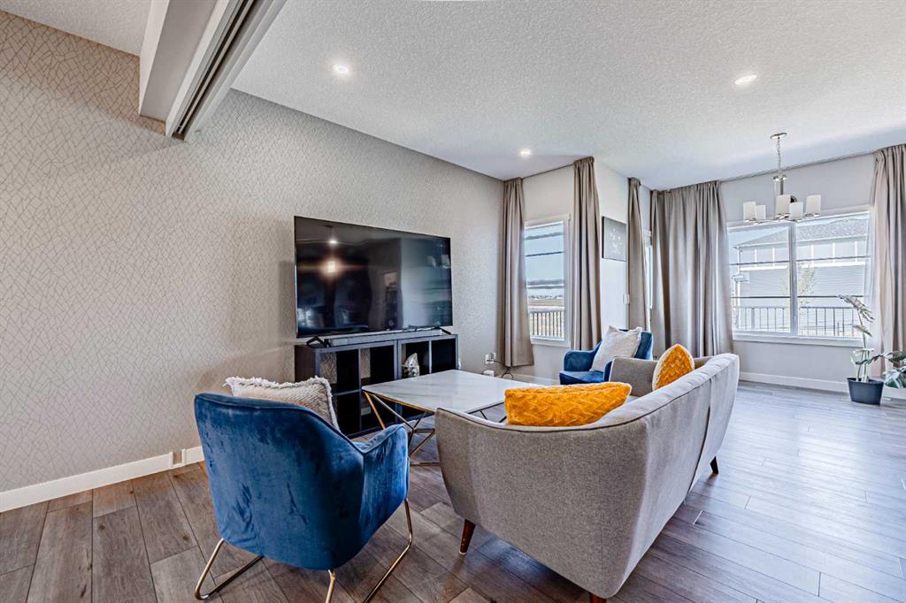 Welcome to this stunning former showhome offering 1,950 sq. ft. of living space on a spacious 4,050 sq. ft. lot. Perfectly situated with no direct neighbors behind or in front, this home backs onto a beautiful green space and pathway, providing peace and privacy. Step inside through the grand double door entrance into an open-to-below foyer featuring built-in decorative shelving and elegant railings that extend throughout the main and upper levels. The main floor offers a bedroom with a full bath and standing shower, perfect for guests or multi generational living. The home boasts two spacious living areas that can be separated with a pre-installed pocket wall, an upgraded kitchen with quartz countertops, stainless steel appliances, chimney hood fan, built-in microwave, large pantry and a dining area that opens to a massive deck and backyard. Upstairs you will find a bright bonus room, two generously sized secondary bedrooms with a 3-piece bath, and a private master retreat with a 4-piece ensuite and walk-in closet. Stylish window coverings, air conditioning and countless thoughtful upgrades enhance the comfort of this home. The basement features 9’ foundation height and a separate side entry with concrete steps and railing, offering future development potential. The oversized backyard is perfect for family gatherings and outdoor enjoyment. This exceptional home has it all – space, style, privacy and upgrades. Do not wait, book your private showing today before it’s gone!