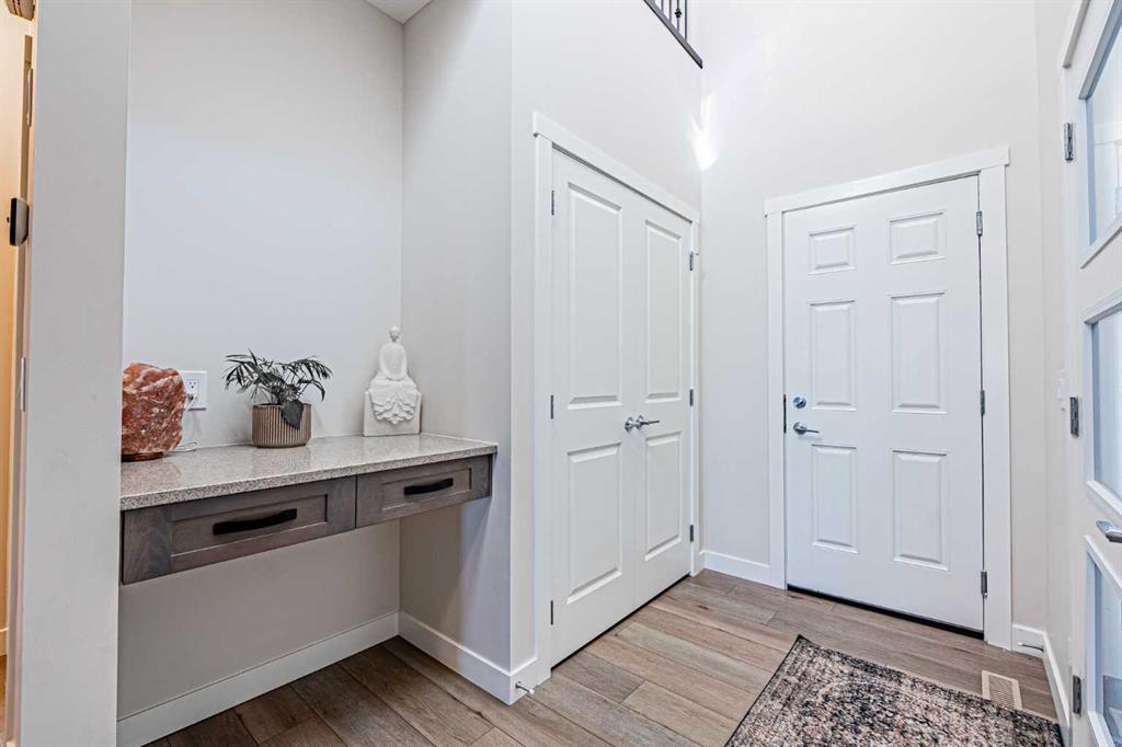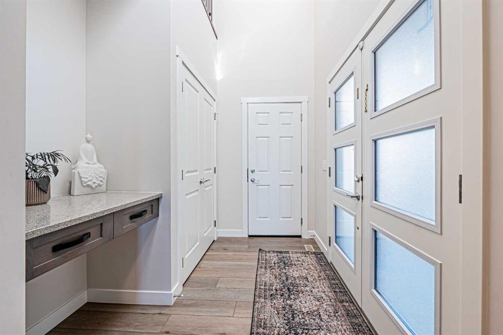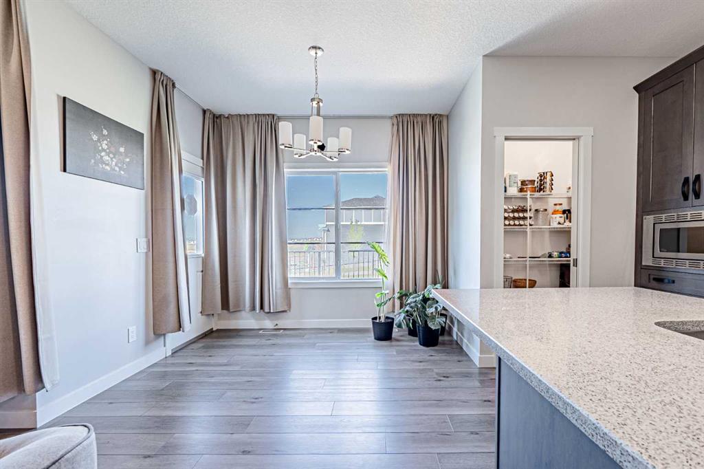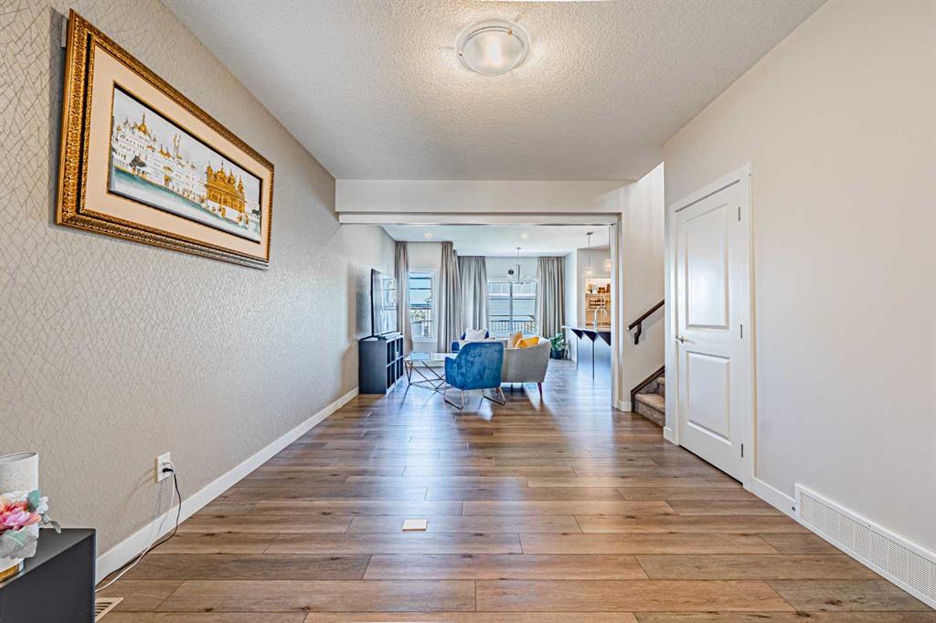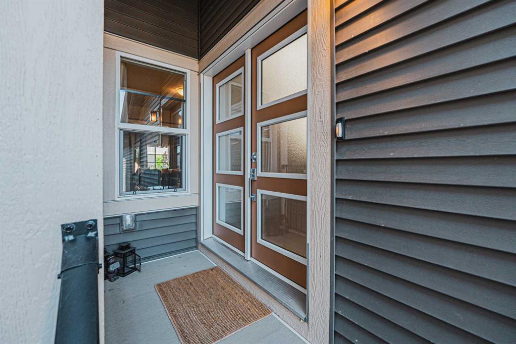 Welcome to this stunning former showhome offering 1,950 sq. ft. of living space on a spacious 4,050 sq. ft. lot. Perfectly situated with no direct neighbors behind or in front, this home backs onto a beautiful green space and pathway, providing peace and privacy. Step inside through the grand double door entrance into an open-to-below foyer featuring built-in decorative shelving and elegant railings that extend throughout the main and upper levels. The main floor offers a bedroom with a full bath and standing shower, perfect for guests or multi generational living. The home boasts two spacious living areas that can be separated with a pre-installed pocket wall, an upgraded kitchen with quartz countertops, stainless steel appliances, chimney hood fan, built-in microwave, large pantry and a dining area that opens to a massive deck and backyard. Upstairs you will find a bright bonus room, two generously sized secondary bedrooms with a 3-piece bath, and a private master retreat with a 4-piece ensuite and walk-in closet. Stylish window coverings, air conditioning and countless thoughtful upgrades enhance the comfort of this home. The basement features 9’ foundation height and a separate side entry with concrete steps and railing, offering future development potential. The oversized backyard is perfect for family gatherings and outdoor enjoyment. This exceptional home has it all – space, style, privacy and upgrades. Do not wait, book your private showing today before it’s gone!