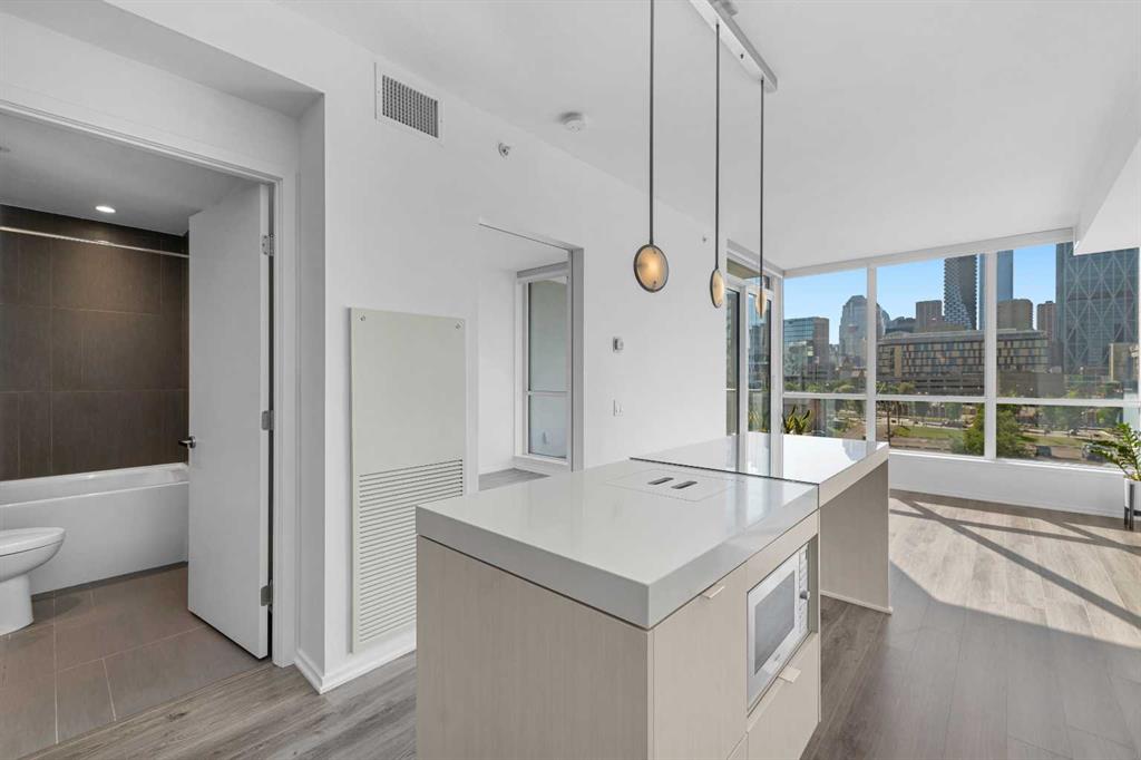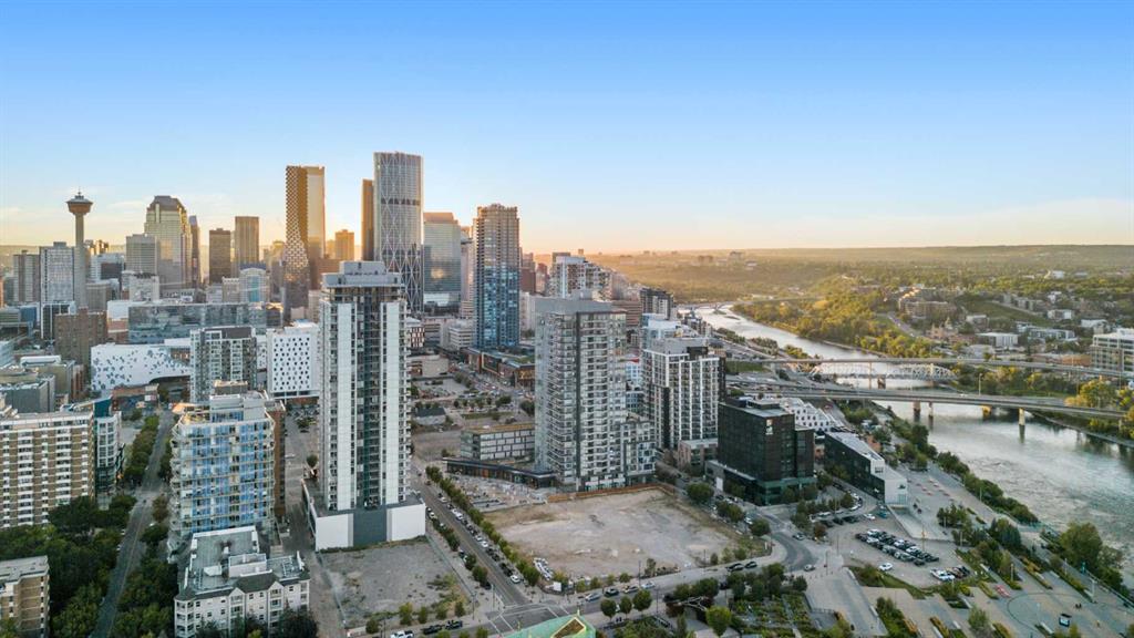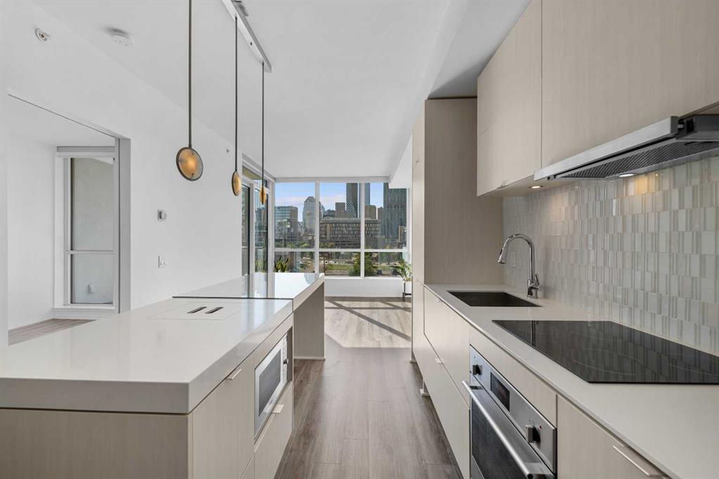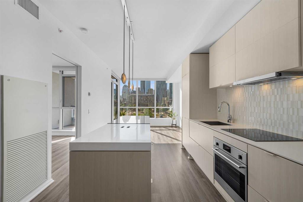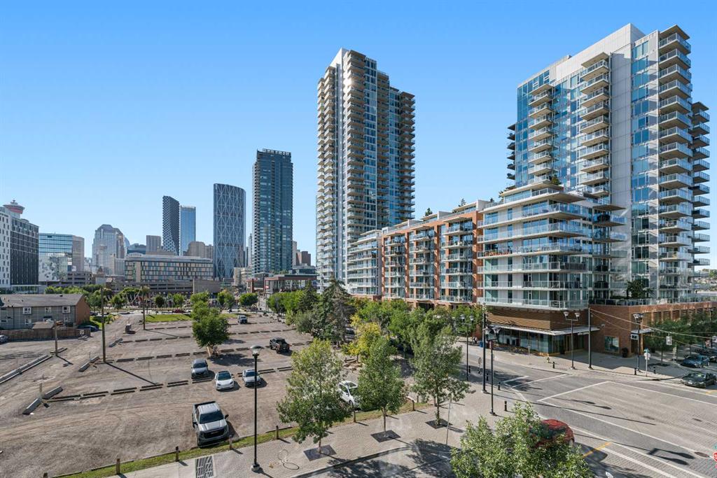 Experience urban living at its finest in the prestigious Verve building, nestled in Calgary’s vibrant East Village. This stunning 578 sq ft apartment offers one bedroom plus a versatile den, perfect for a home office or guest space (builder floor plan 620 sq ft). Fantastic CITY VIEWS from both the living room and master bedroom. The contemporary design is highlighted by sleek quartz countertops, European-style cabinets, and high-end finishes throughout. The open-concept living area is bathed in natural light, with floor-to-ceiling windows. Step out onto your private balcony to enjoy unobstructed west-facing views of the city skyline. The spacious 4-piece bathroom exudes luxury with modern fixtures and ample storage. Residents of the Verve enjoy access to top-notch amenities, including a state-of-the-art fitness center, two beautifully landscaped terraces with outdoor grills, and guest suites for visitors. The titled underground heated parking stall and storage locker add convenience and peace of mind. Located in the heart of East Village, you’ll be steps away from the Bow River pathways, eclectic shops, trendy cafes, and lush parks. Whether you’re exploring the city or enjoying a quiet evening at home, this property offers the perfect blend of comfort and lifestyle. Book private viewings today!