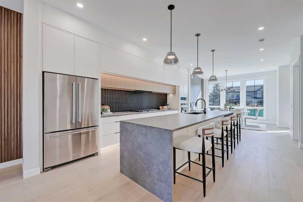 This upscale infill blends high-end design with everyday practicality, offering a legal two-bedroom basement suite (Approved with the development permit by the city) – perfect as a mortgage helper or for extended family! With an open-concept main floor, a luxurious primary suite, and a prime inner-city location, this home is built for both comfort and convenience! Step inside to a bright, welcoming foyer where sleek finishes and warm wood tones on the built-ins set the stage before leading to a sun-filled dining room at the front of the home. Large windows bring in natural light, making this space perfect for hosting or casual meals. The chef-inspired kitchen sits at the heart of the home, featuring ceiling-height custom cabinetry, dark grey countertops, a waterfall-edge island with oak accents and LED skirt lighting, plus a high-end appliance package. A seamless flow into the living room makes entertaining effortless – cozy up by the floor-to-ceiling grey porcelain tile gas fireplace, framed by custom shelving with warm LED accent lighting. Off the main space, a mudroom with built-ins keeps things organized, offering direct backyard and garage access. A sleek powder room is tucked away nearby, along with a main floor office – ideal for working from home, complete with a large window and built-in desk. Head upstairs, where a spacious bonus room greets you at the top of the stairs. Whether it’s a cozy movie night spot, a play area, or a second lounge, this flexible space adapts to your needs. The primary suite is a retreat you’ll never want to leave, designed with a soft, neutral palette that feels warm and inviting. The spa-like ensuite features a deep soaker tub, a glass-enclosed shower, and a double vanity with designer tile selections throughout. A large walk-in closet with custom shelving completes the space, making it as functional as it is luxurious. Two additional good-sized bedrooms, a sleek main bathroom, and a convenient laundry room with built-in storage complete the upper level. The fully finished legal suite (subject to permits and approvals by the city) is a game changer – offering a bright and modern two-bedroom space with its own entrance. Whether you’re looking for a rental income opportunity or a private space for family, this suite has everything needed for comfortable independent living. It includes an open living area, a stylish kitchen, and a full bathroom with the same high-end finishes found throughout the home. Nestled in Renfrew, this home offers walkable access to Bridgeland’s top cafés, restaurants, and boutiques. Enjoy brunch at Blue Star Diner, fresh groceries from Blush Lane, or a drink at Bridgeland Distillery. Outdoor lovers will appreciate Tom Campbell’s Hill and Bottomlands Park, while families will love being close to St. Alphonsus, Children’s Village, and Colonel Macleod School. Downtown is just 5 minutes away, with quick access to Edmonton Trail, 16th Ave, and Deerfoot Trail.