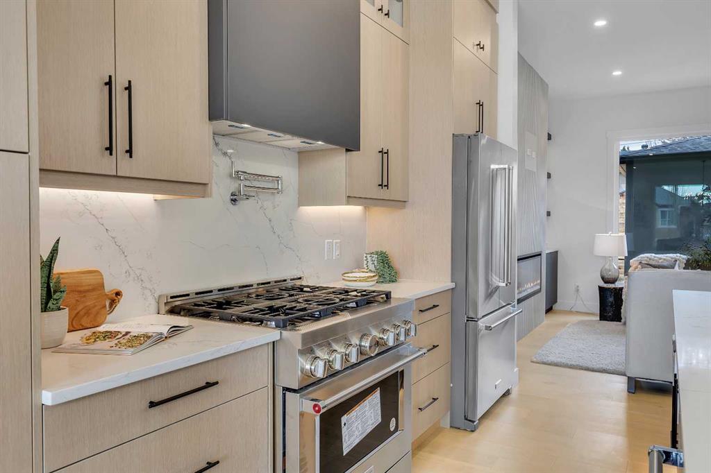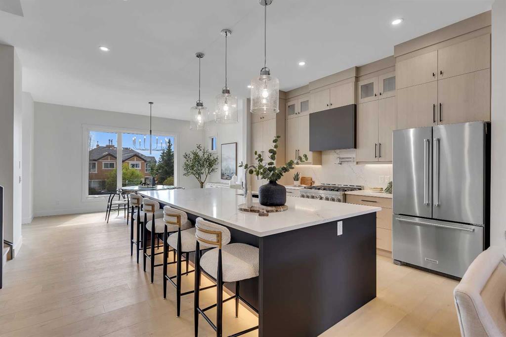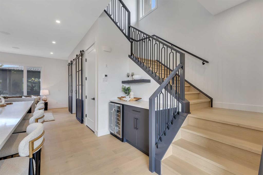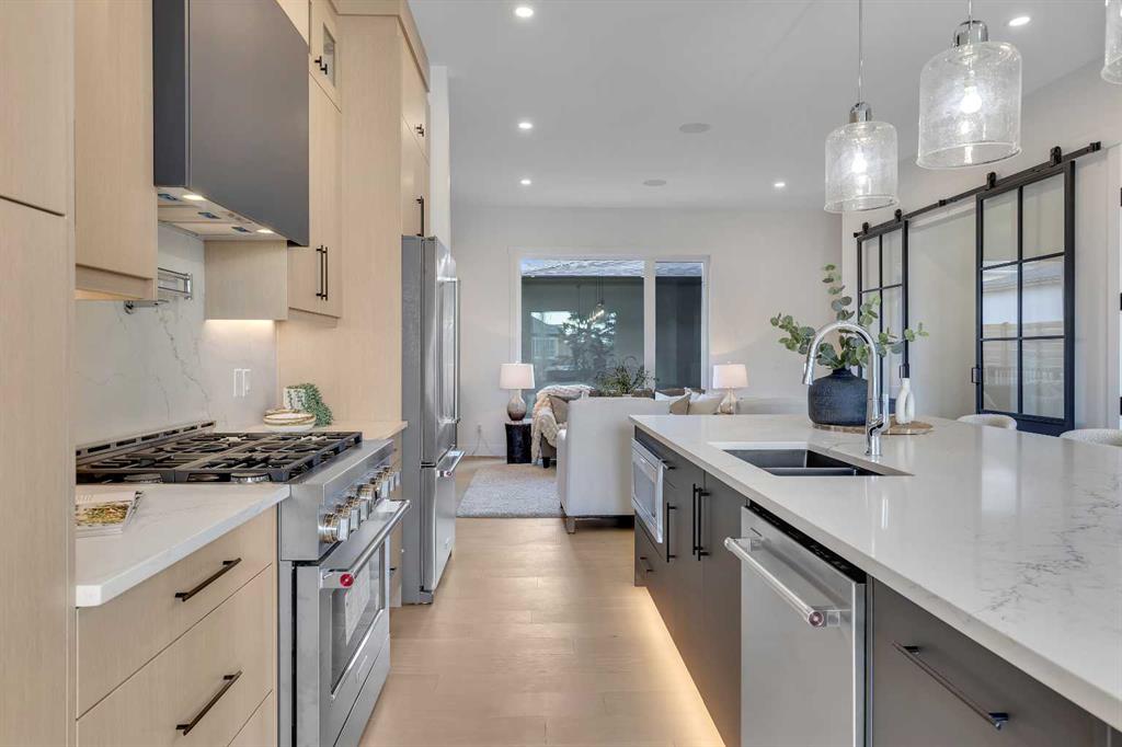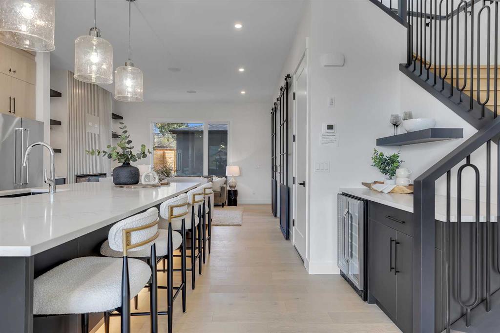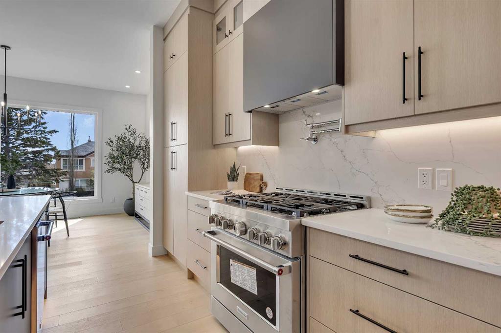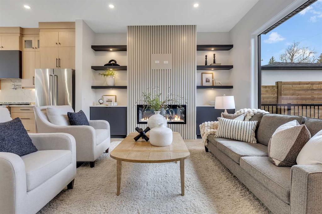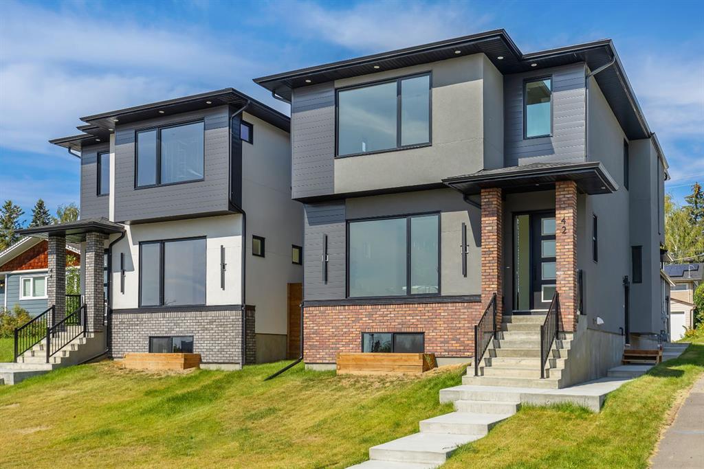 COLLINGWOOD LUXURY CUSTOM HOME | ATTACHED DOUBLE GARAGE | LEGAL 2 BDRM BASEMENT SUITE. Welcome to 42 Collingwood Place. Situated on a 32’ x 100’ lot atop a quiet cul-de-sac in Collingwood Place, this custom-built home features over 3,000 sqft of total living area. Every detail has been meticulously planned for OPTIMAL LIVING. The main floor features 10’ CEILINGS and a bright south-facing dining area to house all your guests over the holidays. The chef’s kitchen is built with an OVERSIZED ISLAND with quartz counters and LED-under-lighting, matching quartz backsplash, full-height cabinetry and a pot-filler above the 36” gas range. A COFFEE BAR with cabinetry and a beverage fridge adds convenience. A private office is secluded by custom French-inspired iron and glass casement sliding doors provides a sanctuary. The living room features an electric fireplace, custom LED shelving, an in-ceiling speaker system, and a powder room near the mudroom which featuring floor-to-ceiling cabinetry for ample gear storage. The ATTACHED double garage is FULLY INSULATED, drywalled, and includes a 200 AMP breaker, and gas heater and EV charger rough-ins. Upstairs, the primary suite offers breathtaking views of DOWNTOWN CALGARY and the ROCKY MOUNTAINS, an expansive walk-in closet, and a dual vanity ensuite with an OVERSIZED SOAKER TUB, STEAM SHOWER with dual niches, and a standalone VANITY COUNTER with a light-up mirror. A frosted glass window provides privacy while allowing in natural light. The laundry room features quartz counters, a sink, and full-height cabinetry. Two additional bedrooms overlook NOSEHILL PARK, each with custom closet built-ins. A main bathroom and linen closet complete this level. All bathrooms (except the powder room) include IN-FLOOR HEATING and LED underlighting. The LEGAL BASEMENT SUITE boasts 9’ ceilings, a spacious kitchen, a large living area, and TWO BEDROOMS. The suite comes with a full kitchen / laundry appliance package. The mechanical room features TWO furnaces, an A/C unit for the main, a sump pump, radon rough-in, and an oversized hot water tank. The private courtyard-style backyard (vinyl decking) includes outdoor speaker rough-ins and a gas outlet for a BBQ or fire table. CONFEDERATION PARK is just steps away to the south, with Nose Hill Park to the north. Short walk to Collingwood elementary school , St. Francis High School & bus stops, plus easy access to downtown. Close to all amenities—Calgary Winter Club, shopping malls, U of C, Children and Foothills Hospitals. This home blends urban convenience with natural beauty and offers downtown & mountain views. Fully hardwired for security systems and cameras, it also qualifies for CMHC’s 30-year amortization and GST rebates—check with your lender/accountant! Built by Archway Developments, a family-owned business with 20+ years of experience, this home is backed by Progressive New Home Warranty.