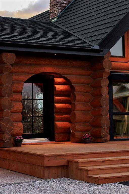 The house and garage feature durable Allura siding designed to complement the log elements, topped with premium metal DECRA shingles. Front and rear cedar patios have been refinished, while engineered drainage, new sod, auto gate, and a gravel drive enhance both function and curb appeal. The garage has been fully updated with epoxy floors, new doors, heating and lighting.