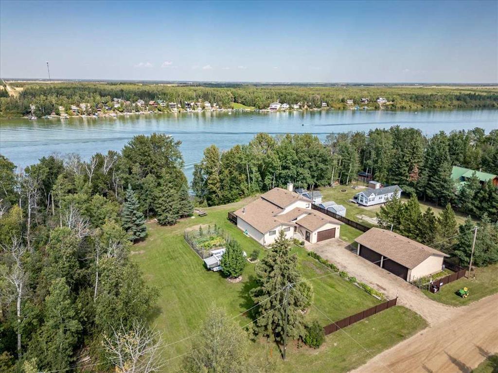 This Magnificent Property with Lakefront Access and Views holds a 2250 sq/ft Home with a Double Attached Garage, Quadruple Detached Garage, and More! Inside the home the Main Level is made up of Two Bedrooms, Living room with a wood fire place on a stone wall, Kitchen that is open to the Dining room with a vaulted ceiling, and Family room with another fireplace. A Walk-In Pantry, Laundry/Utility Room, and a 4 Piece Bathroom Conclude the Main floor. The Upper Level has the Primary Bedroom that has its own 4 Piece Ensuite Bathroom, Walk-In Closet, and an Office. This Home is Wheelchair accessible from the Attached Garage with a lift and from the large back deck that over looks the lake through the patio doors into the Living room and Family room. The Detached Garage measures 36\'x28\' has a Concrete floor, Heat, Power, and Two Overhead Doors. This Property Welcomes you to enjoy the lake year round with extra storage for toys of every season!