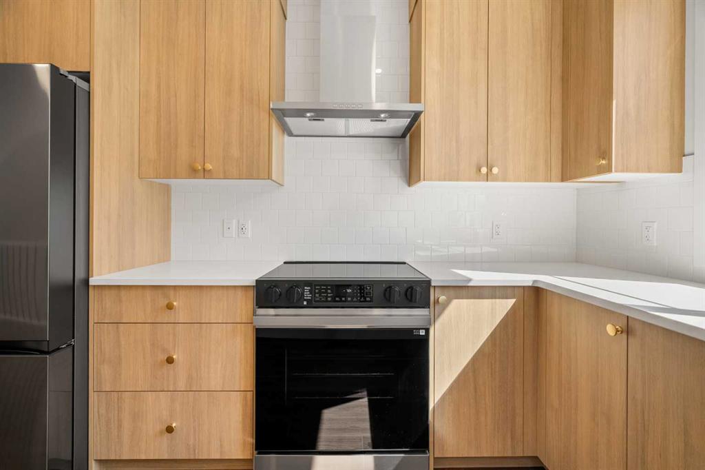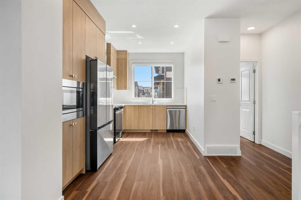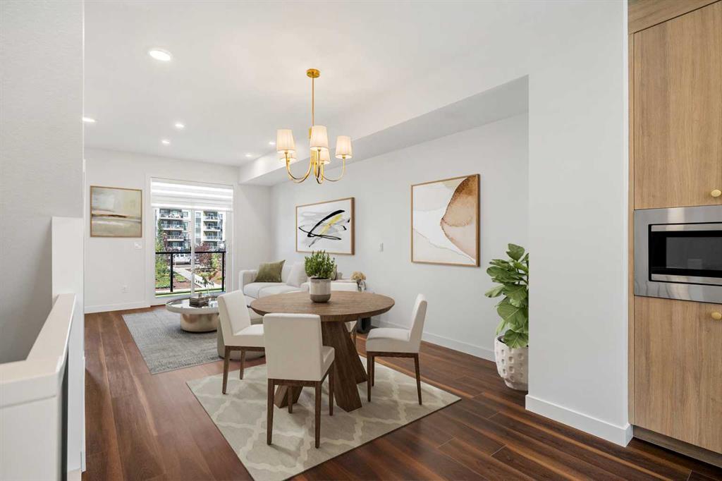The bright and open main floor features a semi built-in kitchen with sleek quartz countertops, a gas line to the range, stainless steel appliances, and warm wood cabinetry. The adjacent dining and living area is enhanced with extra lighting, creating a welcoming atmosphere perfect for entertaining or relaxing. Step outside onto your balcony for morning coffee or evening barbecues with the added convenience of a gas line hookup.