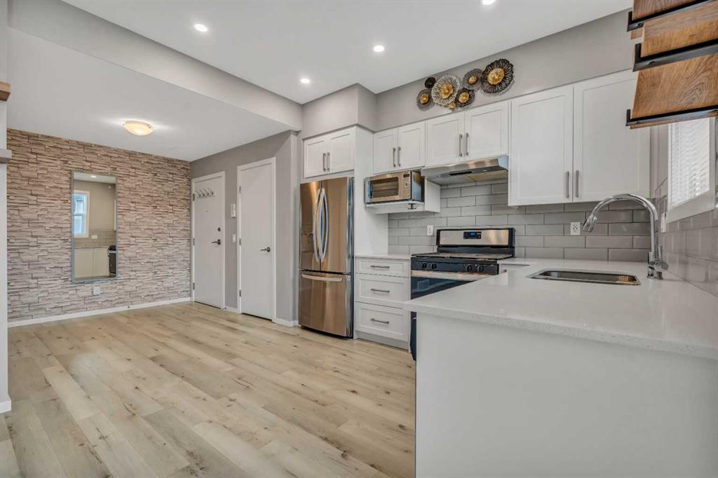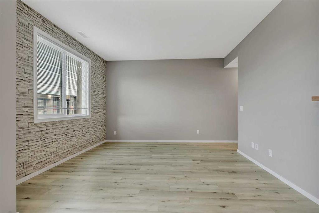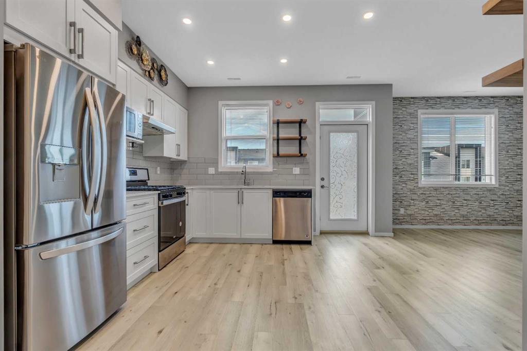 FRONTS ONTO COURTYARD WITH PLAYGROUND & PERGOLAS | END UNIT WITH ATTACHED GARAGE & DRIVEWAY | 2 BED & 2.5 BATH | BBQ GAS LINE | LOW CONDO FEE\'s! This stylish end-unit townhome in Redstone combines smart design with everyday comfort, making it an appealing choice for both homeowners and investors. Overlooking a beautifully landscaped courtyard with a playground and pergolas, it offers a setting that blends connection and convenience. The main floor is finished with durable LVP flooring and a neutral palette that enhances the open concept layout. A modern kitchen anchors the space with white cabinetry, subway tile backsplash, stainless steel appliances and a pantry for extra storage, creating a hub that is both functional and attractive. The living area features a stone accent wall and oversized window that frames courtyard views while adding natural light. Extend the living space outdoors to a glass-railed deck with a gas line for BBQs, ideal for hosting gatherings or relaxing in the evening. A well-placed powder room completes this level. Upstairs, two generously sized primary bedrooms each include a private four-piece ensuite, providing both privacy and flexibility for families or roommates. Convenient upper laundry adds everyday practicality. Parking is made simple with an attached insulated and drywalled single garage plus a driveway, while ample visitor parking throughout the complex ensures ease for guests. Families will appreciate the direct access to Redstone View Lake with its pathways and natural spaces, along with proximity to new schools, playgrounds, and community amenities. Investors will value the low condo fees, modern finishes and strong rental appeal of a dual primary suite layout. Redstone’s location offers excellent connectivity with quick routes to Metis Trail, Stoney Trail, Country Hills, Costco, CrossIron Mills, and Calgary International Airport. Whether you are looking for a home that supports modern family living or an investment that balances function with long-term value, this end unit presents an outstanding opportunity!