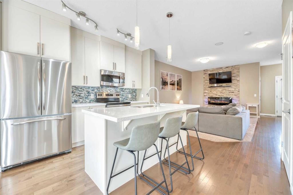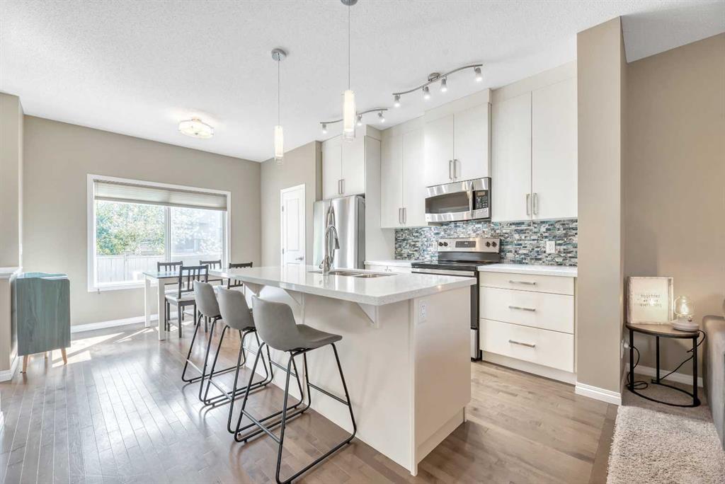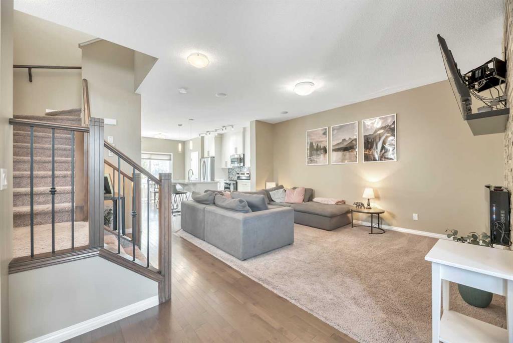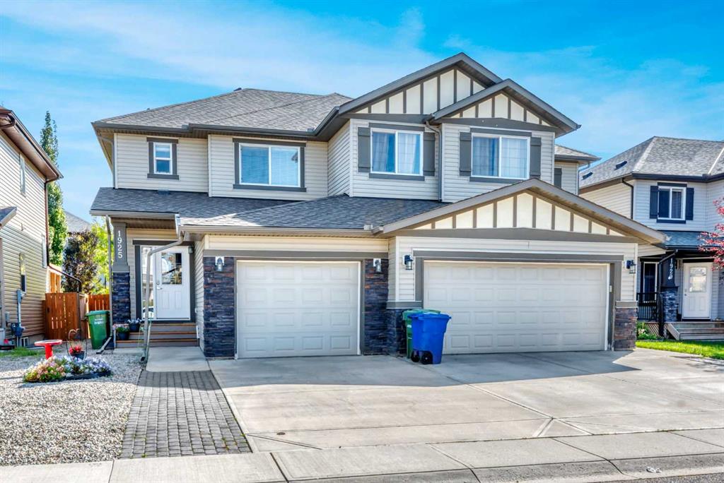 Back-on-Market due to Buyer Financing | HUGE BACKYARD & Perfect for Entertaining PLUS FULLY DEVELOPED BASEMENT! INCREDIBLE VALUE! Welcome to this stylish semi-attached duplex in the family-friendly community of Bayside, Airdrie. This home offers 3 bedrooms and 3.5 bathrooms, including a primary suite with walk-in closet and private ensuite, plus 2 additional bedrooms and a full bath on the upper level. The main floor features hardwood throughout, a bright living room, dining nook, and a modern kitchen with quartz countertops, stainless-steel appliances, a central island, and pantry—perfect for everyday living and entertaining. The fully developed basement includes a den, a huge recreation space and another full bathroom plus a laundry room. Outside, enjoy a private fenced backyard with a deck and low-maintenance landscaping, as well as a welcoming front yard. A single attached garage with parking for two more vehicles on the driveway adds convenience. Ideally located near parks, schools, and amenities, this Bayview property is a must-see!