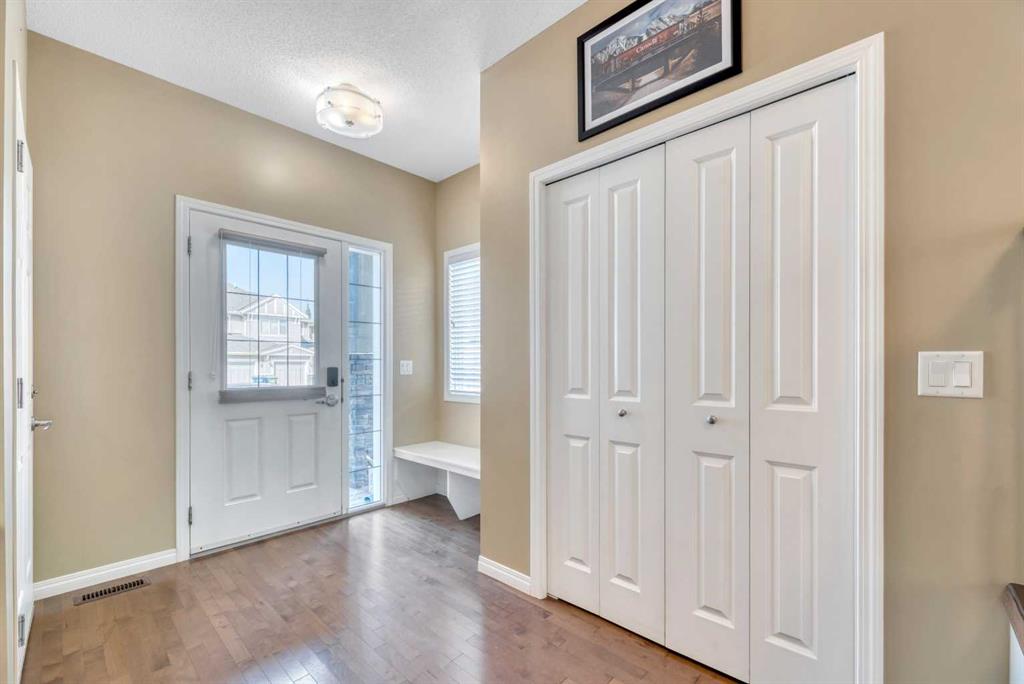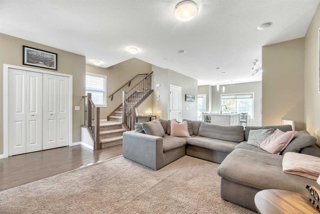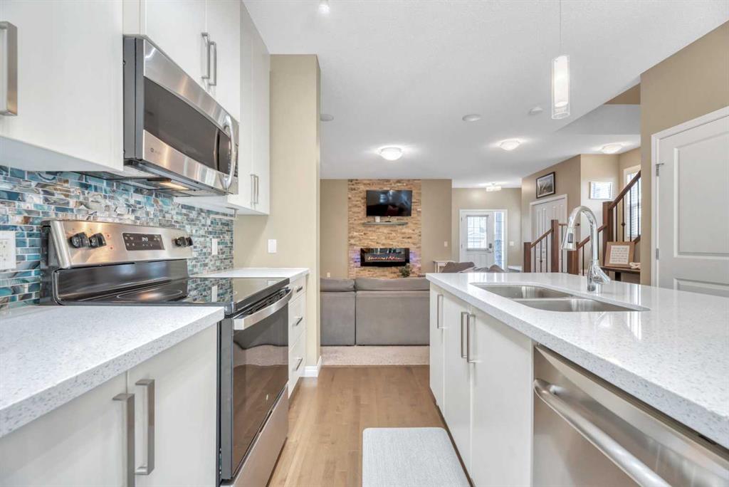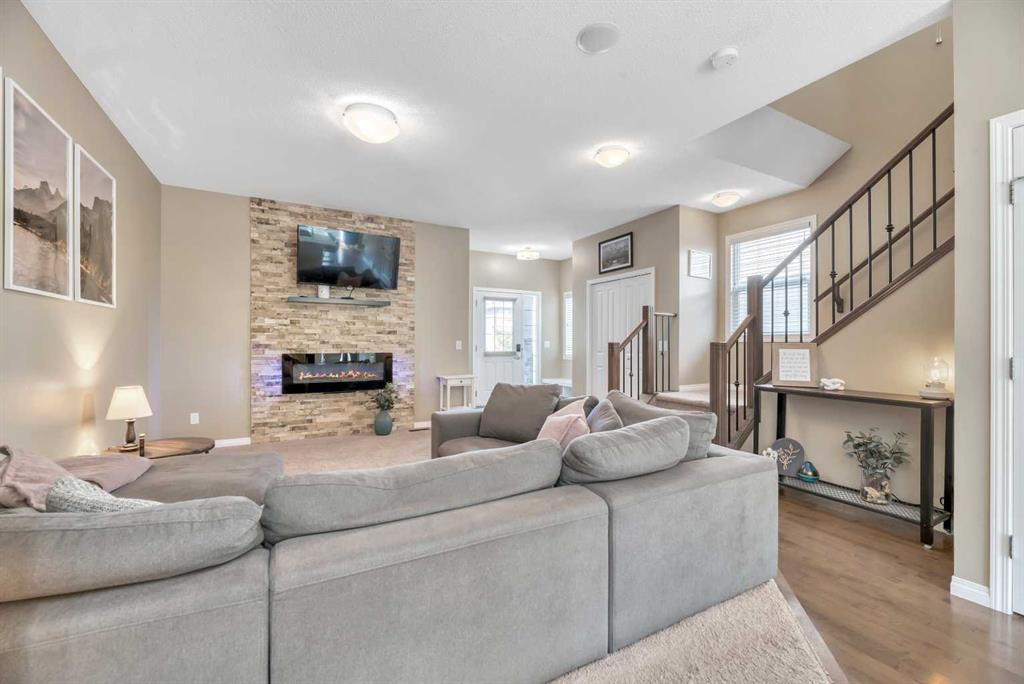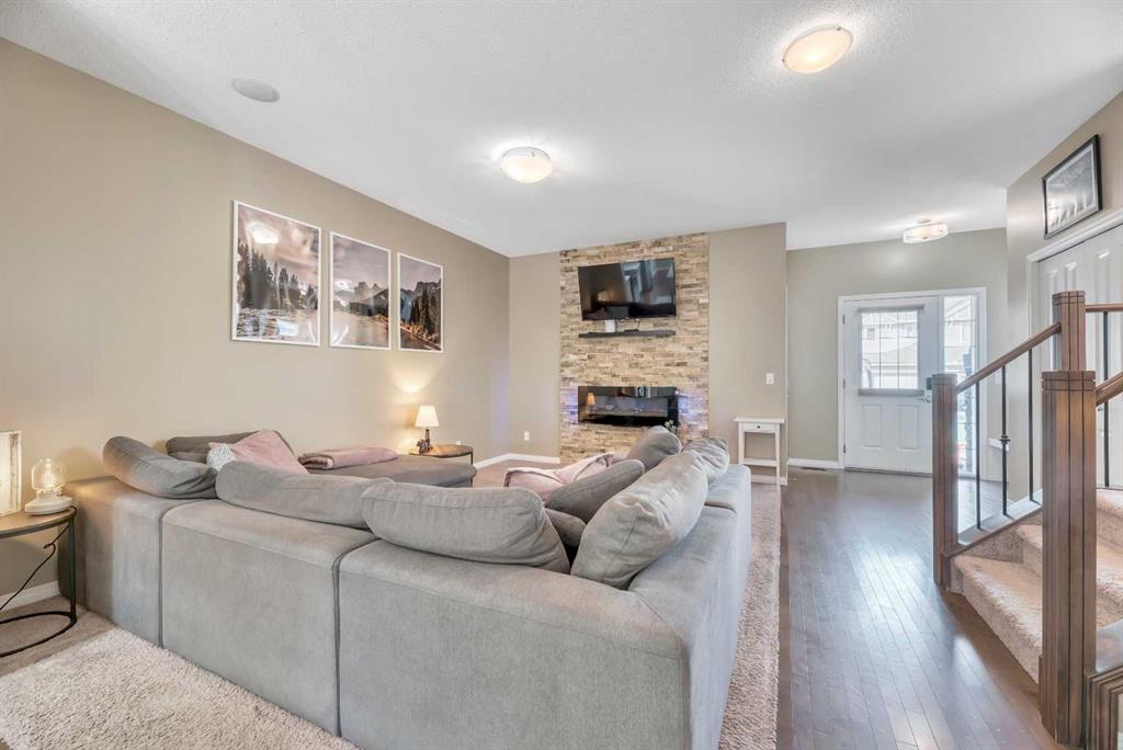 Back-on-Market due to Buyer Financing | HUGE BACKYARD & Perfect for Entertaining PLUS FULLY DEVELOPED BASEMENT! INCREDIBLE VALUE! Welcome to this stylish semi-attached duplex in the family-friendly community of Bayside, Airdrie. This home offers 3 bedrooms and 3.5 bathrooms, including a primary suite with walk-in closet and private ensuite, plus 2 additional bedrooms and a full bath on the upper level. The main floor features hardwood throughout, a bright living room, dining nook, and a modern kitchen with quartz countertops, stainless-steel appliances, a central island, and pantry—perfect for everyday living and entertaining. The fully developed basement includes a den, a huge recreation space and another full bathroom plus a laundry room. Outside, enjoy a private fenced backyard with a deck and low-maintenance landscaping, as well as a welcoming front yard. A single attached garage with parking for two more vehicles on the driveway adds convenience. Ideally located near parks, schools, and amenities, this Bayview property is a must-see!