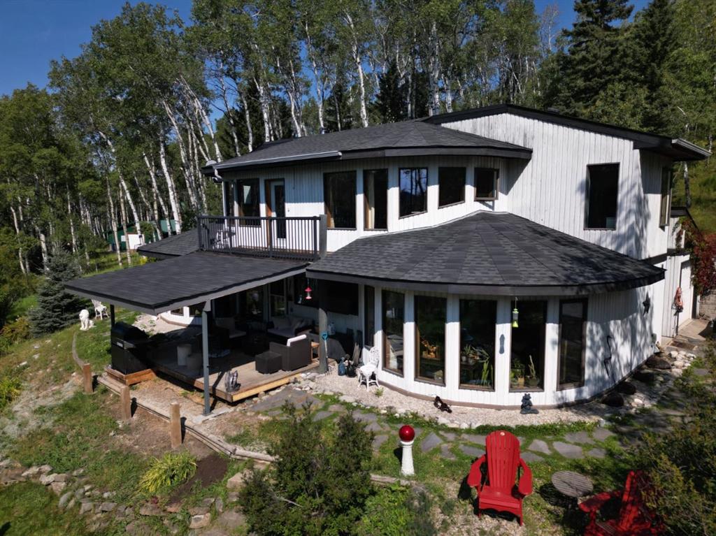 An acreage with so much potential! This property features a unique home, a great location, a large workshop, a pond, and a hilltop with amazing views of the foothills and 3 valleys that could be another building site. The 23 acre property is conveniently located 10 minutes south of Bragg Creek, and very close to 320 acres of crown land. The house features very unique architecture, with curved walls and lots of windows. The main floor has a recently built custom kitchen with large island, a living area wrapped around with a curved wall, an office (or study room), a recently refinished bathroom, and a large bedroom. The upper floor features a primary bedroom with en suite bathroom, a workout or seating area, access to two decks, and a large walk-in dressing area and closet. The house has a large single car garage currently being used for storage. The location is quite private with a long driveway that winds past a picturesque pond that would be great for skating in winter. The workshop is quite large and would be a great place for setting up any number of crafty activities or could be converted into a larger garage. One end of this workshop has an integrated studio & green house space. This home could be the coolest little weekend getaway or artist retreat, or could be a great second residence while you build a smaller house up on the ridge to take advantage of the amazing views. Come and picture the possibilities today!