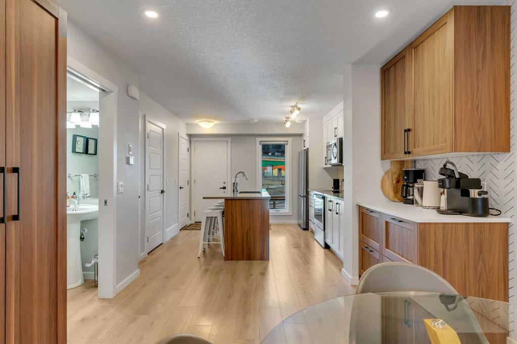 Welcome to 312, 19500-37 Street SE. A beautifully maintained, energy-efficient townhome in the sought-after Zen Urban District, ideally located in the vibrant heart of Seton. Offering over 1,500 square feet of thoughtfully designed living space across three levels, this home features 3 bedrooms, 2.5 bathrooms, and an incredible private rooftop patio with stunning mountain views. The open-concept main floor welcomes you with durable laminate flooring, a spacious living area, and a bright dining space that flows seamlessly into the modern kitchen. The kitchen boasts updated white cabinetry with a stylish blue-tone island, quartz countertops, a custom coffee station with additional uppers, stainless steel appliances, and an island with seating, all overlooking a fenced backyard. Upstairs, the primary suite features a 3-piece ensuite and a large closet, while the generous second bedroom is steps from a modern 4-piece bathroom. A convenient laundry closet is also on this level. Head up to the third floor to find a versatile loft-style third bedroom or flex space—perfect for a guest room, home office, TV room, or gaming area—along with direct access to the rooftop patio. Additional features that set this home apart include air conditioning for year-round comfort, designer wall treatments and upgraded window coverings for a polished aesthetic, and modern finishes throughout that make the home feel fresh and contemporary. It shows like new, reflecting the care and pride of ownership. Located in a prime interior spot within the complex, the home offers added privacy and quiet. Plus, with ZEN’s EnerGuide™ rating, you\'ll benefit from an average of 36% energy savings each month, ensuring long-term value and efficiency. Live steps from the South Health Campus, shops, restaurants, cafes, fitness facilities, a movie theatre, and all the amenities that make Seton one of Calgary’s most dynamic communities.