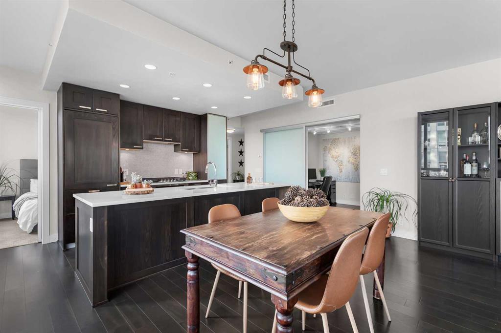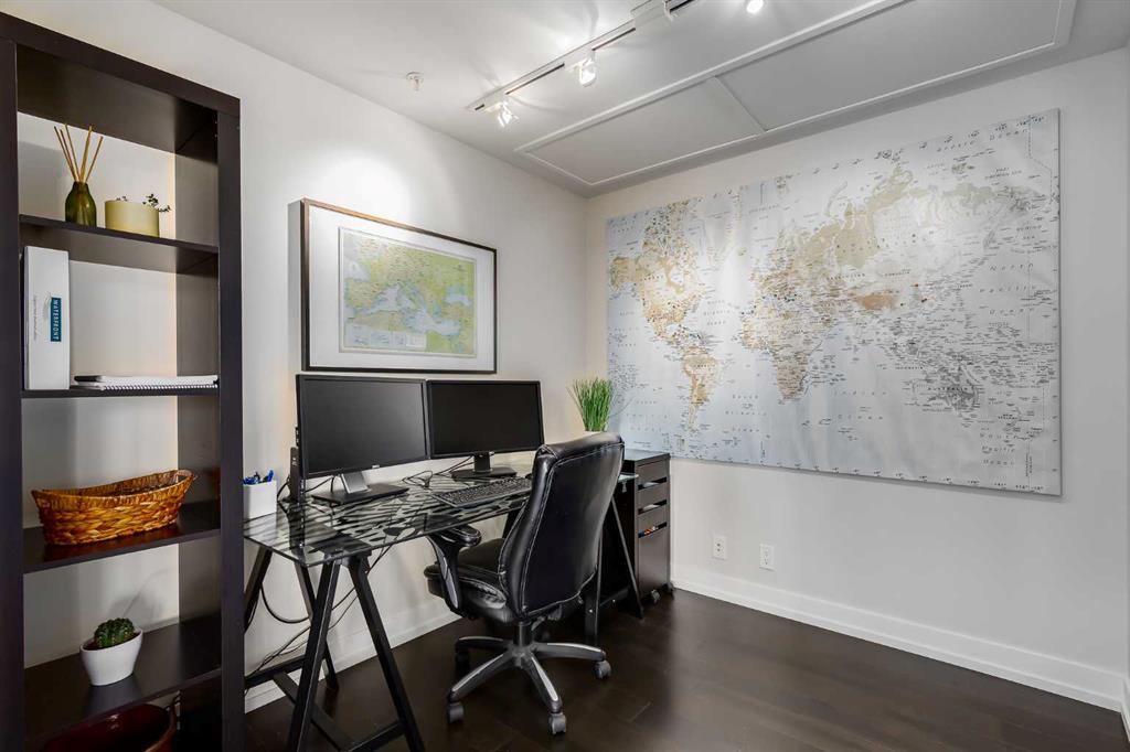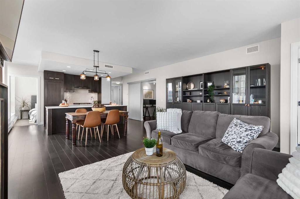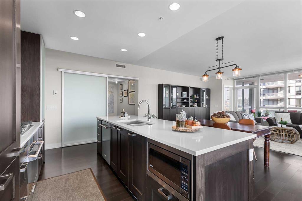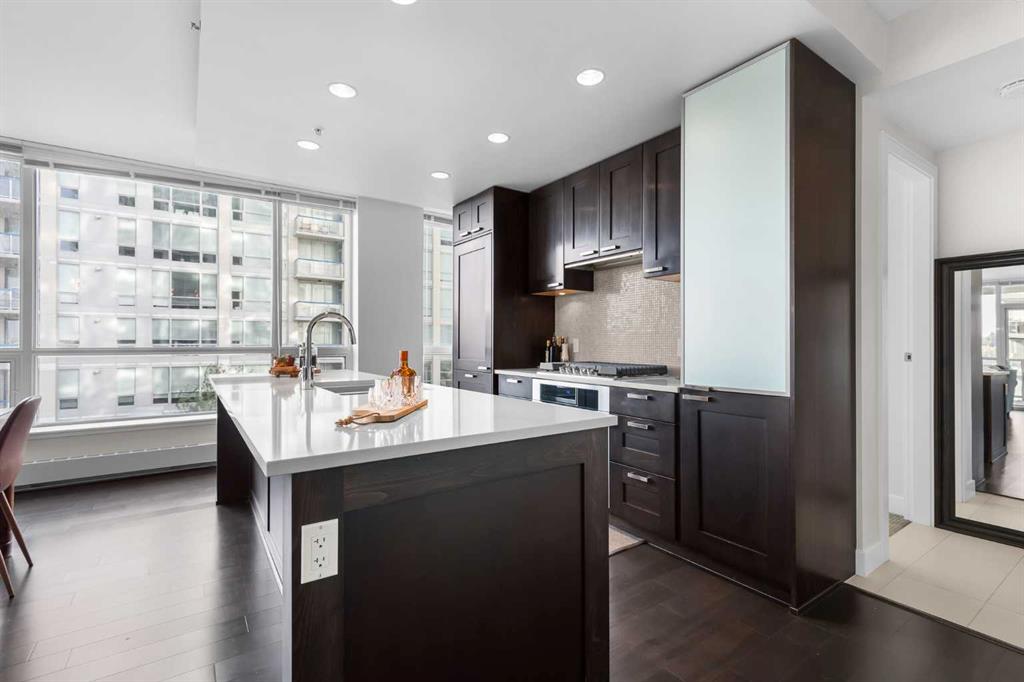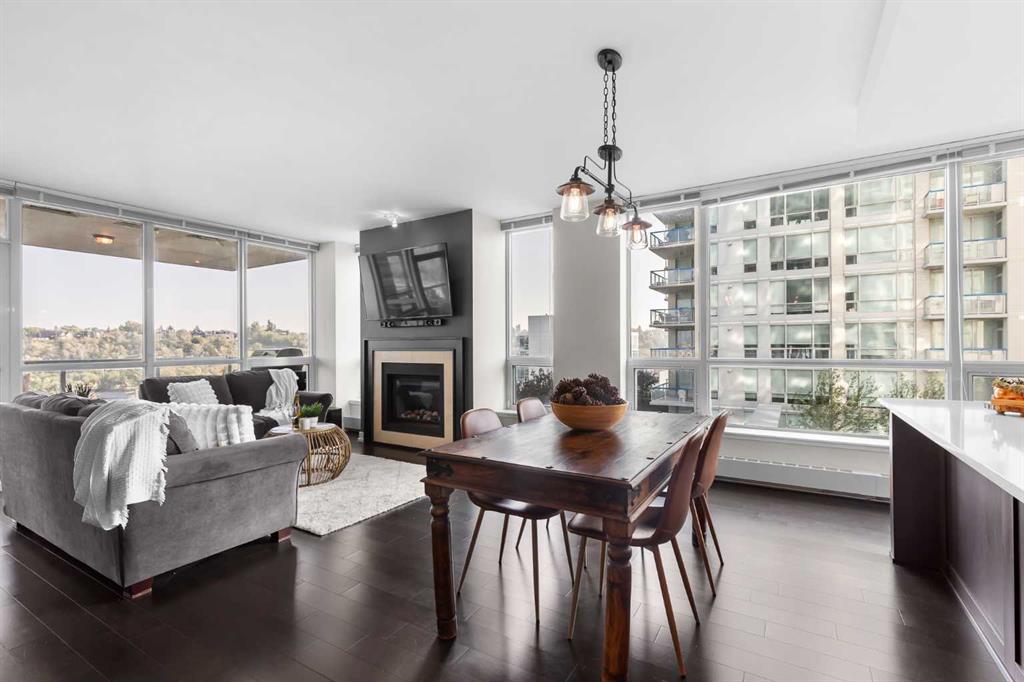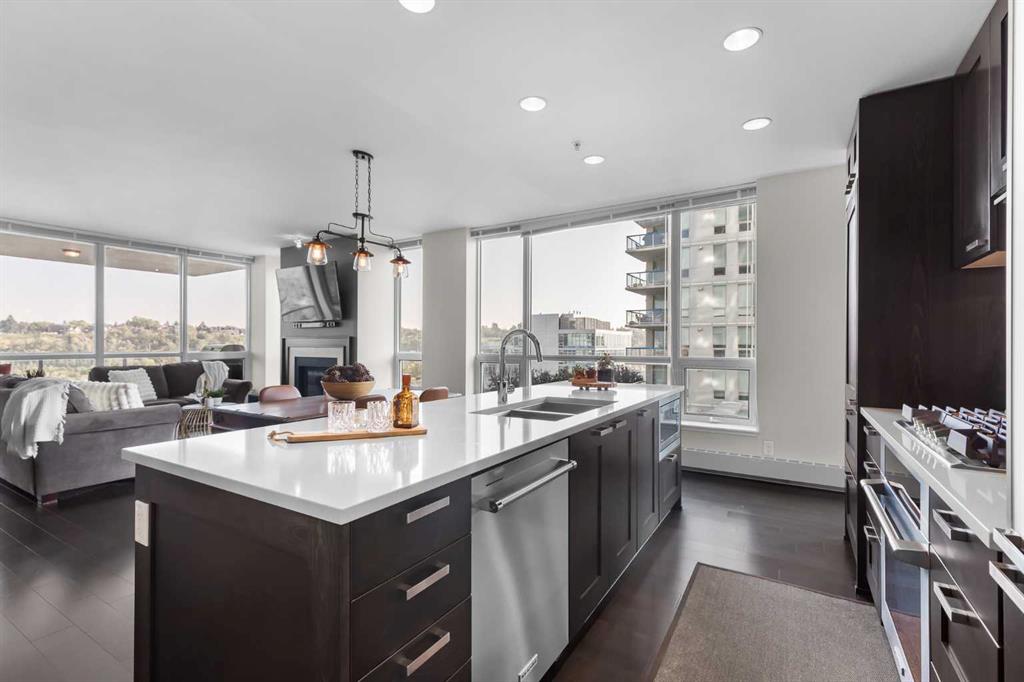 This 9th floor corner unit at Waterfront offers two bedrooms, two bathrooms, and a private office, all with impressive views of the Bow River. With over 1,100 square feet of thoughtfully designed living space, the residence combines functionality with upscale finishes for an elevated downtown lifestyle. The open-concept layout is enhanced by 9-foot ceilings and expansive windows that fill the home with natural light, extending across the main living, dining, and kitchen areas finished with rich hardwood flooring. The kitchen is designed with high-end finishes, including quartz countertops, a brand-new gas cooktop, premium built-in refrigerator, integrated microwave, stainless steel appliances, and a large island that provides both functionality and style for meal preparation, casual dining, or entertaining. Adjacent to the kitchen, a defined dining area flows into the living room, where a gas fireplace creates a warm focal point. From both the living room and primary suite, enjoy unobstructed views of the Bow River. The primary retreat features a walk-through closet and a spa-inspired five-piece ensuite, complete with dual vanities, a glass-enclosed shower, and a deep soaker tub designed for ultimate relaxation. A second bedroom is located on the opposite side of the unit for privacy and is paired with its own three-piece bathroom. Completing the layout is a full-sized laundry room with additional storage, and a separate office with sliding doors—ideal for working from home. Step outside to a generous covered balcony with a gas line for barbecuing and plenty of room for outdoor seating, all while enjoying south and east-facing views over the river and downtown. Comfort is further enhanced by central air conditioning, and the unit comes with two heated underground parking stalls plus a storage locker. The Waterfront development is known for its extensive amenities, designed to meet a wide range of lifestyles. Residents benefit from 24-hour concierge and security, a fully equipped fitness centre with yoga studio, whirlpool, and steam rooms, as well as a private theatre and owners’ lounge with pool table, televisions, and a kitchen. Additional conveniences include car wash bays, guest suites, bike storage, landscaped courtyards, and an outdoor garden patio. At street level, a selection of shops and services—including a coffee shop, restaurant, and hair studio—add to the everyday ease of living here. Beyond the building, the Bow River pathways, Prince’s Island Park, Sien Lok Park, and Chinatown are steps away, offering a balance of recreation and dining options. The C-Train, downtown offices, the public library, Stephen Avenue, and a variety of restaurants and shopping destinations are all within walking distance, making this an ideal home for professionals or anyone seeking convenience in the heart of the city. Take advantage of your opportunity to see this incredible property in person—book your showing today! Check out the floor plans and 3D tour for a closer look!