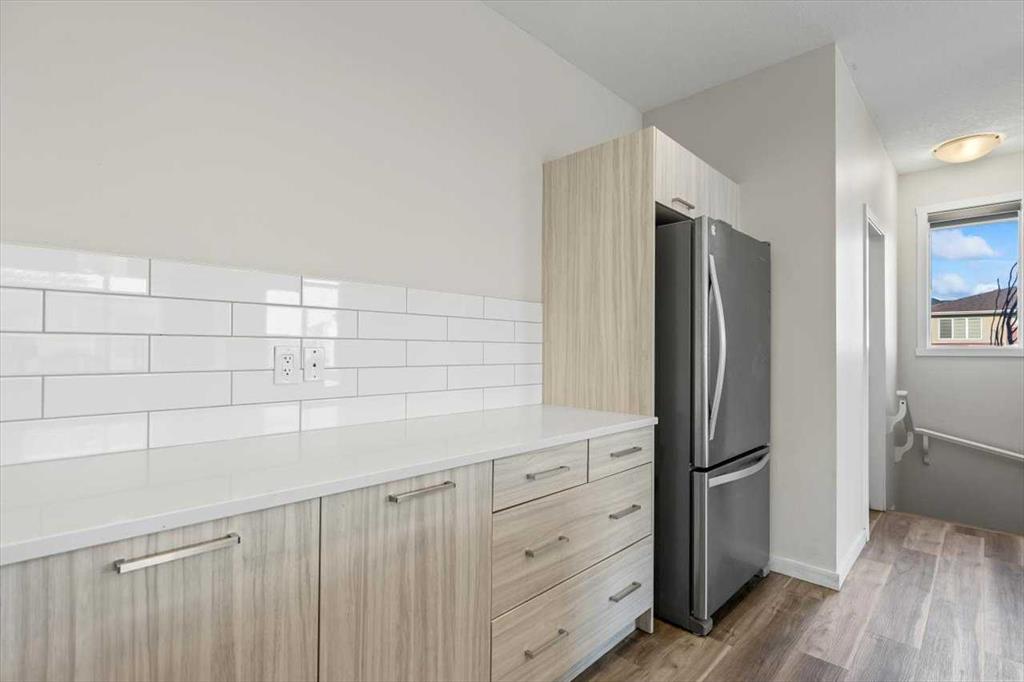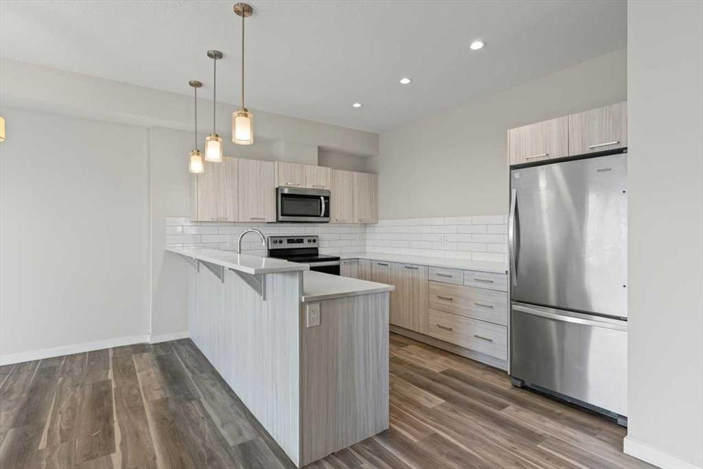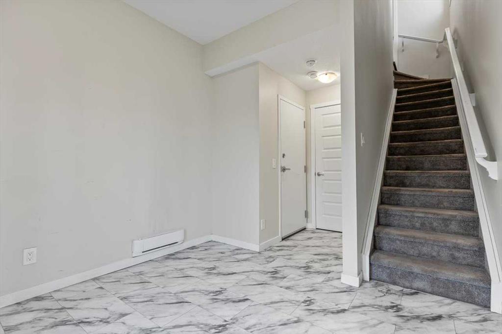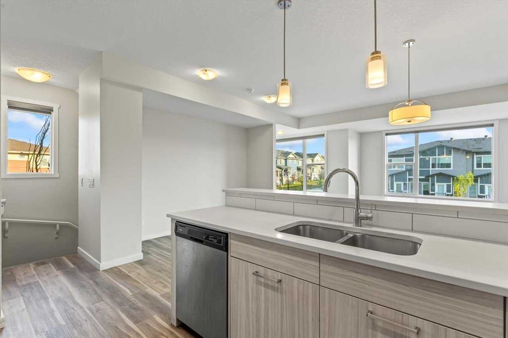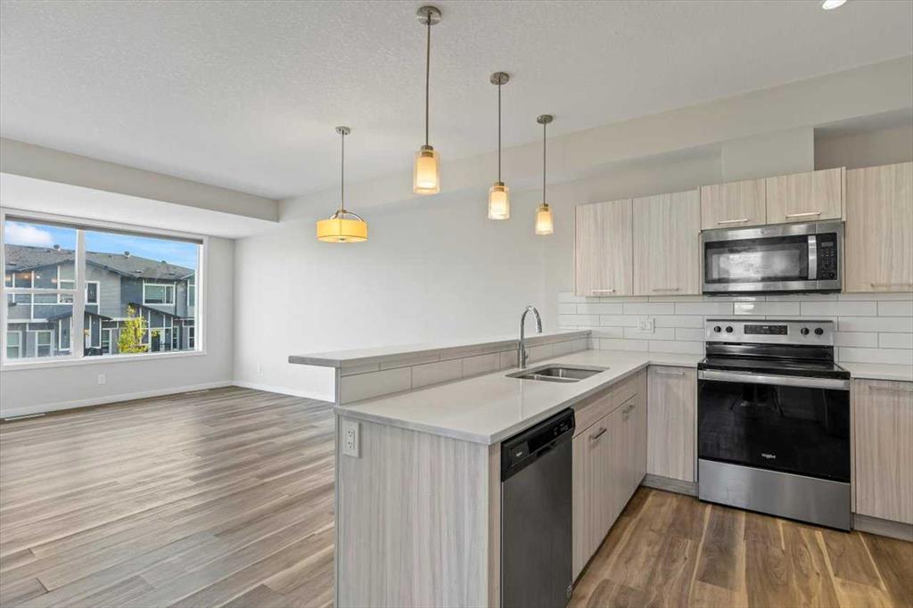 End Unit Townhome | Single Attached Garage + Full Driveway | 3-Storey | 2 Bedrooms | 2.5 Bathrooms | Upper Level Laundry | 1,534 SqFt | Open Floor Plan | Quartz Countertops | Stainless Steel Kitchen Appliances | Breakfast Bar | Ample Cabinet Storage | Bright Natural Light | Large Windows | High Ceilings | Sizeable Bedrooms | Incredible Location | Close to All Amenities | Near Saddlestone Pond & Walking Path | Minutes to CBE Hugh A Bennet School | Great Transit Access. Welcome to this stunning end unit 3-storey townhome with an open floor plan complimenting it\'s large living space. Step up to a gorgeous exterior with a private concrete patio great for outdoor living space. The main level opens to a foyer with a hall closet great for an organized area. This level connects you to the single attached garage which holds the utility room. Head upstairs to the 2nd level which holds your main living space. The flow throughout the open floor plan is bright and welcoming with large windows and high ceilings. The kitchen is outfitted with ample cabinet and drawer storage, stainless steel appliances, quartz countertops and a double basin sink. The raised breakfast bar with barstool seating space is perfect for small meals or socializing while you cook. The dining area has a nook which provides a dedicated space for a table or with the open floor plan- choose your own! The living room is south facing with large windows. This level is complete with a 2pc bath. The uppermost level holds 2 sizeable bedrooms, 2 bathrooms and your laundry. The primary bedroom is paired with a walk-in closet and private 3pc ensuite bath. Bedroom 2 is a great size! The 4pc bath on this upper level has a deep tub/shower combo and single vanity with storage below. The stacked washer/dryer set is tucked into a hall closet to not take away from any of your living space. This home is located to perfection! Steps from your home is the saddlelake pond with a walking path. The CBE Hugh A Bennet School is nearby and there\'s great transit access. Hurry and book a showing at this incredible home today!