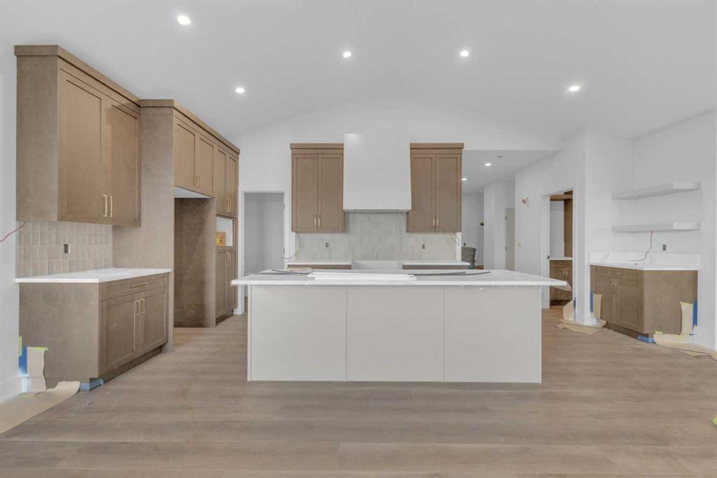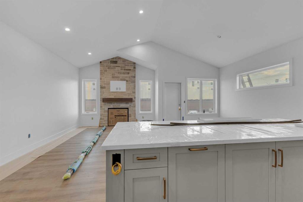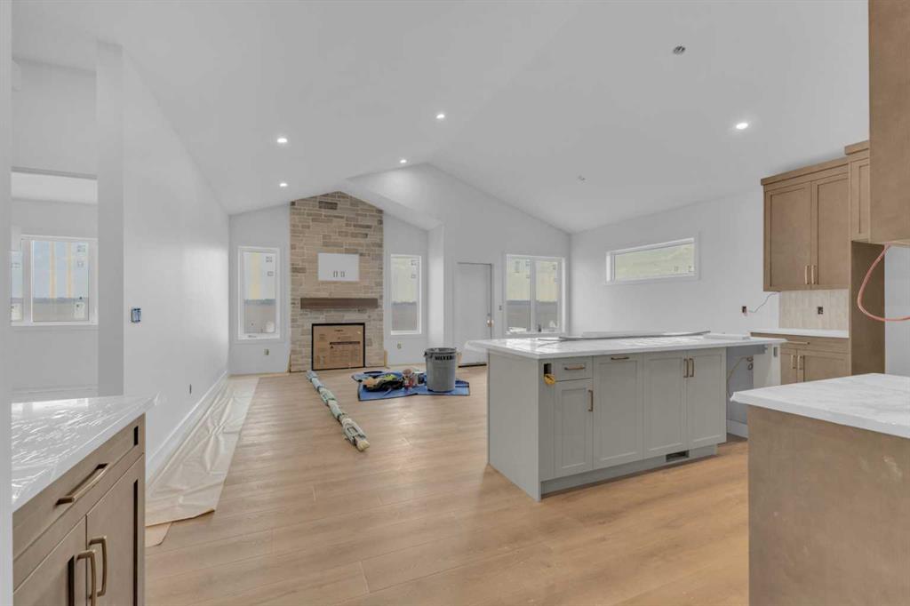 The main floor boasts a stunning open-concept design with a living room, dining area, and kitchen. The kitchen is a true showpiece with custom maple cabinetry with quartz countertops, a covered over-the-range hood, large island, full tile backsplash, under-cabinet lighting, stainless steel appliances (including fridge with water/ice), a walk-in pantry with custom wood shelving, plus a convenient dry bar/coffee bar area with floating shelves. The living room is highlighted by a cozy gas fireplace with stone surround that soars to the vaulted ceiling and windows overlooking the open field. From the dining area, step out through the garden door to the deck and south facing yard.