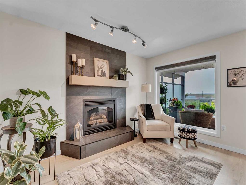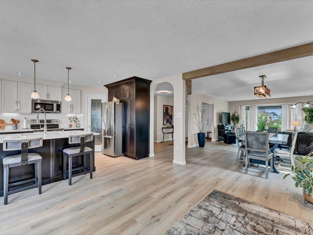 beautifully renovated kitchen, including cabinets, quartz counter tops, under cabinet lightening, new sink, garburator and a new dishwasher. Accompanied by a seating area with a revamped tile and mantle fireplace that walks out to a brand new dura deck covered patio.