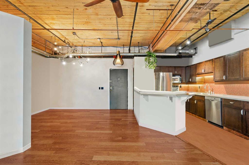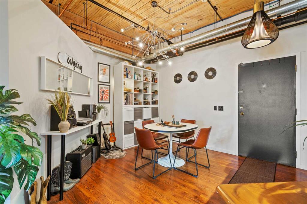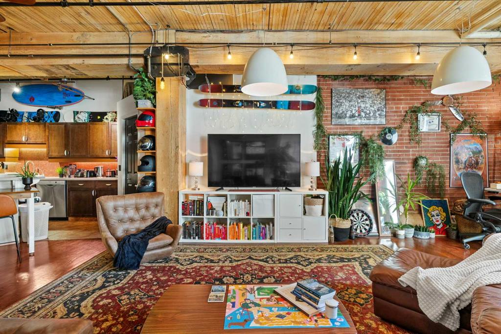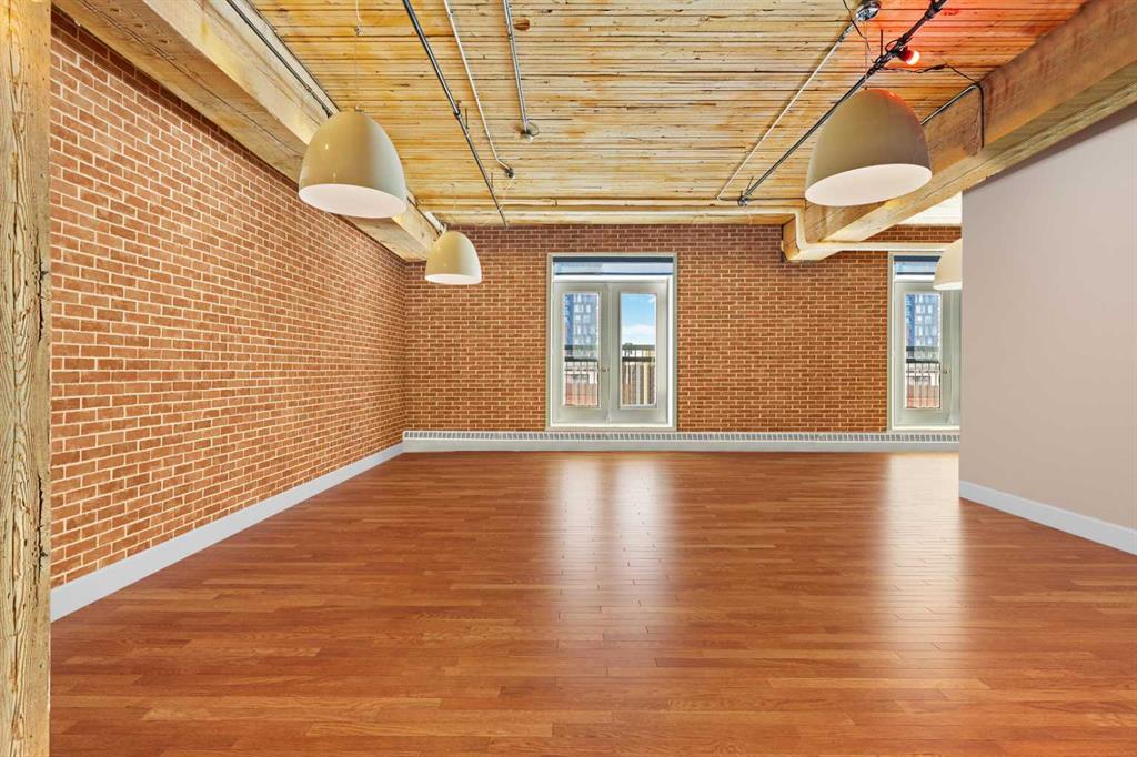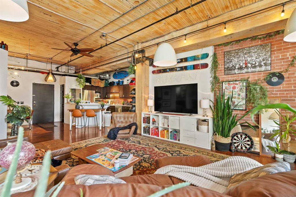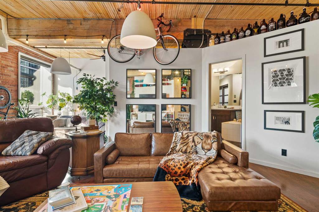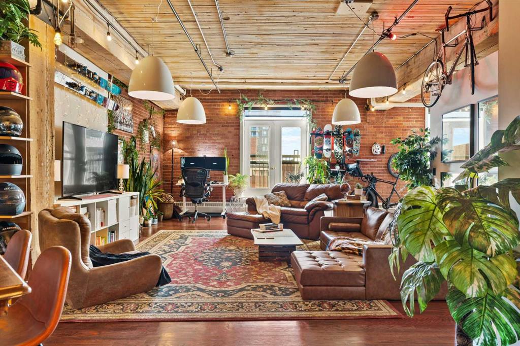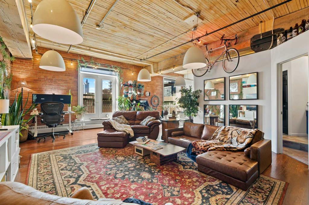 Step inside to discover original fir wood ceilings, exposed beams, brick walls, and piping that give the home its distinctive charm. Large windows and a west-facing Juliette balcony off the living room not only bring in abundant natural light but also provide views of Calgary’s vibrant downtown energy.