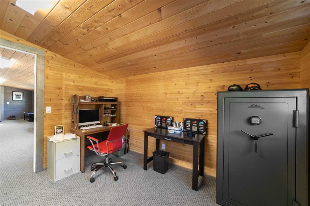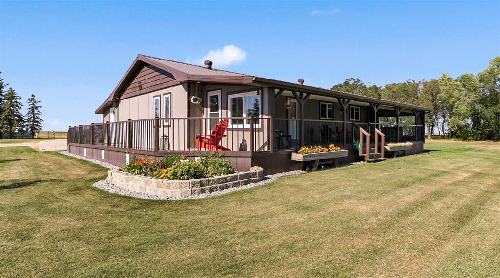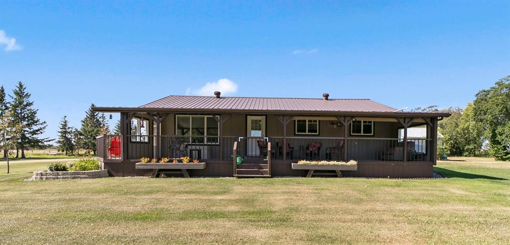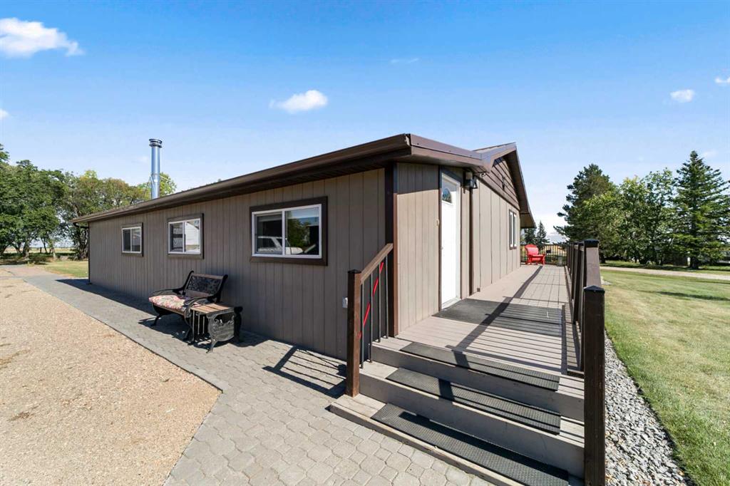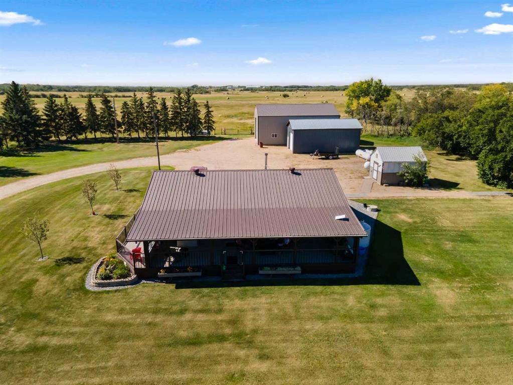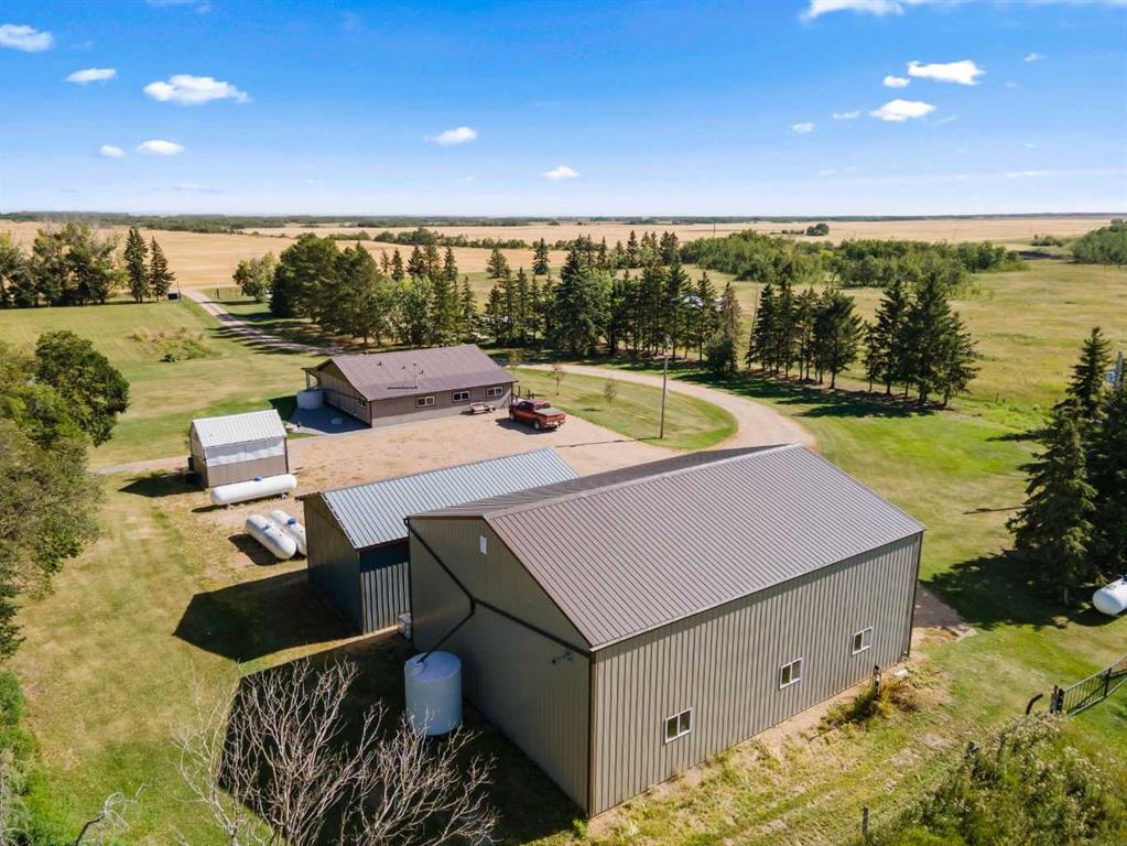 Nestled on 3.66 acres just one mile off Highway 26 and only 30 minutes east of Camrose, this updated acreage offers the perfect blend of comfort and country charm. Since 2016, the home has seen numerous improvements, including a metal roof, windows, doors, flooring, kitchen, bathrooms and more. The bright open floor plan is warm and inviting, highlighted by a covered front deck, hardwood floors with classic wood beams, and a heated, insulated back porch featuring a wood stove that adds cozy character to winter evenings. The main floor includes two bedrooms, with the primary suite offering the convenience of in-room laundry and a private three-piece ensuite. An open kitchen with an island seamlessly flows into the dining area and living room, creating a spacious area for everyday living and entertaining. Downstairs, the fully finished basement provides a family room, storage room, and two generously sized bedrooms, one of which has a window under the deck that does not meet egress code. Mechanical updates include a new furnace in 2016, a hot water tank in 2013, and a reverse osmosis system. The yard is beautifully maintained with mature trees, a garden plot, and a long gated driveway leading into a fully fenced property. Outbuildings are impressive, starting with a 48x36 heated shop equipped with 220V wiring, a drain, ceiling fans, and a 14-foot overhead door. A 20x34 cold storage garage with a 10-foot door and two sheds, one with power and an additional RV plug, adds excellent utility. RV parking, large water tanks, and landscaped grounds make this property as practical as it is welcoming. This is a truly move-in-ready acreage, offering space, functionality, and modern updates in a peaceful rural setting close to Camrose!