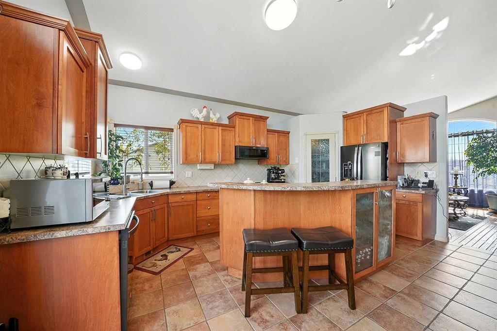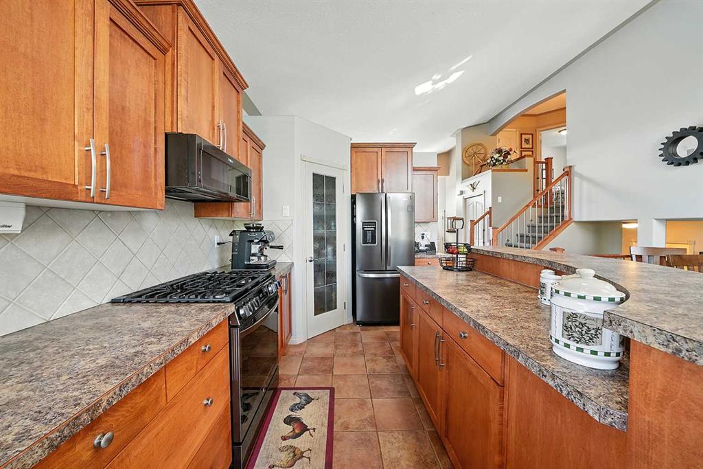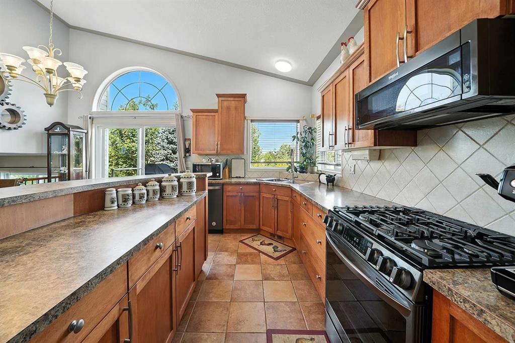 Beautifully maintained former show home is sure to impress! 3 bed+den & 3 bath, over 1831 square feet plus the finished basement, with features such as A/C, heated garage, & a walkout - all while backing onto a large green space that has a paved walking path! From the stamped concrete driveway, to the lush backyard, you are going to appreciate all that this property has to offer. Front living room has large windows, acacia hardwood flooring and vaulted ceilings. The dining area is open to both the family room & the kitchen, where there is maple cabinets, a newer gas stove that\'s properly vented out, a curved island with seating, corner sink, ceramic tile floors, and a double sliding glass door to the no-maintenance deck. You will love spending time out here, admiring the yard and green space through the glass panels and utilizing the gas line for either your BBQ or fire table needs. The upper level of this home features the primary bedroom that has a walk-in closet, and 4 pc ensuite with jetted tub & separate shower. A second bedroom and 4 pc bathroom complete upstairs. New carpet was professionally installed in 2023 on this level. The family room a few steps down from the kitchen has a gas fireplace and patio doors leading to the yard. There is a third bedroom and 3 pc bathroom with laundry that complete this space. Heading down to the basement you\'ll find a large rec space/tv area, den, and a ton of storage room. There is the bonus of underfloor heat as well. One of the water tanks (supplying the house) was replaced in April 2025. The furnace was replaced in November 2024. The attached double garage is insulated and heated by in-floor heat. The owners also added a sink that properly drains with hot/cold tap that will come in handy whether you are cleaning your vehicles or outdoor gear. There are two central vacuums; one in the house and one in the garage. The yard is a key feature - offering privacy, mature landscaping, stone patio, underground sprinklers, and views of the green space. There is a storage shed along the east side of the house & additional storage under the deck. This home is just a few minutes walk to so many amenities (Recovery Lab, Saint Mary Walk-in Clinic, F45, Doctors Eyecare, and Lume Dental to the North and the East Hill shopping centre to the South).