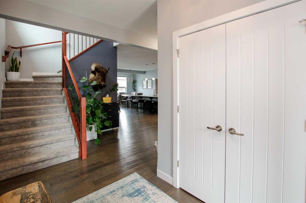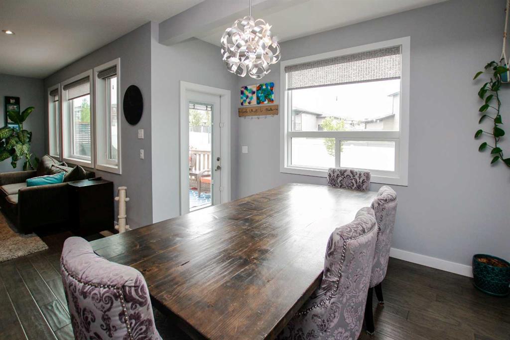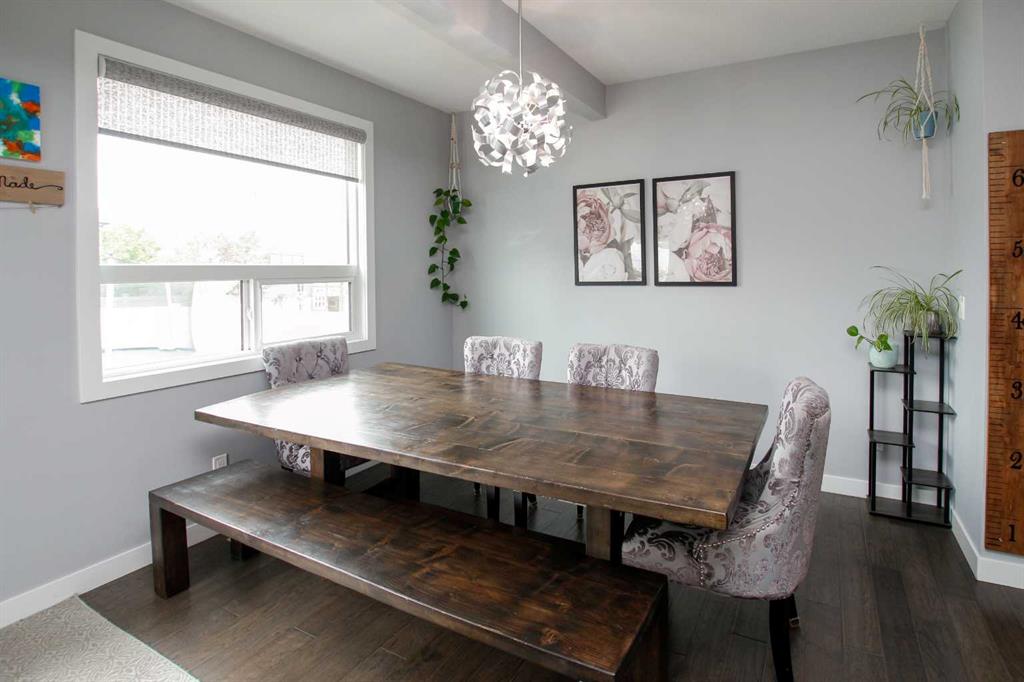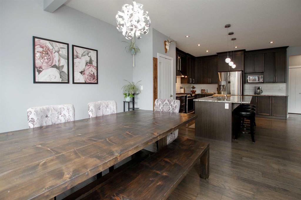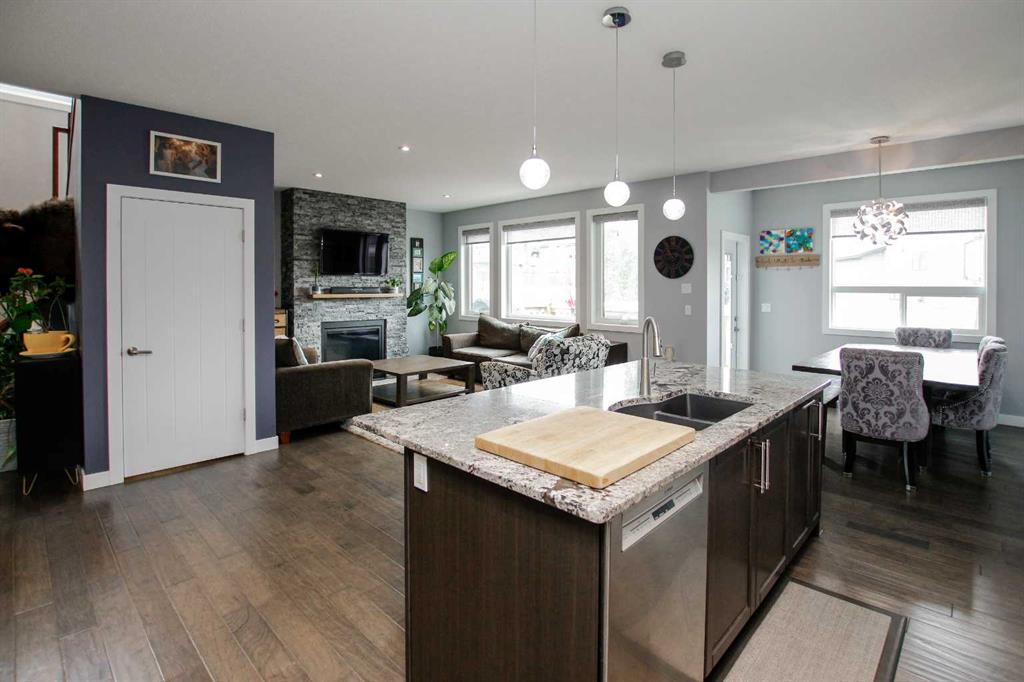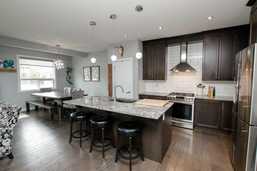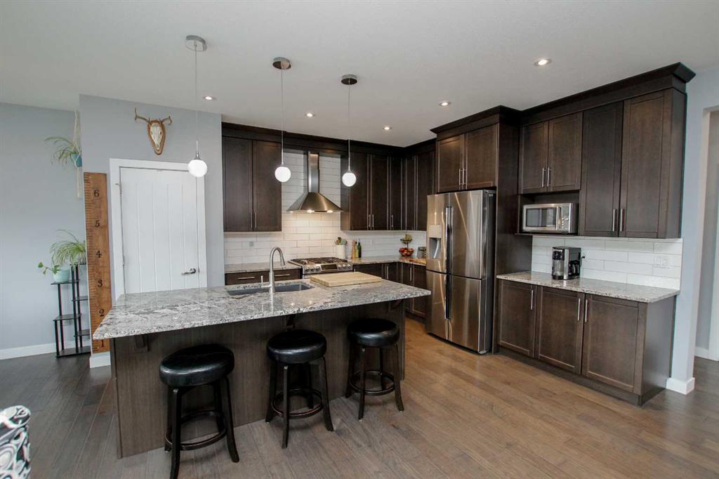 FULLY DEVELOPED 4 BEDROOM, 4 BATHROOM 2-STOREY IN RYDERS RIDGE ~ ORIGINAL OWNER HOME LOADED W/UPGRADES THROUGHOUT ~ SUNNY WEST FACING BACKYARD ~ Landscaped front yard and stone accented exterior offer eye catching curb appeal ~ Covered front entry leads to a large, sun filled foyer ~ Open concept main floor layout is complemented by hardwood flooring and high ceilings that create a feeling of spaciousness ~ The stunning kitchen offers an abundance of dark stained, ceiling height cabinets with crown moulding, endless quartz countertops including a massive island with an undermount sink, eating bar, and pendant lights above, full tile backsplash, upgraded stainless steel appliances and a wall pantry ~ Easily host large gatherings in the spacious dining room featuring large west facing windows and patio door access to the deck and backyard ~ The living room features more large west facing windows that fill the space with natural light and is centred by a cozy gas fireplace with a stone surround and mantle ~ Open staircase leads to the upper level landing, where you will find a spacious bonus room offering a flexible space to suit your needs (media room, home office, playroom) ~ The primary bedroom can easily accommodate a king size bed plus multiple pieces of large furniture, offers a spa like ensuite featuring a massive walk in shower with a tile surround and glass doors, a stand alone soaker tub, quartz topped vanity with dual sinks and a separate water closet, and a huge walk in closet with built in shelving and organizers ~ Two additional bedrooms located on the upper level are both well proportioned and feature walk in closets ~ The fully finished basement has a large L-shaped family room with a wet bar and plenty of space for a games/play room and sitting area, plus a bedroom, 4 piece bathroom, home office nook and space for storage ~ 24\' x 24\' attached garage is insulated, finished with drywall and has over 13\' ceilings ~ The sunny west facing backyard is fully fenced (vinyl), landscaped, has a garden shed, and access to the paved alley that leads to a walking trail and green space with numerous other parks, playgrounds and walking trails close by ~ Located in the award winning Ryders Ridge neighbourhood with tons of great amenities all within walking distance including schools, shopping, dining and medical, plus easy access to the beach/Lakeshore Drive, and the highway ~ Pride of ownership is evident in this well cared for home!