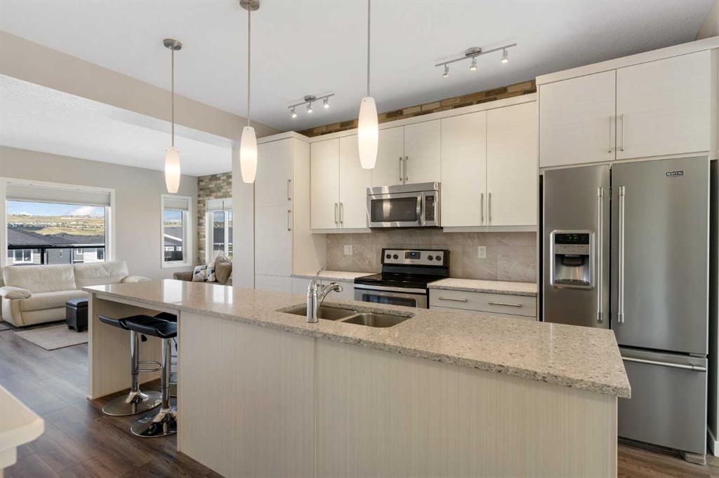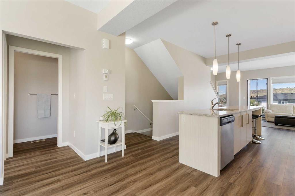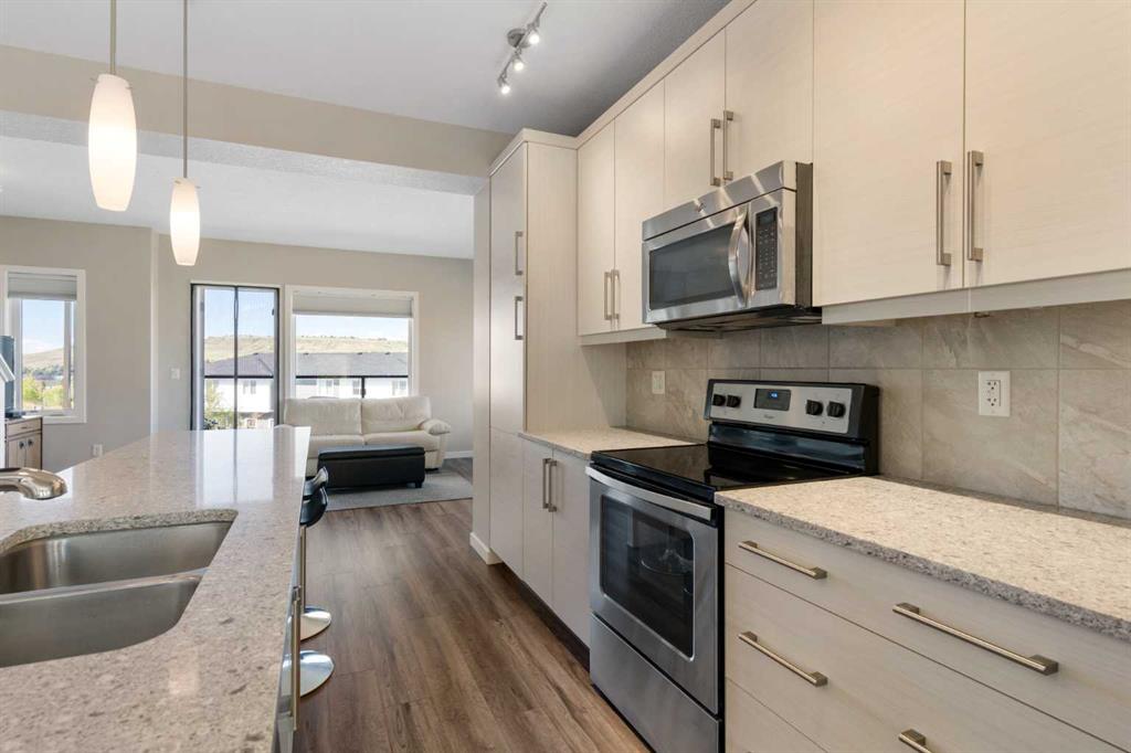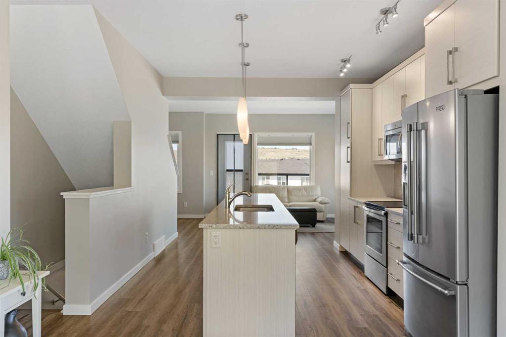 Upstairs offers 3 bedrooms and 2.5 bathrooms, creating one of the most functional layouts in the complex, with elevated views toward Cochrane. The oversized tandem garage comfortably fits two vehicles with extra room for storage.