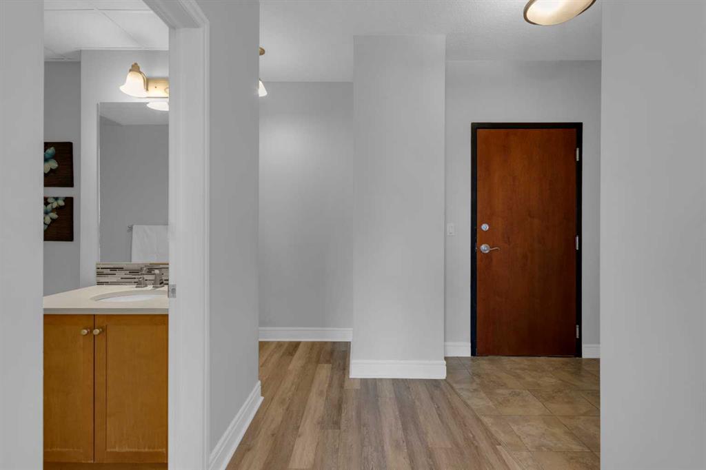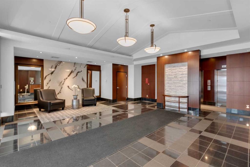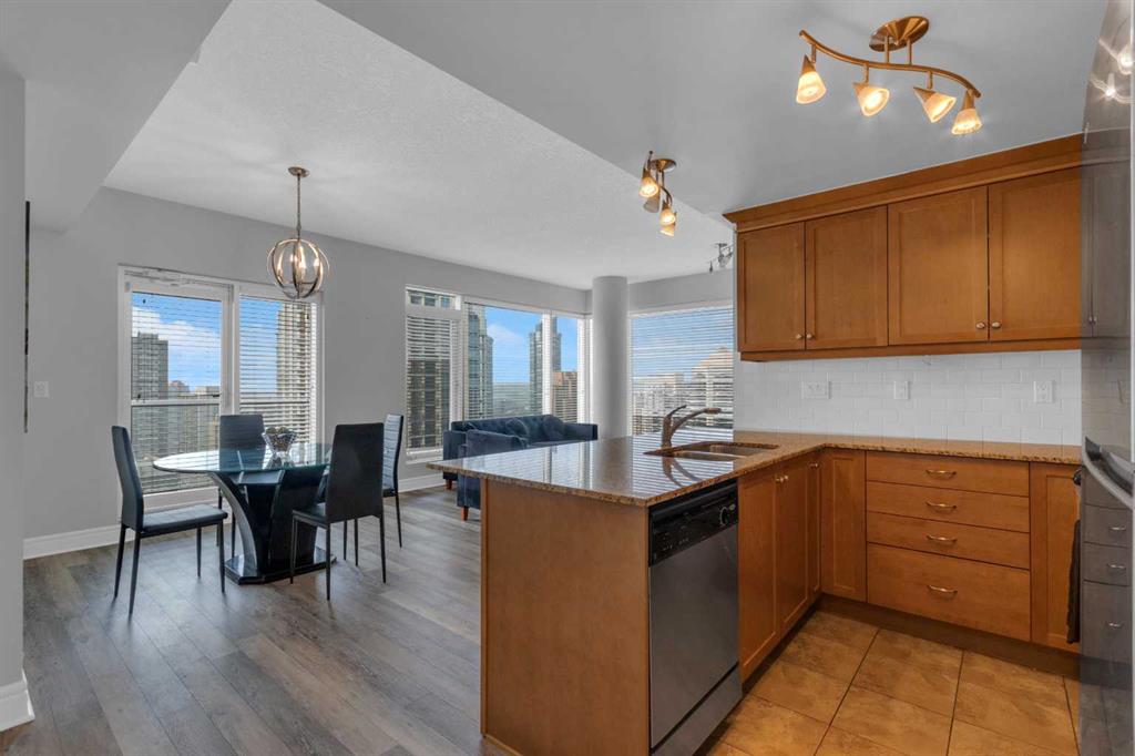 Welcome to this gorgeous 2 BEDROOM 2 BATH CORNER UNIT on the 26th floor WITH UNDERGROUND PARKING. Wait until you see the spectacular SW views of the city and even the mountains on a clear day! One of the larger units in the building with oversized primary bedroom and features newer vinyl plank flooring throughout! The kitchen features maple cabinetry accented by granite countertops, stainless steel appliances with new refrigerator, under cabinet lighting and an eating bar. The open concept living/dining area is covered in vinyl plank flooring and boasts a corner gas fireplace and access to a sunny south facing balcony with a gas line. The oversized primary bedroom has floor to ceiling windows, a 4 piece ensuite and walk-in closet while the second bedroom has a 3 piece cheater ensuite and both bathrooms have new upgraded quartz vanities. Also note an office nook, underground parking space (stall 63 conveniently located right next to the entrance), additional storage (main floor #14), insuite laundry and building amenities that include concierge service, owner\'s lounge and patio as well as visitor parking. Located in the Downtown core; close to high end shopping, all levels of transit, the river pathways, parks... All furniture is Negotiable, GREAT TURN-KEY EXECUTIVE RENTAL for INVESTORS!