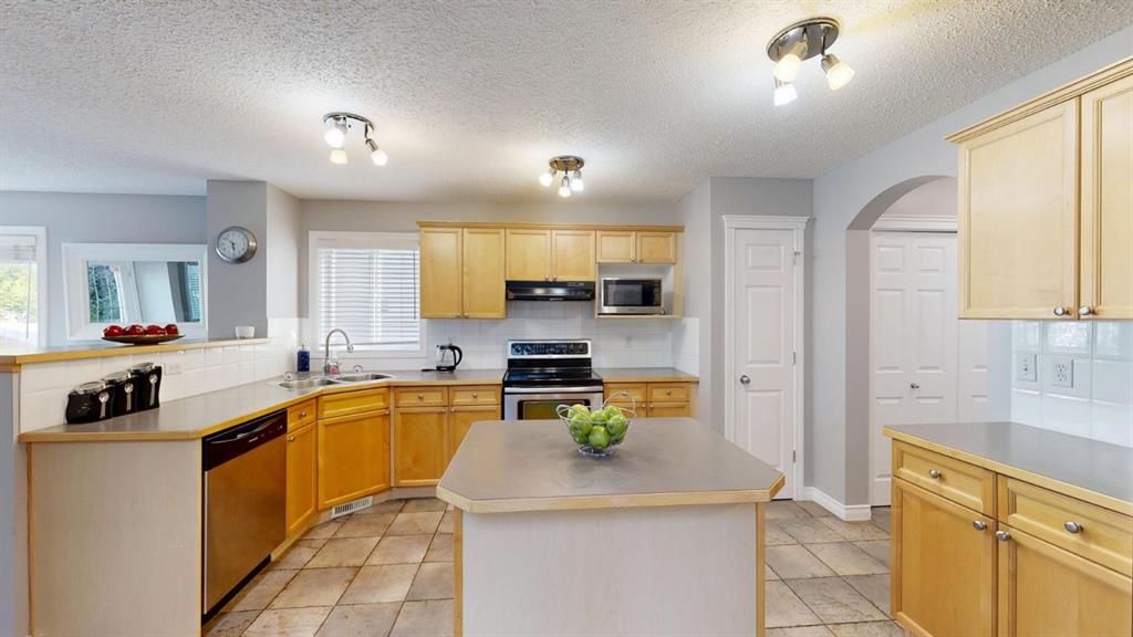The well-designed kitchen offers beautiful appliances, large island, eating bar and a sunny nook leading out to a large freshly stained deck that overlooks the immaculately landscaped yard. Upstairs you will discover a large bonus room, 3 bedrooms, including a spacious master bedroom with ceiling fan, large walk-in closet, and spa-like 4-piece ensuite with elegant lighting, tile-surround jacuzzi tub and corner glass walled shower. There is also a full 4-piece bathroom upstairs.