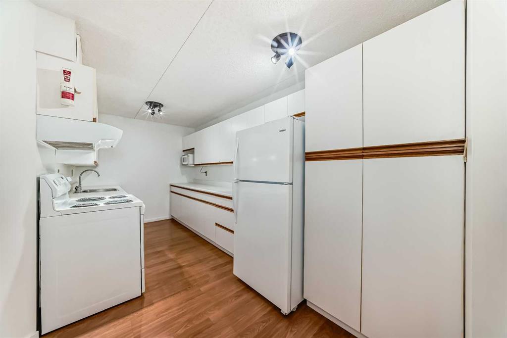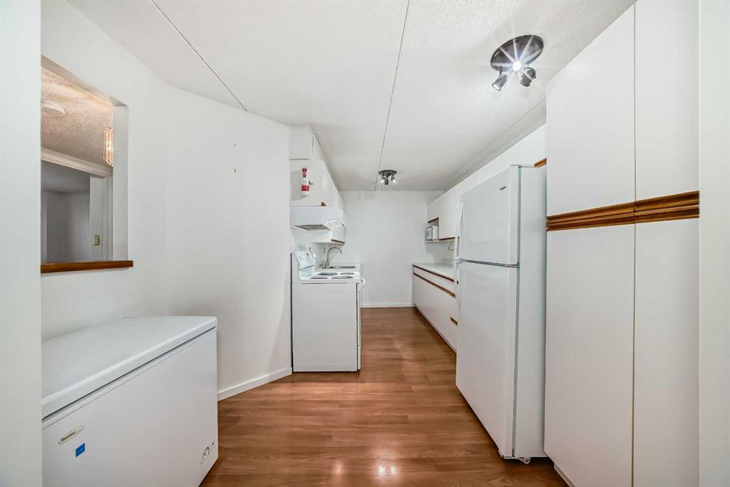 This immaculate and well-maintained home has been updated with newer laminate flooring and fresh paint. A large foyer with a walk-in Storage and Closet offers plenty of storage for coats and more. The generous dining area provides space for a good-sized table and currently accommodates a small freezer. The galley-style kitchen features white cabinets, white appliances, and ample counter space.