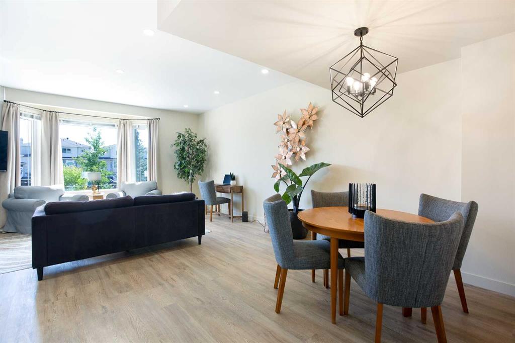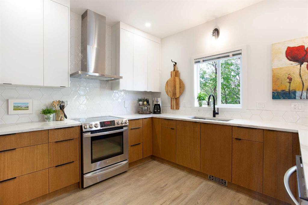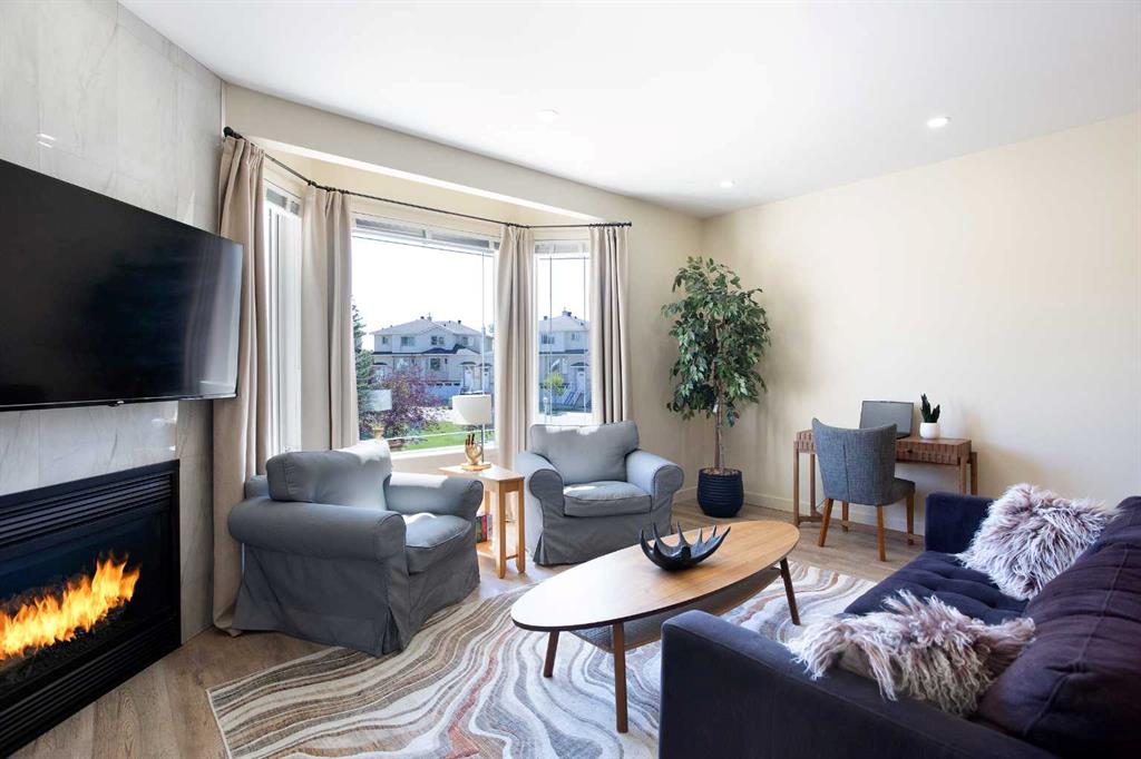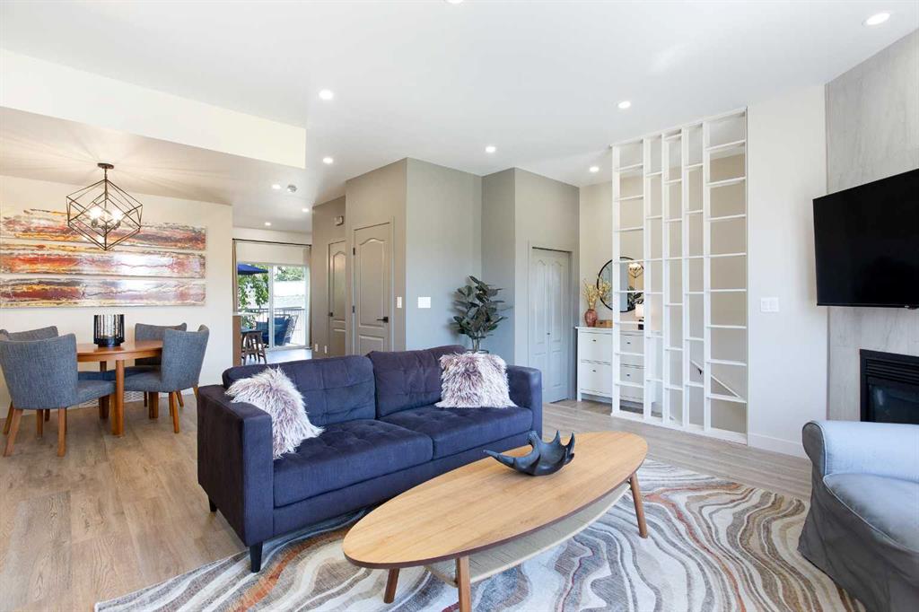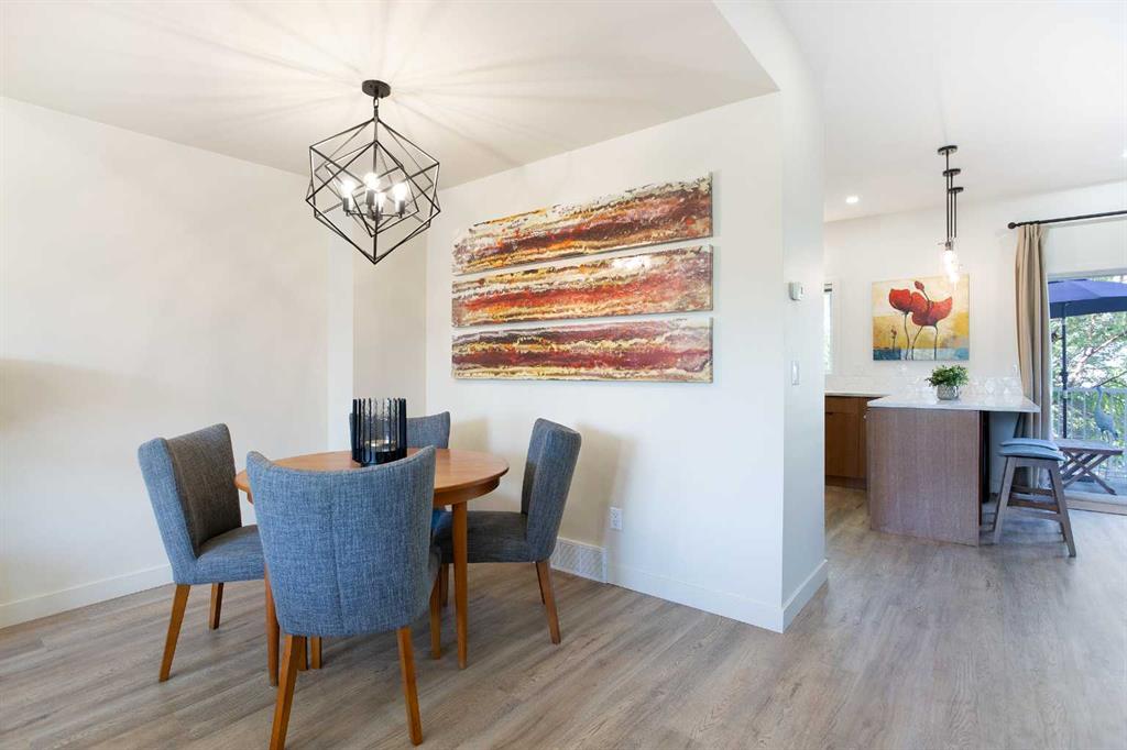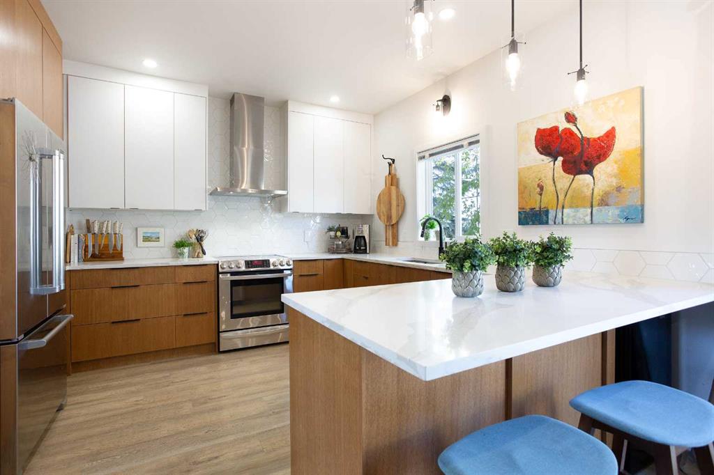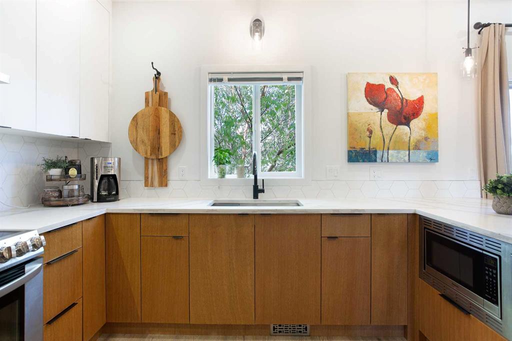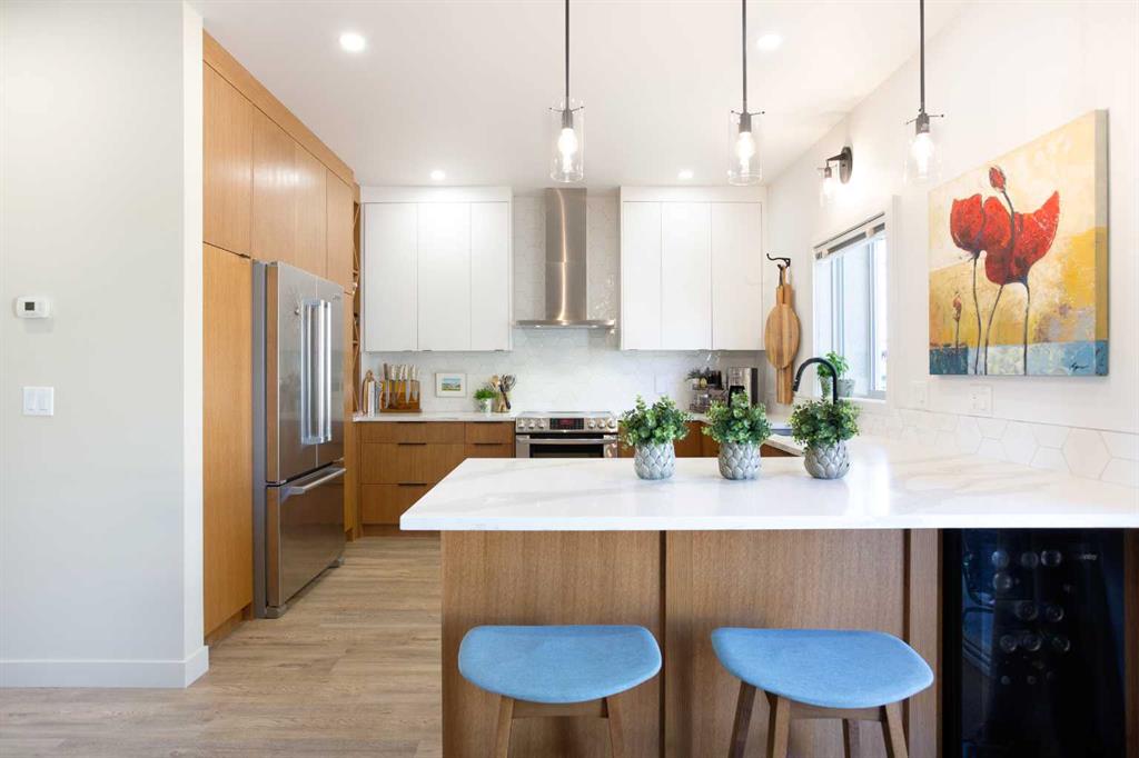 NEWLY RENOVATED | MODERN KITCHEN | Welcome home to Fairways Vistas! This spacious and newly renovated townhome offers a thoughtful blend of comfort, style, and modern design. As you step inside, a mid-century style partition offers a sneak peek into a generous living space, where a large bay window welcomes the morning sunshine and a view of the lush courtyard, while in the corner, a gas fireplace offers the promise of cozy autumn evenings. Directly adjacent, a dropped ceiling adds intimacy to the open dining area - or perhaps home office? Continue past the main floor powder room to the heart of this home: a sleek and modern kitchen, where stainless steel appliances and quartz counters are offset by the warmth of striking oak cabinetry. The highly functional layout offers ample counter space, a pantry near the range, and an oversized sink with garburator, making food prep and cooking a breeze. A large, uninterrupted peninsula with a built-in microwave, eating bar, and bar fridge is perfect for entertaining family and friends, and a nearby breakfast nook provides both a perfect spot for folks to gather for those inevitable kitchen parties and access to the large rear deck, where a gas hook-up fuels your grill and mature trees offer shade and privacy.