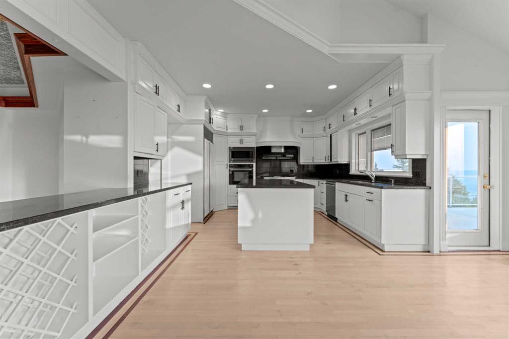 Inside, a grand Rundle Stone staircase leads to an expansive great room and a chef’s kitchen with granite counters, cherry oak cabinetry, and a large island, all designed to showcase west-facing sunsets. The main level includes a formal dining room, a primary suite with spa-inspired ensuite, oversized walk-in closet, and private den/nursery, plus a second bedroom with backyard access and a library/den.