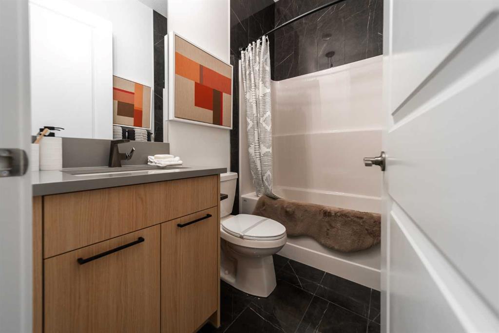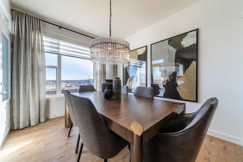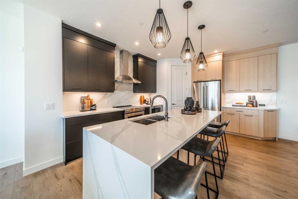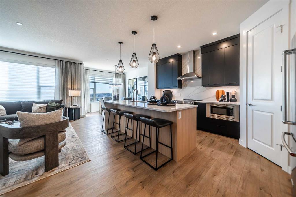 SHOW HOME FOR SALE! The beautiful and thoughtfully designed Robson 24 show home is situated on an oversized conventional pie lot in the desirable community of Livingston and it is now for sale! At nearly 3,000 square feet of space, this home features 3 living areas, 5 bedrooms, 4 bathrooms, and 2 flex spaces - making this the perfect family home and ideal for those wanting a layout designed for multi-generational living. The bright and open main level features an impressive curved staircase that offers a timeless design aesthetic and seamlessly integrates into the design. The expansive kitchen features two-tone cabinetry, a waterfall quartz island and quartz slab backsplash, chimney hood fan, built-in microwave and large pantry. The kitchen overlooks both the living and dining areas - making this the ideal space for entertaining with a wall of windows that flood the main level with natural light all day long. A back entrance leads to the rear deck that overlooks the fully landscaped private backyard. The main level is complete with a bedroom and full bathroom - ideal for those with mobility issues or for multi-generational living. Iron spindle railing leads to the upper level where you\'re greeted by a central bonus room that separates the primary suite from the secondary bedrooms for added privacy. Vaulted ceilings in the primary bedroom create an open and bright space with an expansive walk-in closet and the 5pc ensuite you\'ve dreamed of! A fully tiled shower with 10mm glass surround, soaker tub with tiled feature wall and dual sinks complete the owner\'s oasis. Two more bedrooms and a 5pc bathroom with dual sinks and a separate laundry room with built-in cabinetry and quartz countertop complete the upper level. The professionally developed basement has large windows providing natural light and features a large rec room, perfect for a TV area, a flex space that is ideal for children\'s play area, a home office, bedroom and full bathroom! When purchasing a show home, you don\'t just get a beautiful home, you get all of the added design touches and upgrades you want including custom window treatments, wallpaper feature walls, central A/C, completed landscaping and more. This brand new home is move-in ready and includes Alberta New Home Warranty - allowing you to purchase with peace of mind. This is your opportunity to purchase a one-of-a-kind home that has been beautifully designed inside and out!