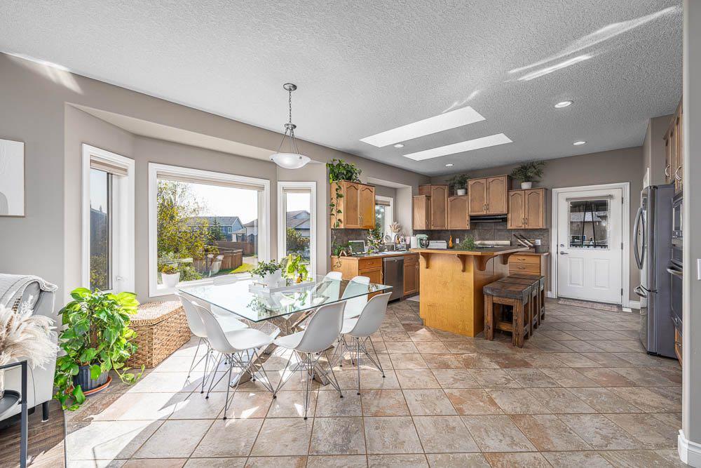 The home is filled with natural light, thanks to its large windows and several skylights. The open-concept maple kitchen includes a big island and a walk-in pantry, making it both functional and stylish. The dining area is spacious—perfect for hosting—and the cozy living room features a stunning fireplace surrounded by custom built-in shelves.