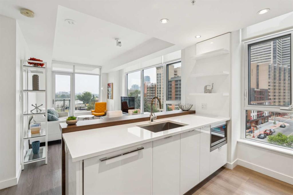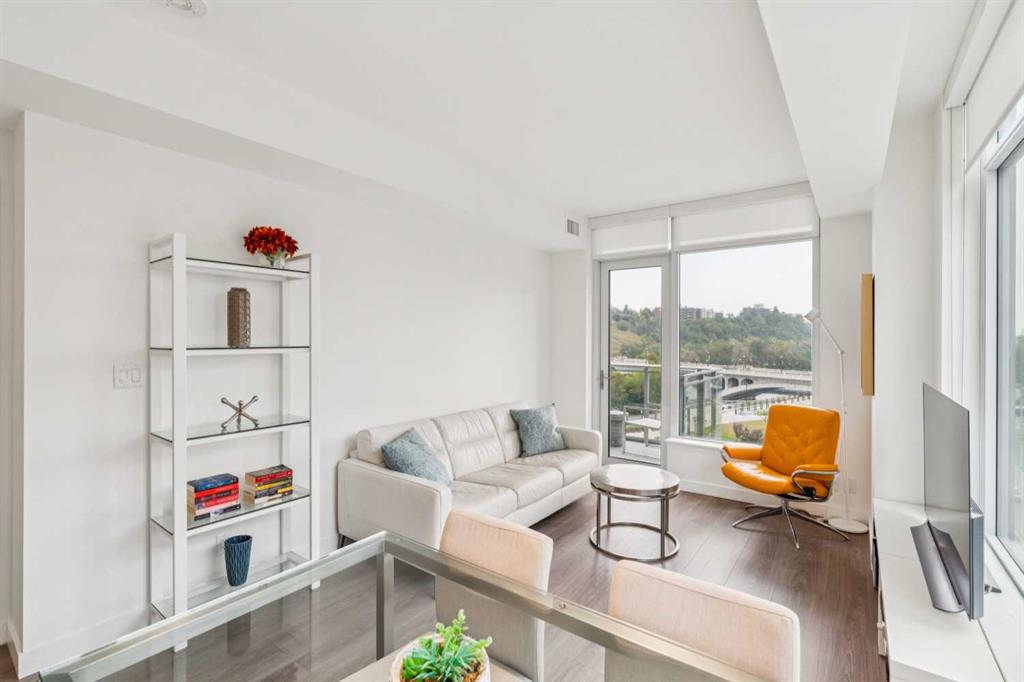 Floor-to-ceiling windows wrap the southeast exposure, filling the home with natural light and framing unparalleled views of the Bow River, Centre Street Bridge, Sien Lok Park, and the Bow Tower.