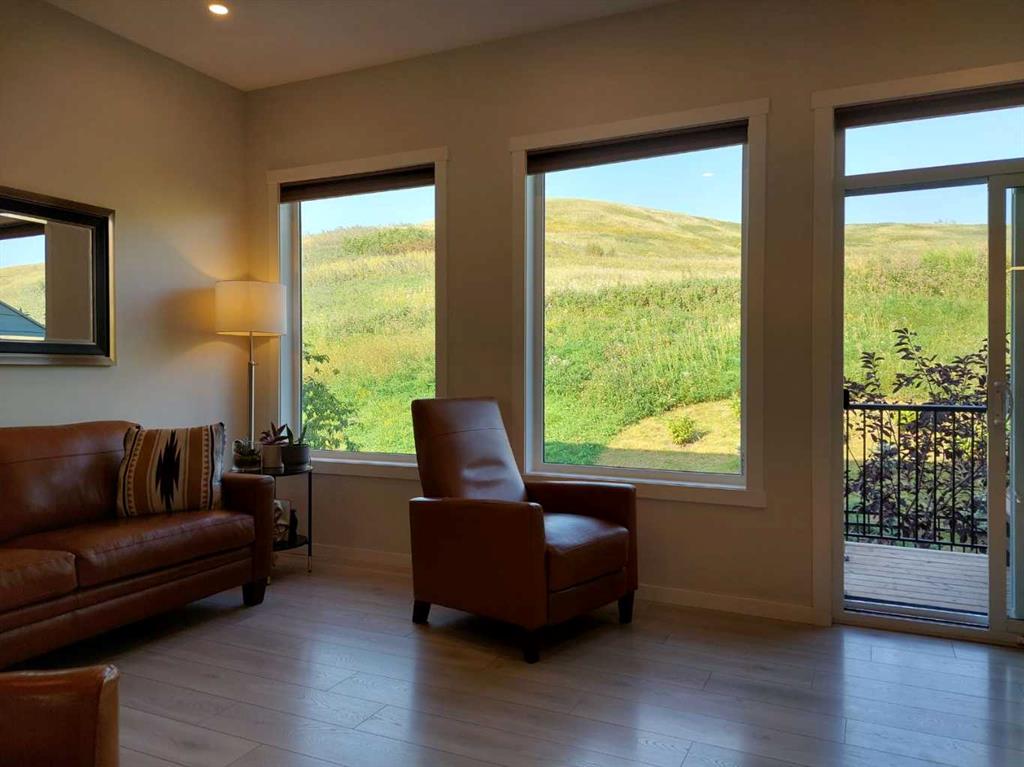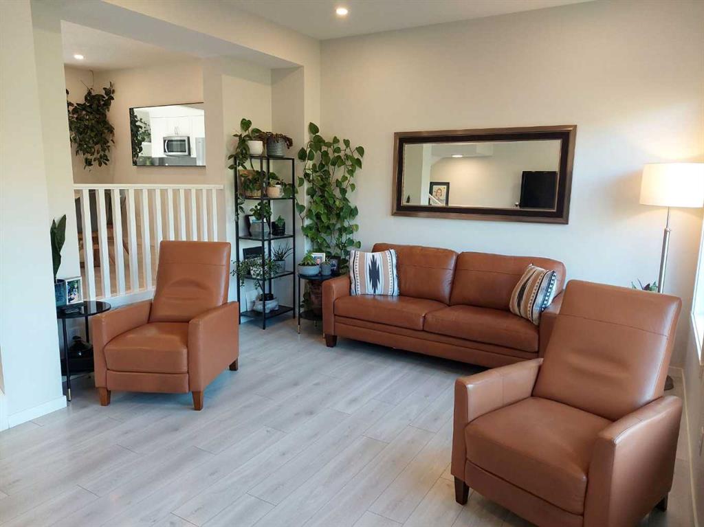 Click brochure link for more details** Gorgeous Cranston Riverstone townhome backing onto the Cranston Enscarpment. Beautiful private backyard oasis with year round views of nature. This townhome has an attached garage with numerous upgrades including tiled entrance and bathrooms, luxury vinyl flooring, lighting and custom blinds throughout, natural gas range and stainless steel appliances. Open railings throughout provide great natural lighting for all your plants year round. Central air conditioning and an additional deeded parking stall for your extra vehicle. Pet friendly community offers great access to the Bow River pathways and Cranston community amenities. Quick access to Stoney Trail, Deerfoot Trail, Seton shopping district, dining, shopping, SHC hospital and Brookfield YMCA. Unfinished basement has great storage with rough-ins for third bedroom development (pending permit approval).