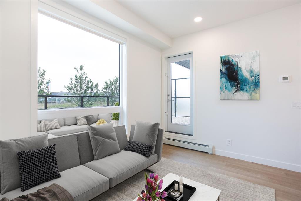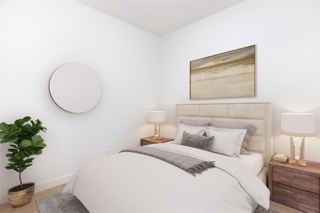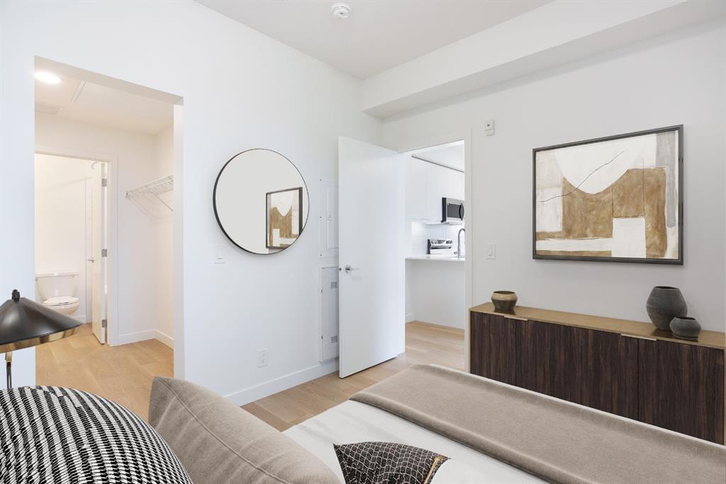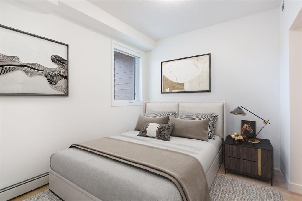 This thoughtfully designed home offers 590 sq. ft. of contemporary living space, featuring a modern kitchen with an eating bar, a bright open-concept layout, and a spacious private deck—perfect for relaxing or entertaining outdoors. The primary bedroom includes a walk-through closet that leads into a private 4-piece ensuite, while the additional bedroom has easy access to the 3-piece main bathroom.