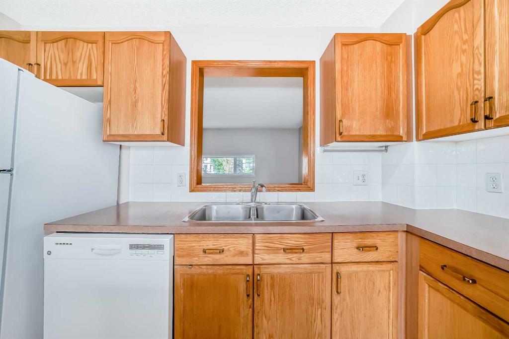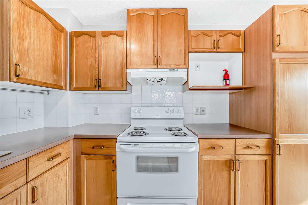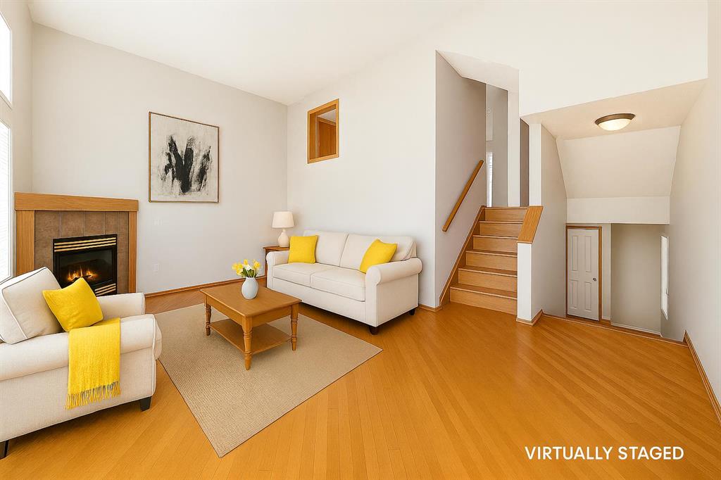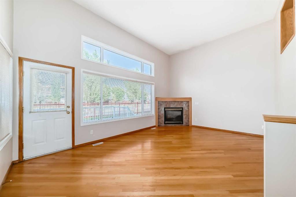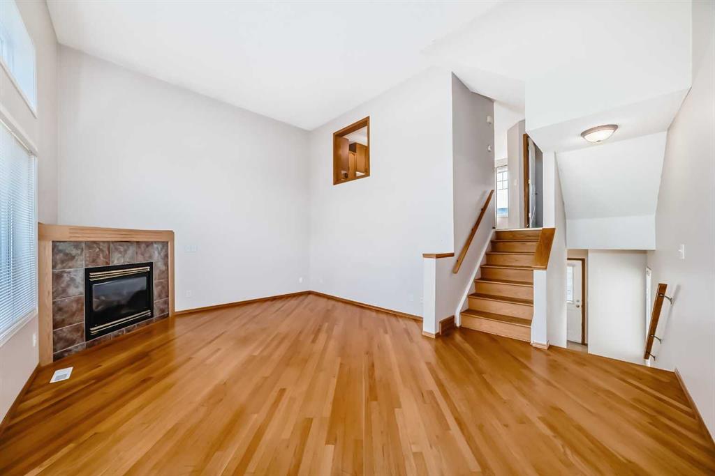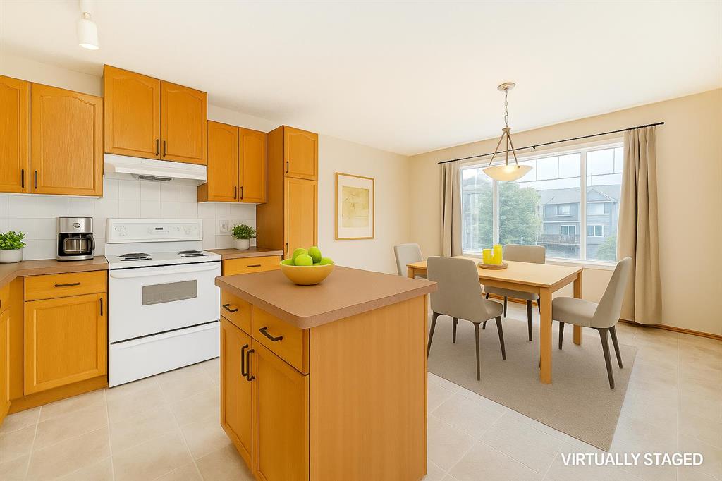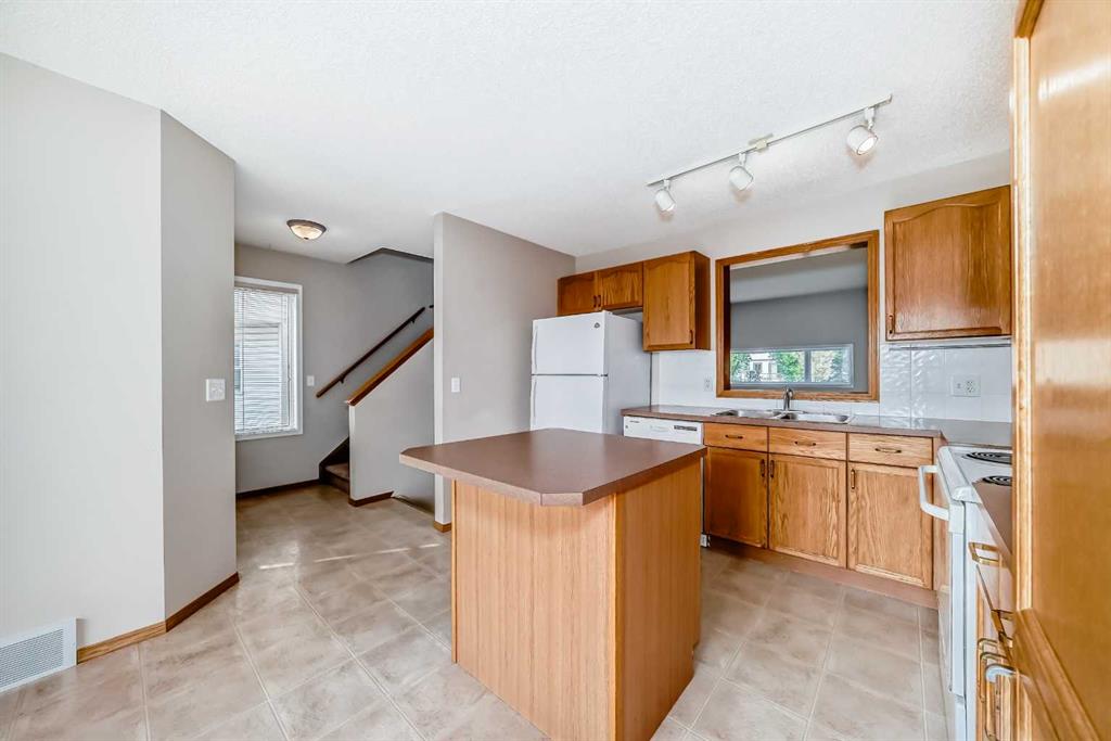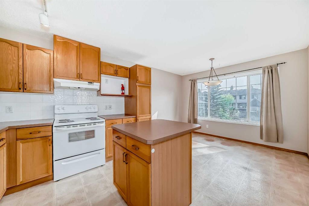 Priced to sell—rare opportunity to own a 3-bedroom end-unit townhouse with single attached garage in desirable Rocky Ridge for under $430K! Mostly original finishes and very clean, ready for your personal updates. Oak hardwood floors throughout the living room, stairs, and all bedrooms. Bright living room offers a corner gas fireplace, large window, and access to the back deck. Kitchen features white appliances, an island, and a spacious dining nook plus a convenient 2-pc powder room. Upstairs are three good-sized bedrooms and a 4-pc main bath, with a large utility/laundry/storage area down. Close to transit, parks, and Ranch House Lake.